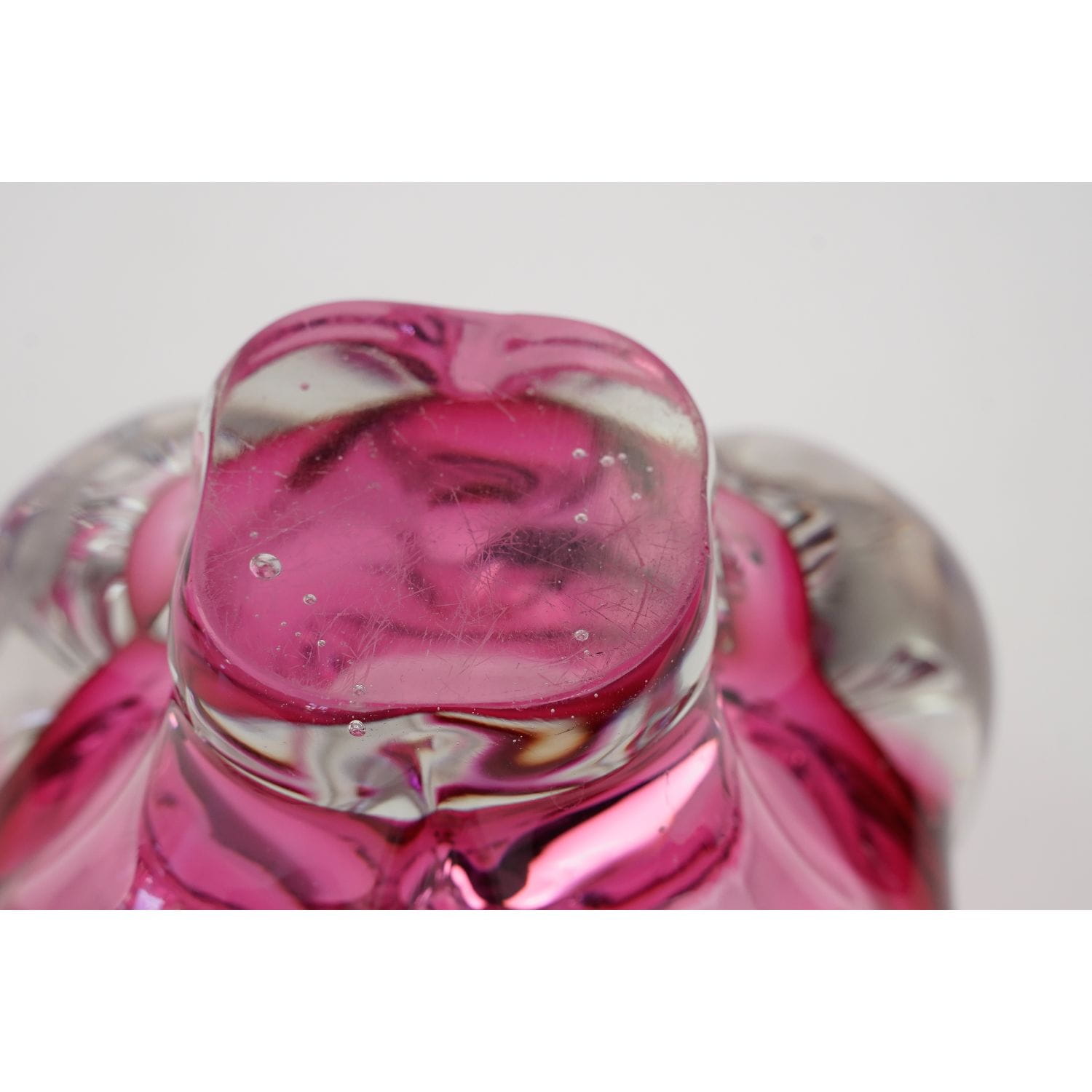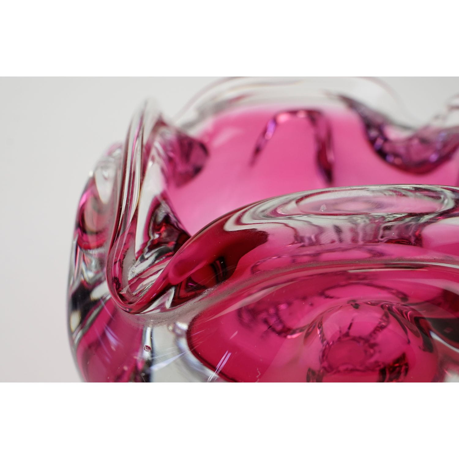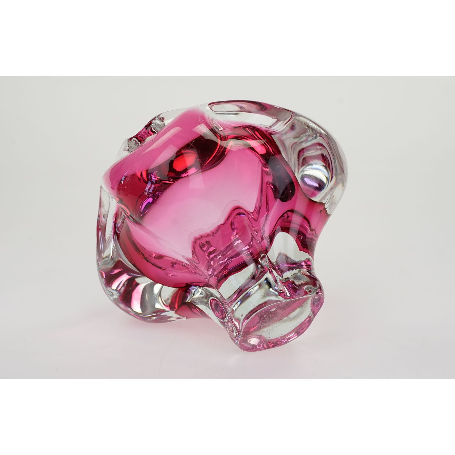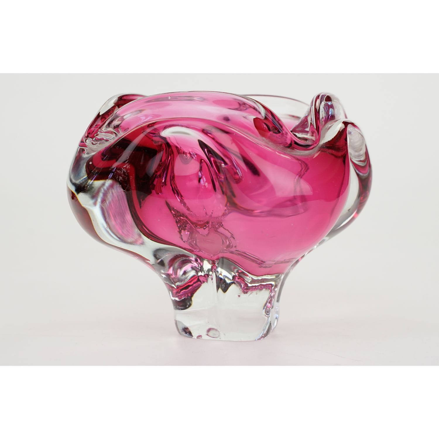 Szkło artystyczne. Pochodzi z huty szkła Chřibská, wykonana według projektu prof. Josefa Michala Hospodki. Numer katalogowy to 155/3/10. Świetny przykład czeskiego wzornictwa z lat 50/60-tych XX wieku, charakteryzujący się organiczną formą i interesującą, malinową barwą, podstawa bezbarwna. Zadziwiająco dobrze wyważony.