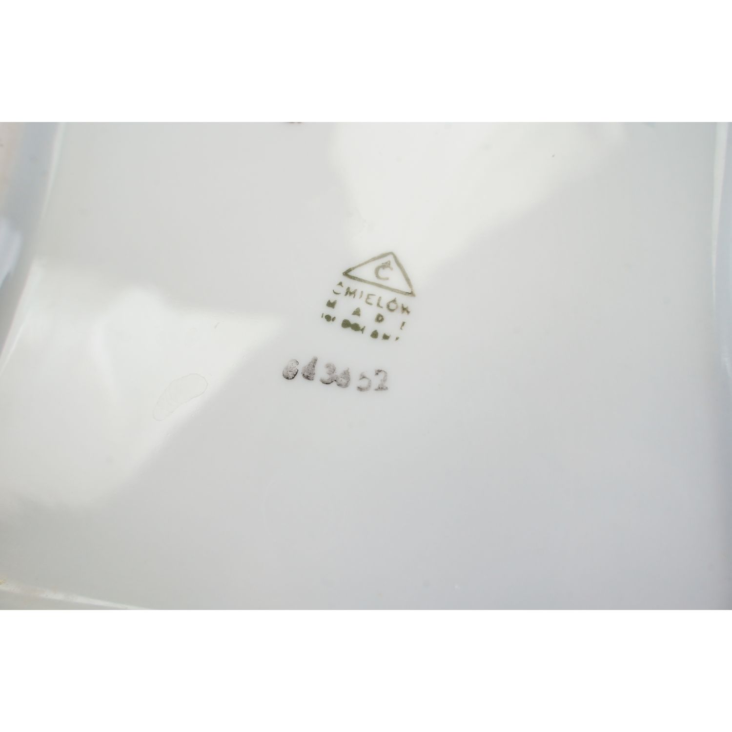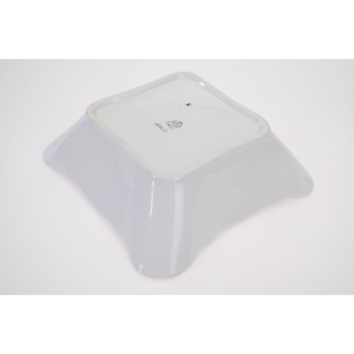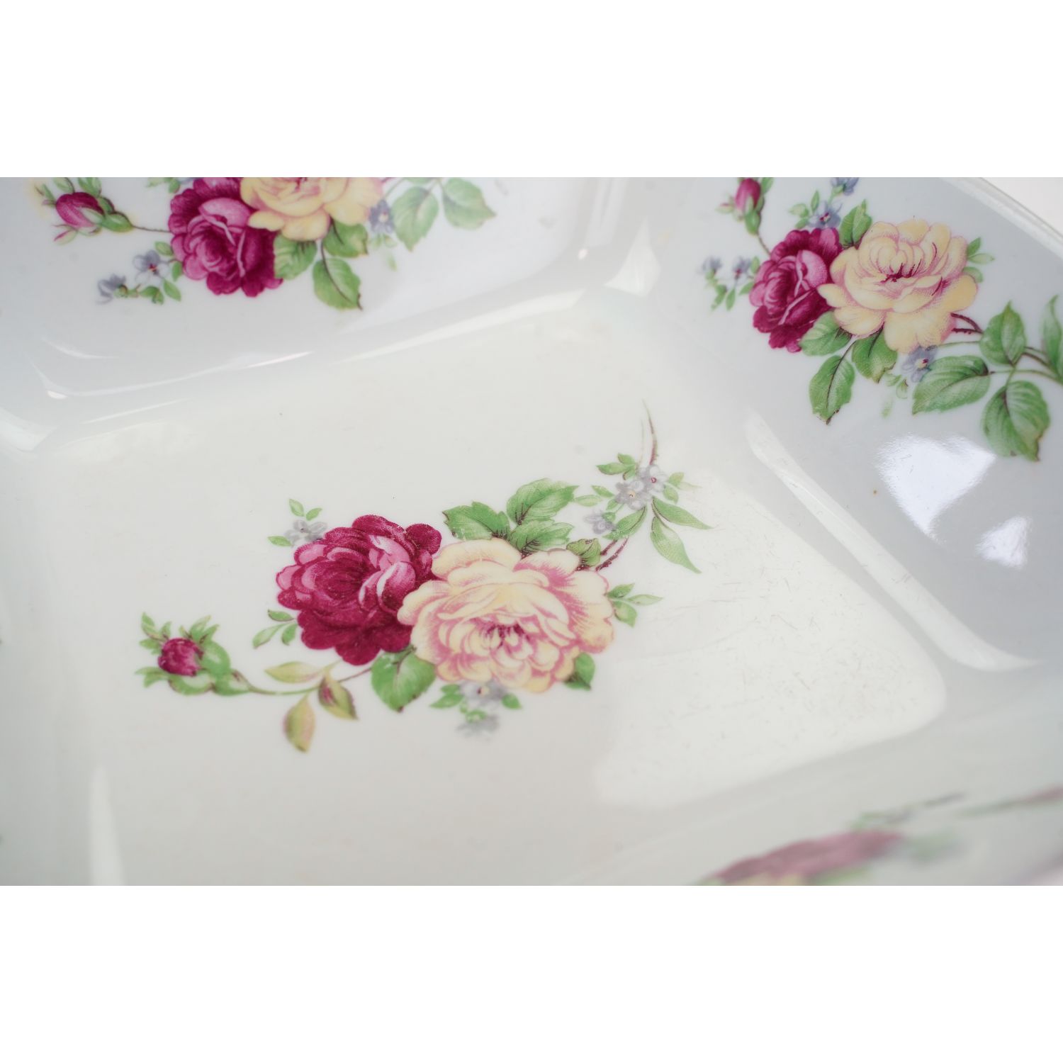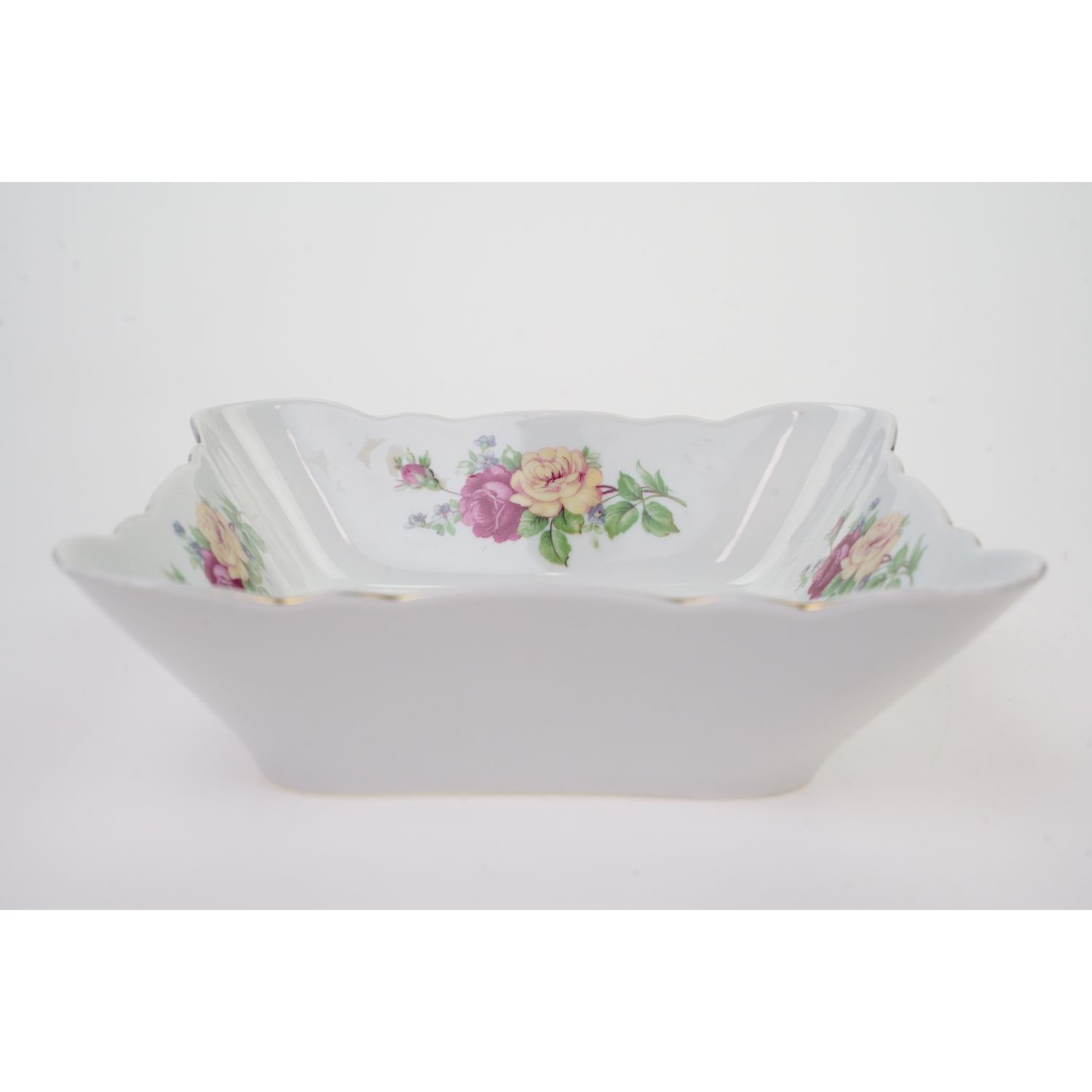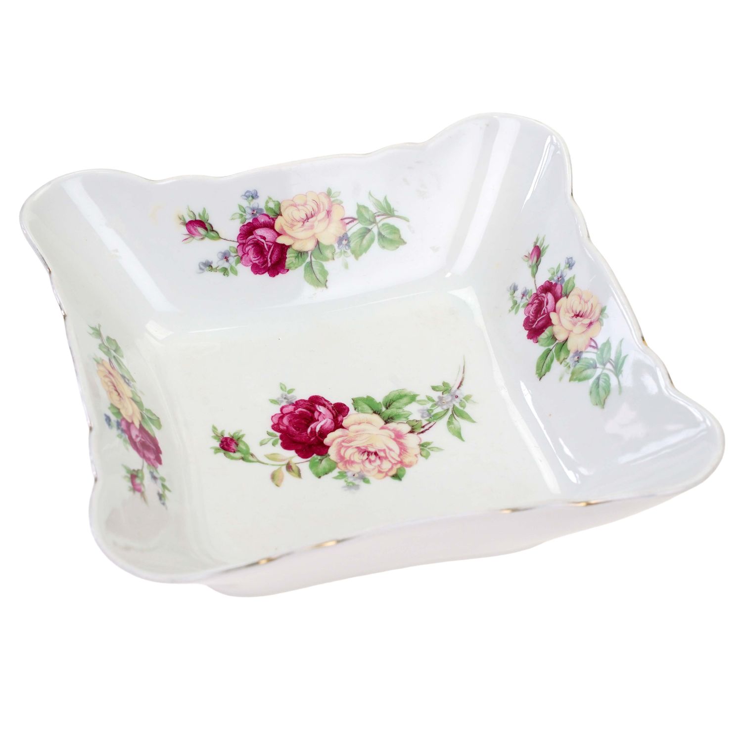 Pochodzi z Ćmielowa, fason Feston. Wykonana z solidnej porcelany, czworoboczna z wyodrębnionymi narożnikami, o prostych rozszerzonych na zewnątrz ściankach. Linia brzegowa falowana. Na ściankach i na lustrze różowe i żółte róże. Rant kiedyś złocony, dzisiaj śladowe ilości złoceń.