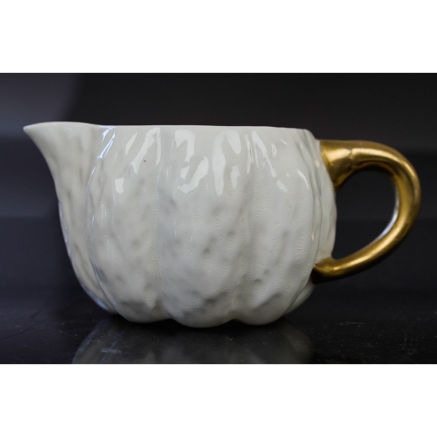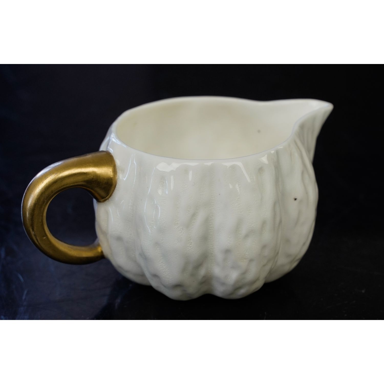 Pochodzi z Anglii z Coalport Porcelain Works John Rose & Co Coalport China Ltd. Sygnowany znakiem stosowanym od 1891 roku. Porcelana w odcieniu bieli, delikatna, kanelowana o porowatej fakturze i kształcie dyni. Uszko pokryte w całości złotem.