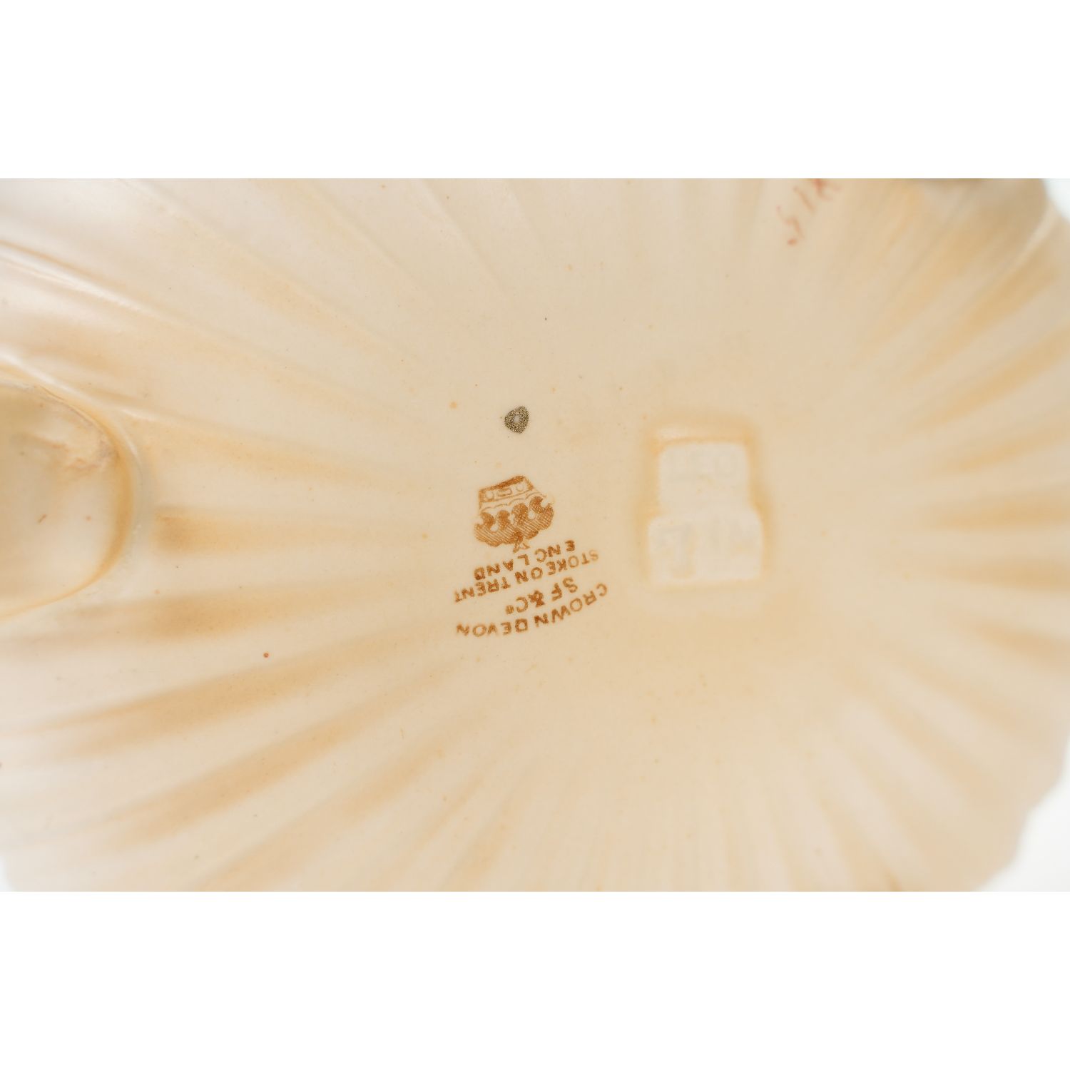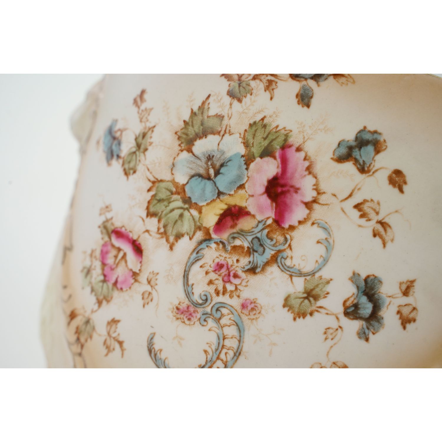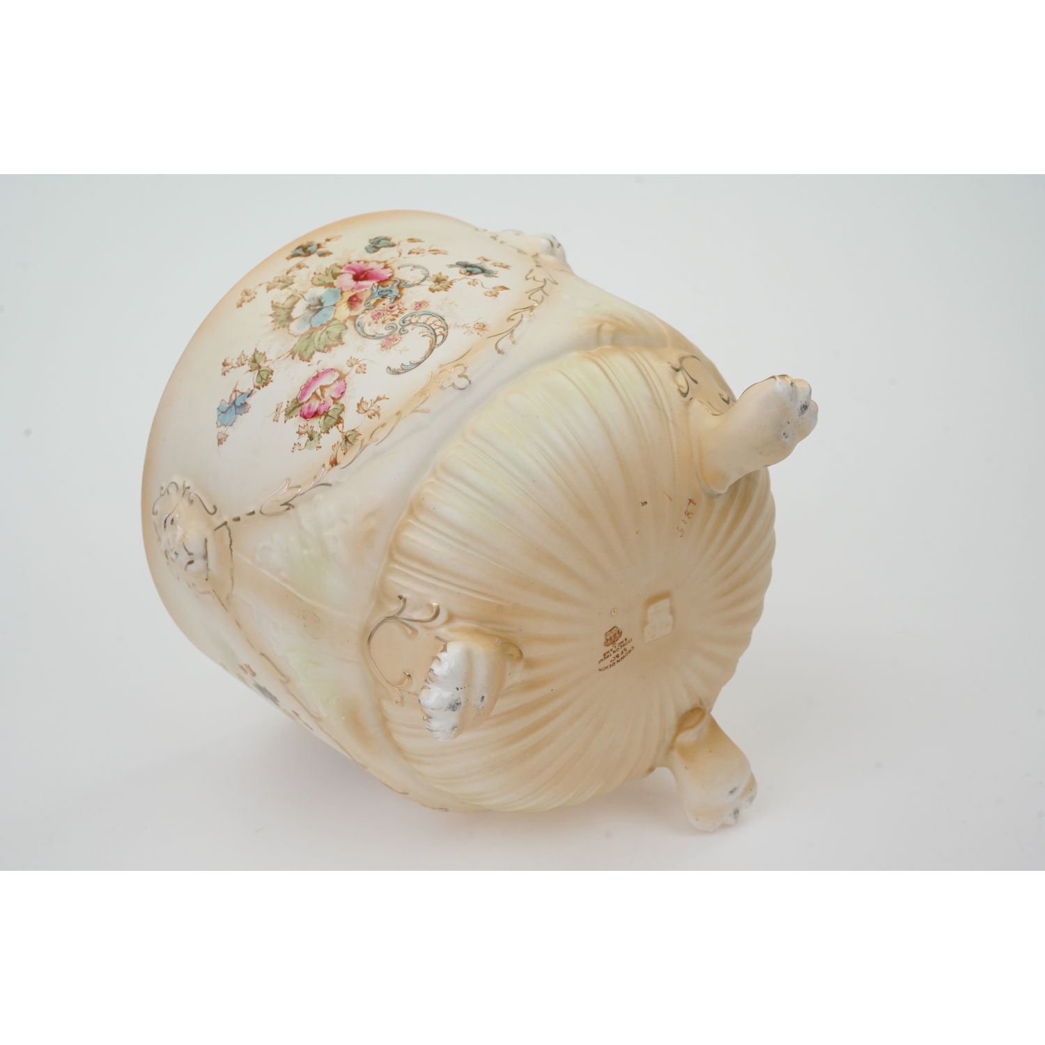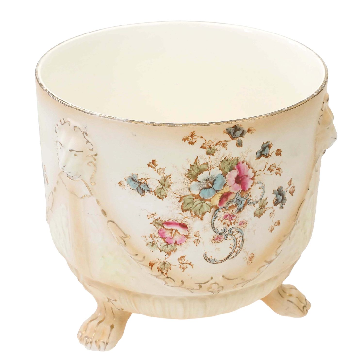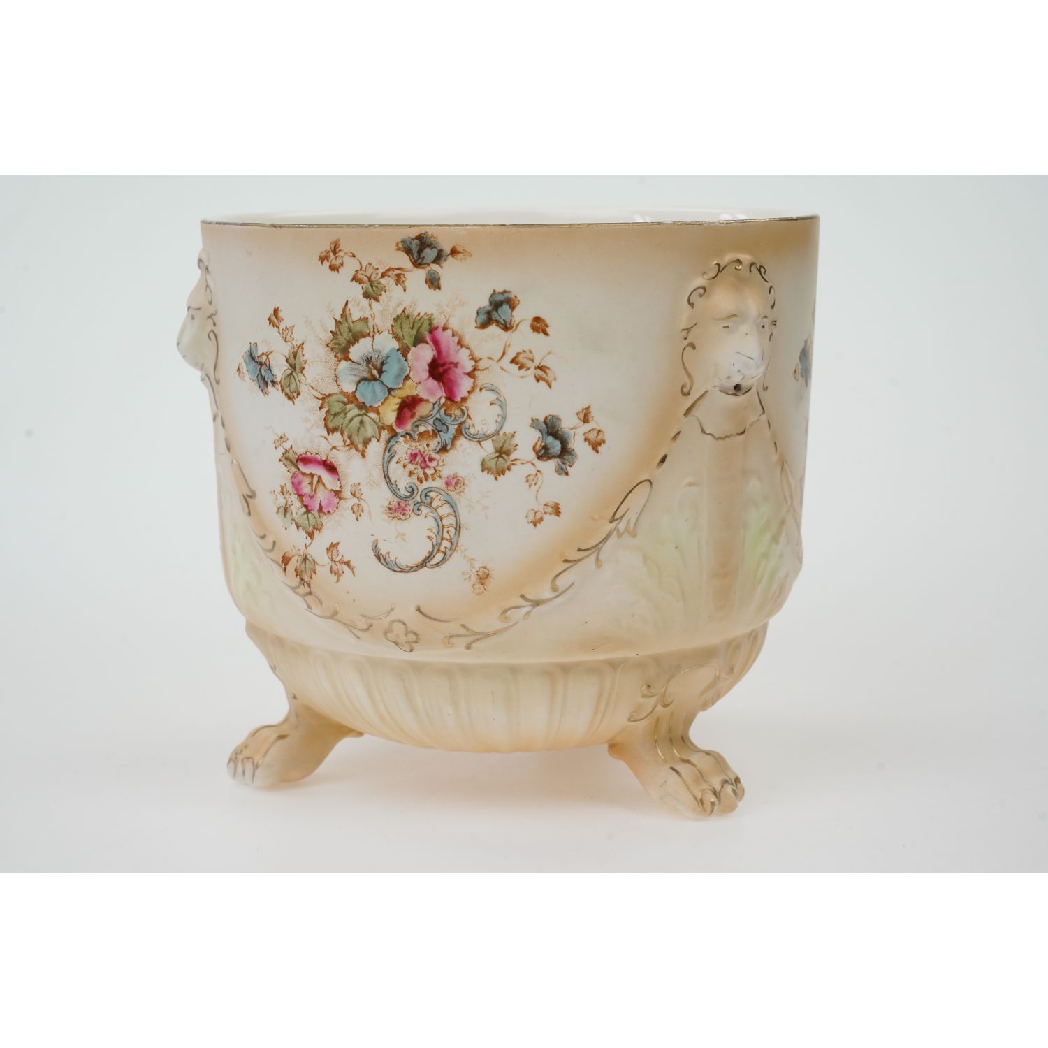 S Fielding & Co (Ltd) to producent wyrobów fajansowych i majoliki w Railway Pottery (przemianowanej na Devon Pottery w 1912 roku). Głębokie naczynie osadzone na trzech lwich łapach. Nad każdą z nich umieszczono głowę lwa trzymającą w paszczy girlandę laurowych liści. Pod lwimi łapami reliefy przedstawiające liście akantu. Całość w kolorze kremowo-żółtawej. Z trzech stron barwne bukiety kwiatów. Dekoracje podkreślone złoceniami. Wyjątkowy przedmiot!