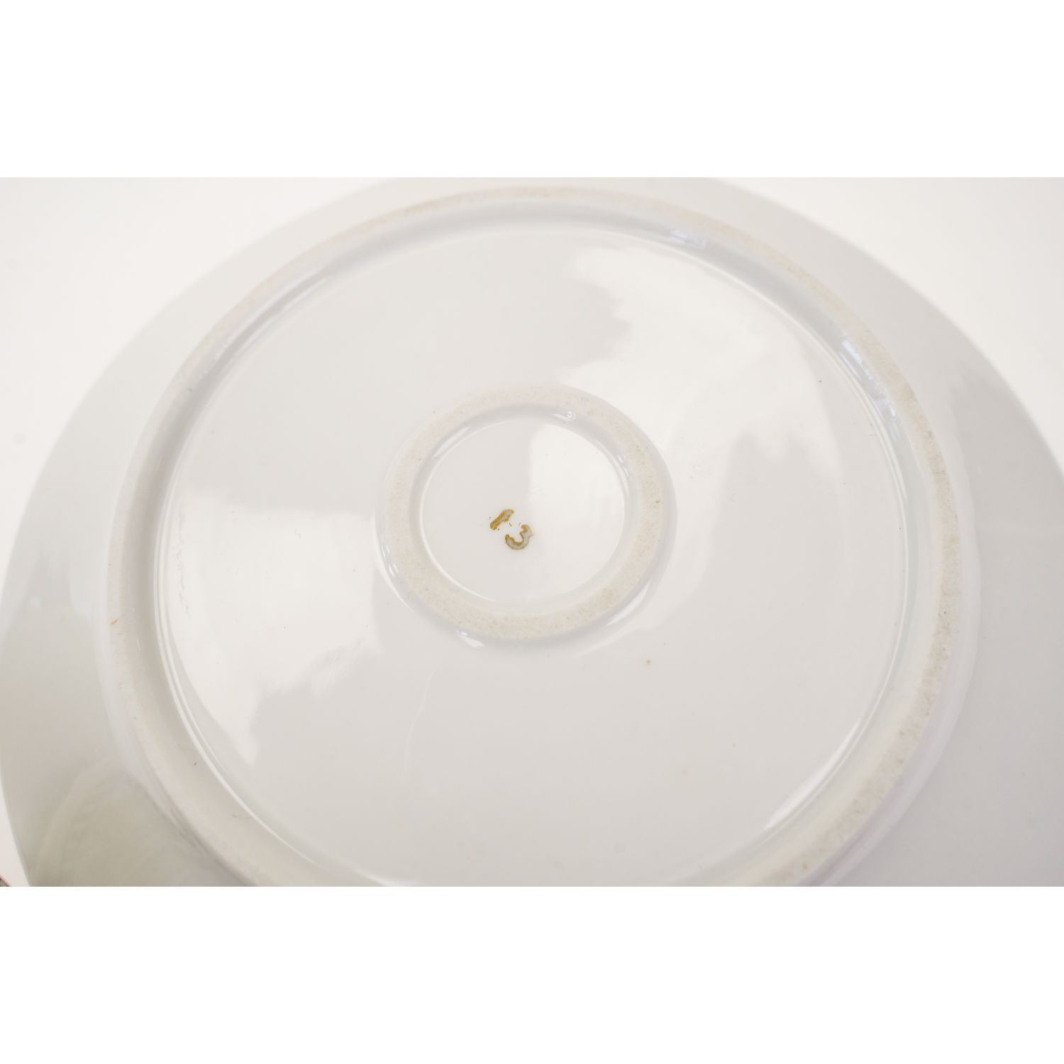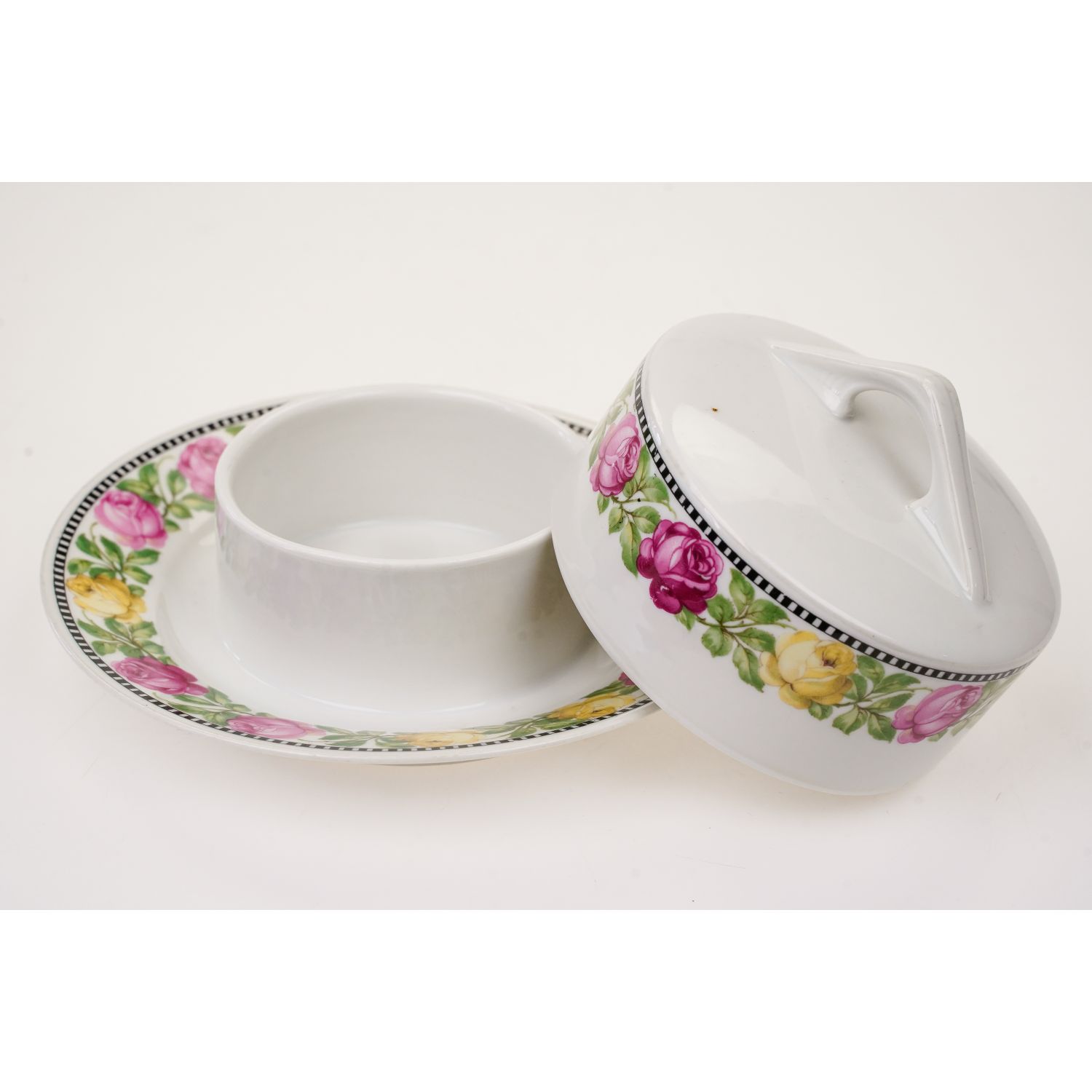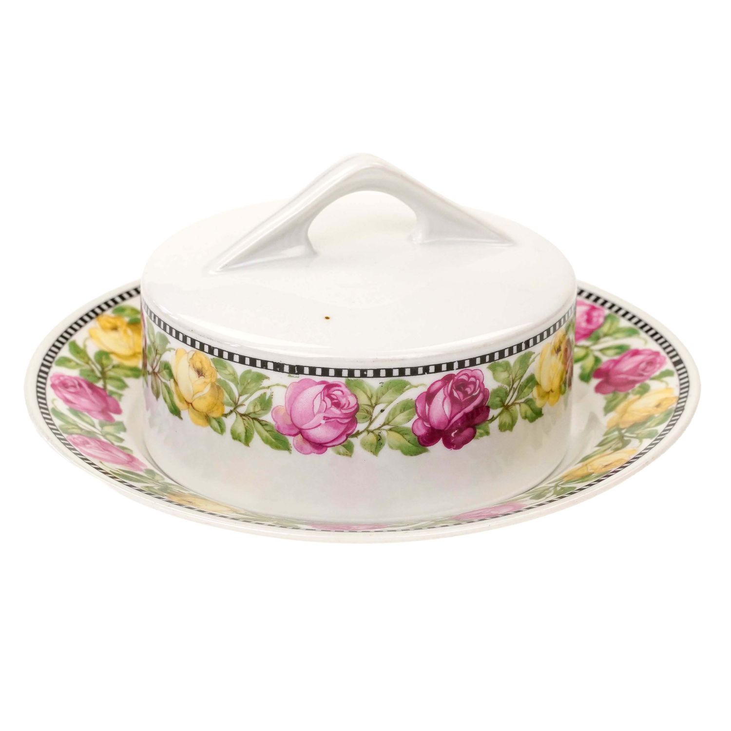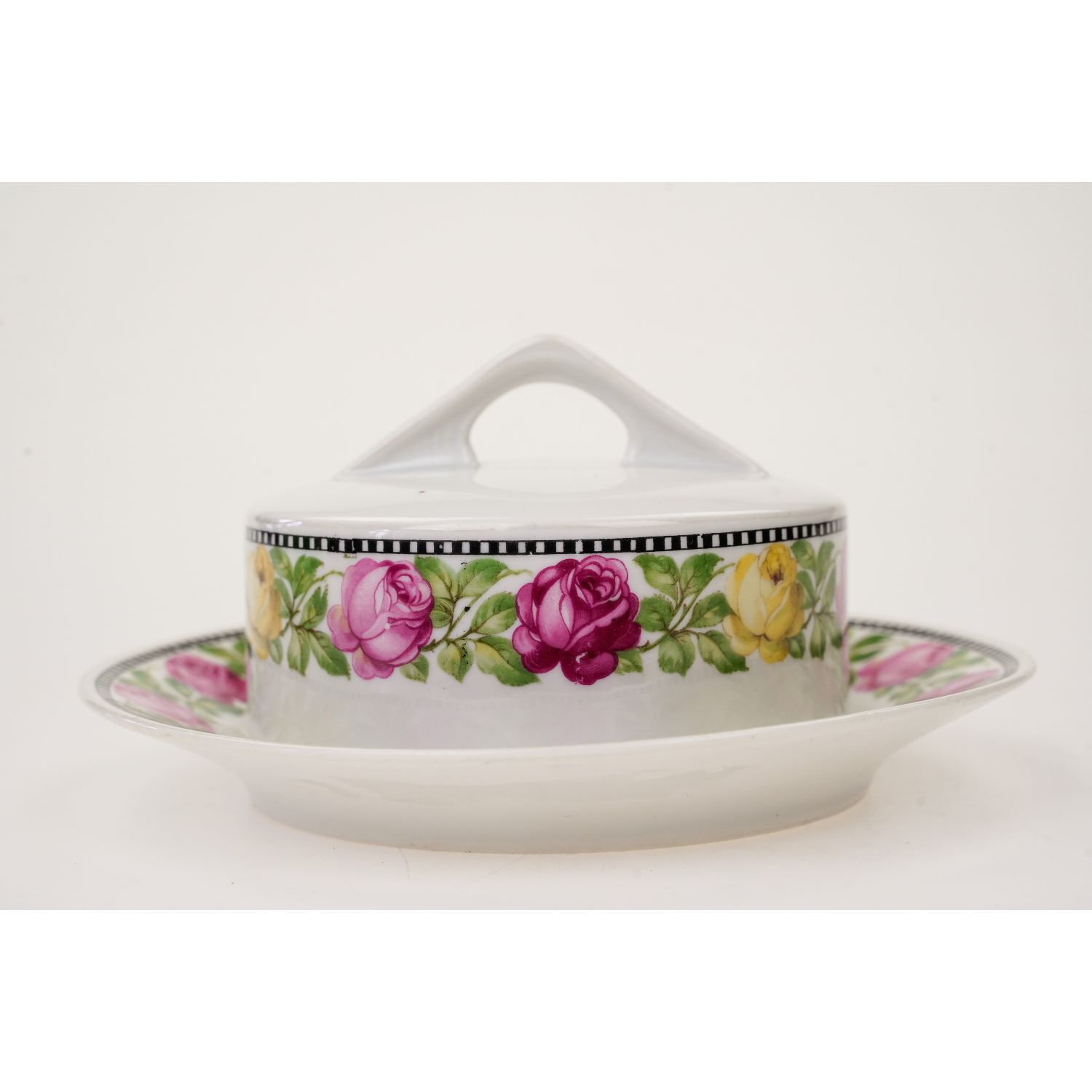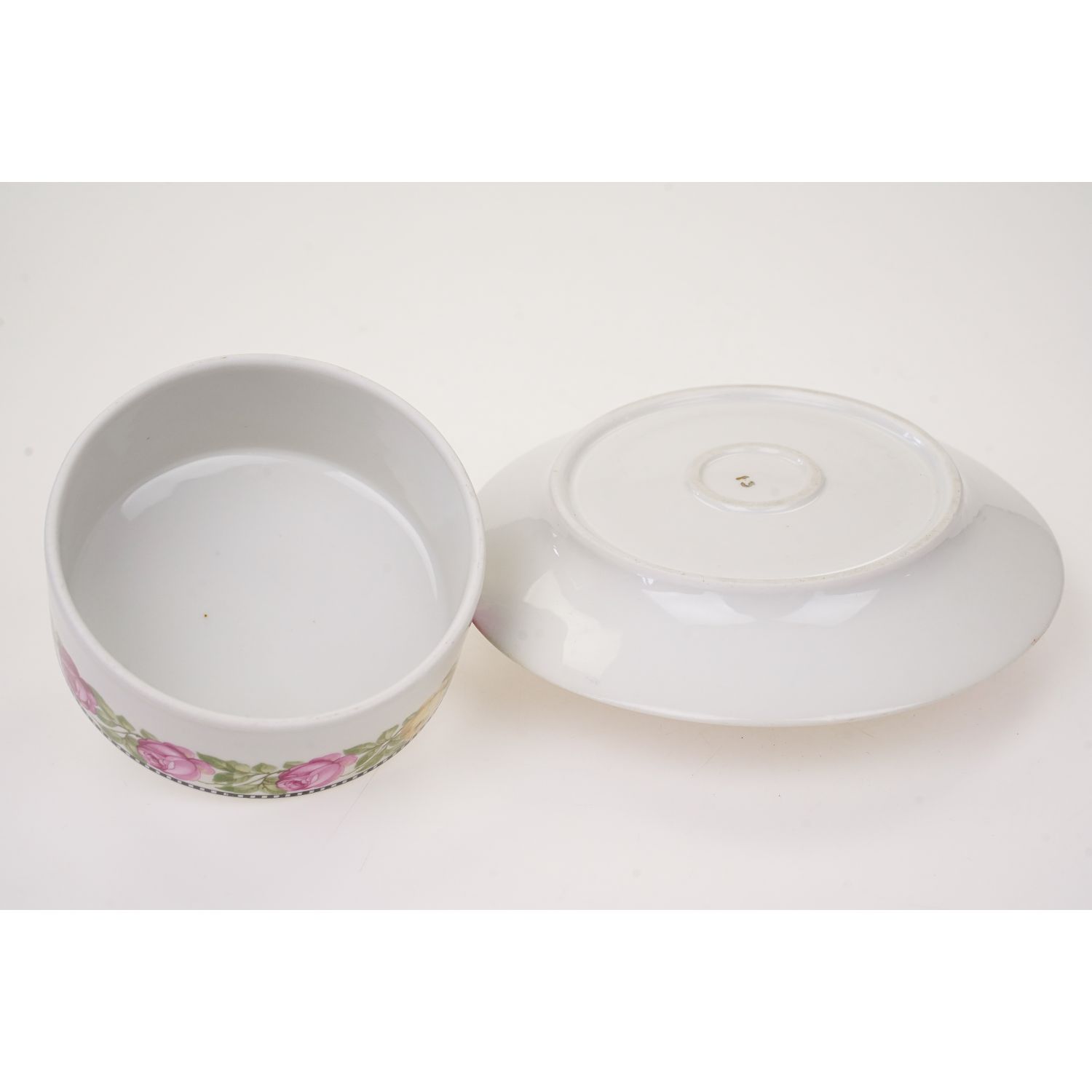 Sygnowana jedynie numerycznie. Podstawa i pokrywa z szeroką różaną bordiurą w towarzystwie czarnego szlaczka. Porcelana w odcieniu bieli.