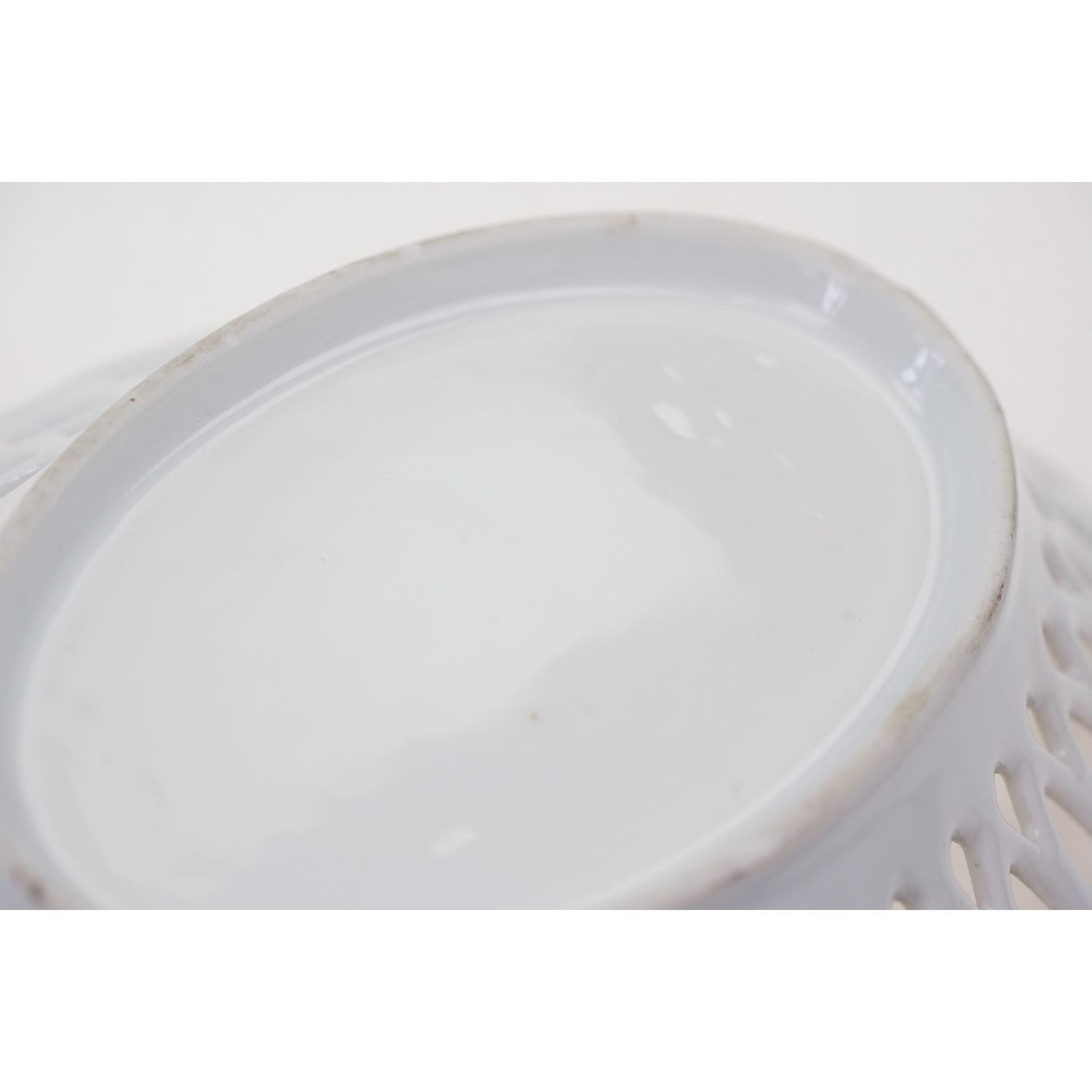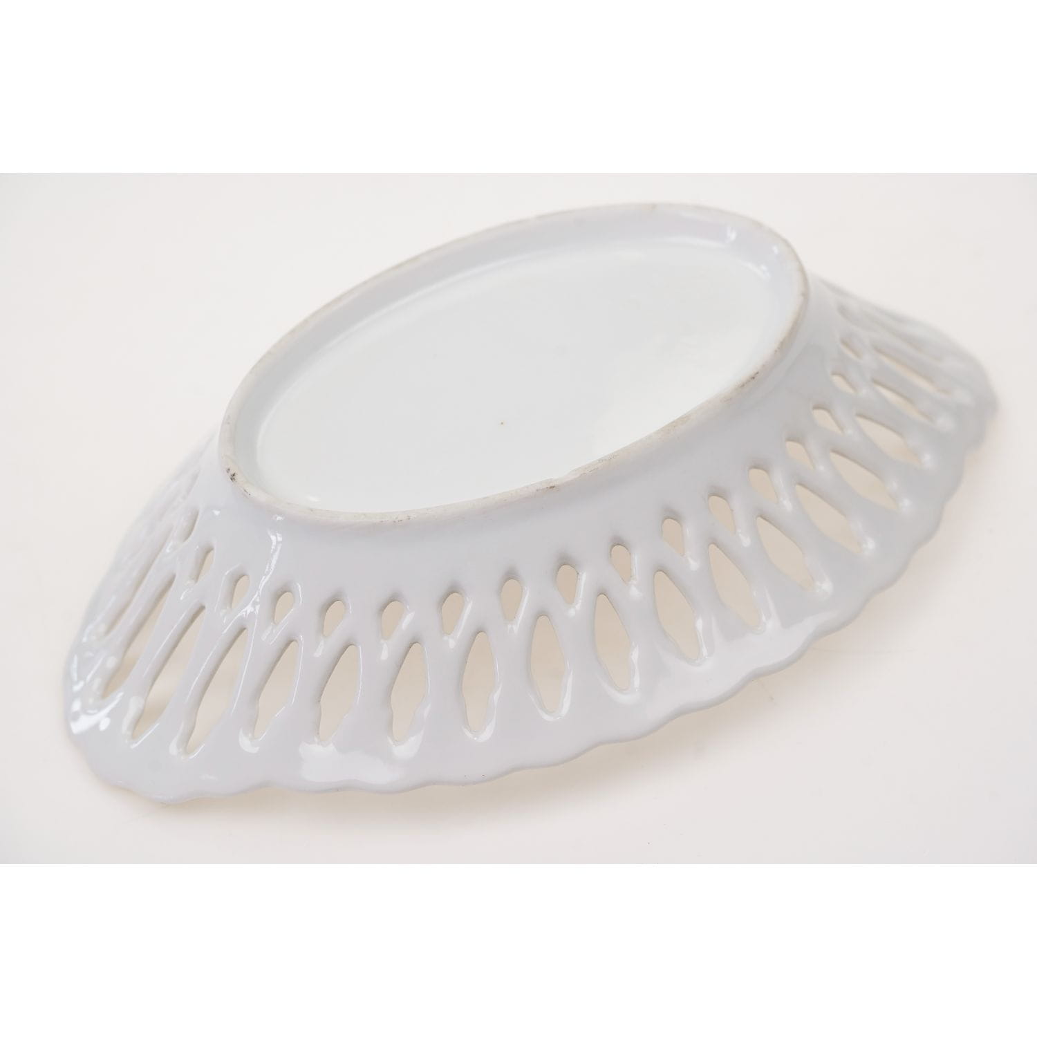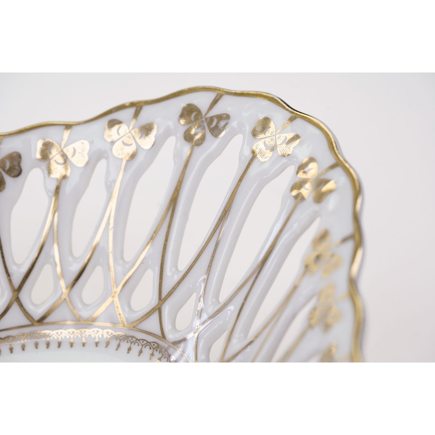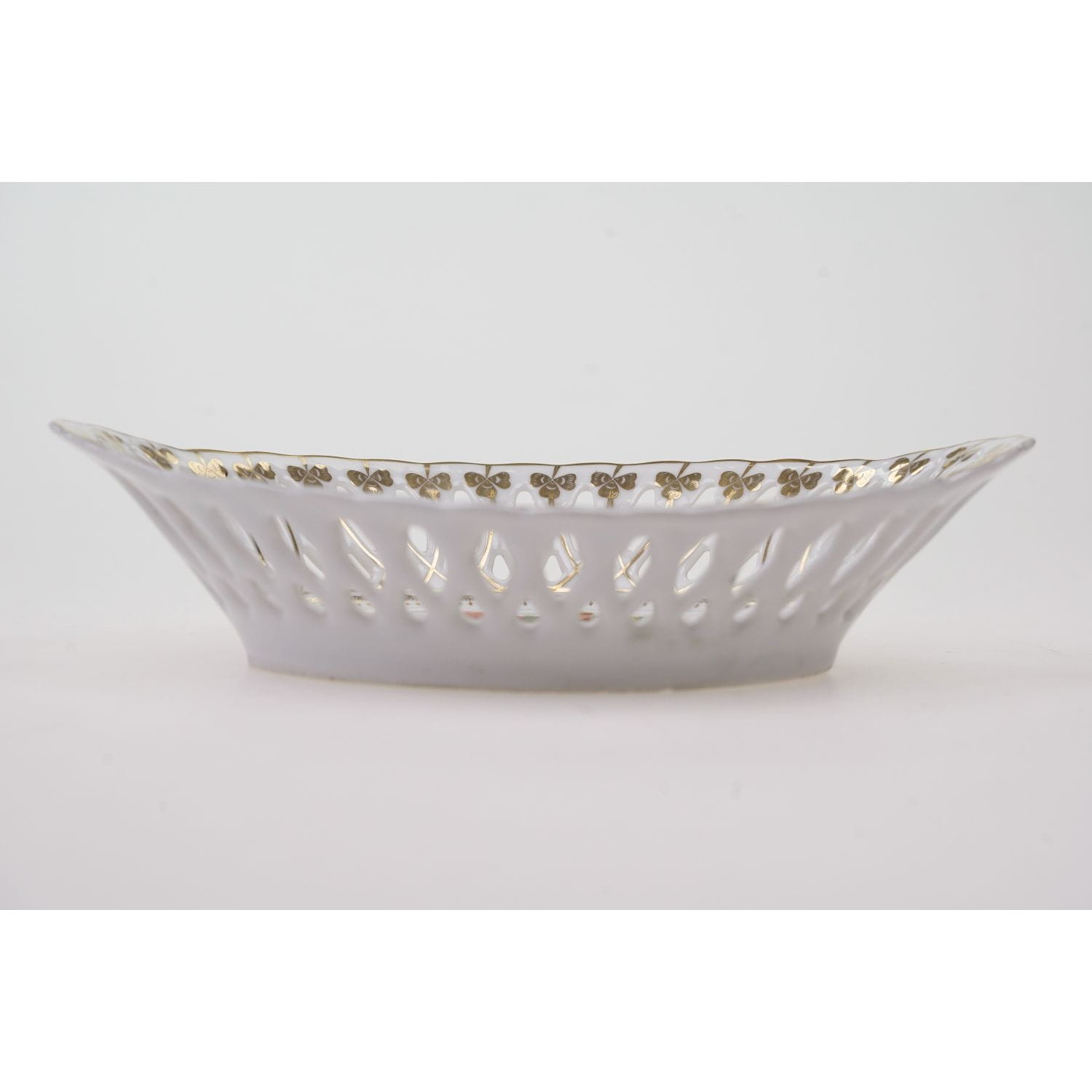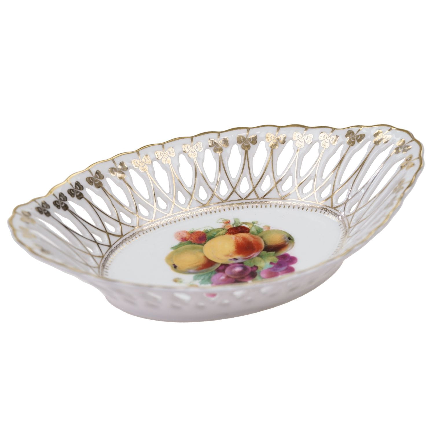 Sygnowana jedynie numerycznymi wyciskami w masie. Śliczna, biała porcelana z przepięknymi ażurkami ze złoceniami i złotymi listkami koniczyn. Ażurki pokryte złotą malaturą. Na lustrze bukiet realistycznych, smakowitych owoców: wiśnie i brzoskwinia obramowany złotymi ornamentami.