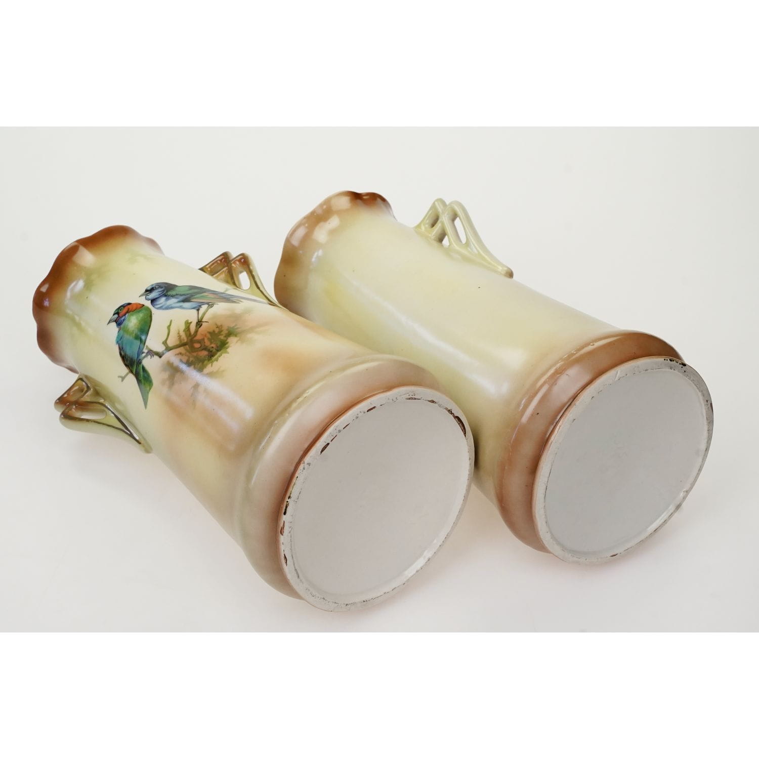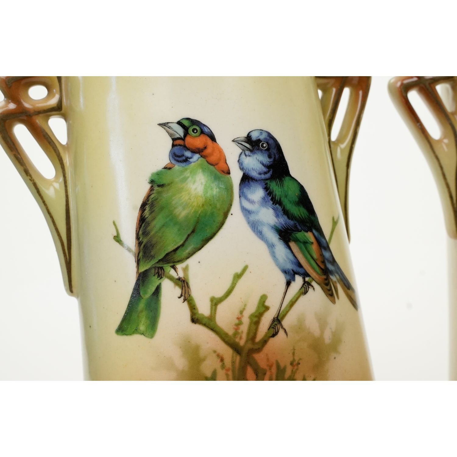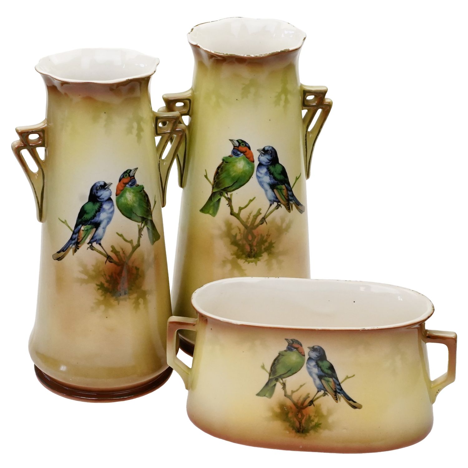 Na żardinierze sygnatura z napisem "Made in Czechoslovakia". Na wazonach wyciśnięty w masie cyfry. Zachowane w stylu Art-Deco. Na wszystkich elementach żółto-beżowa malatura, cieniowana. Od frontu każdego elementu podobizny ptaków. Szkliwione. Całość razem pięknie się prezentuje.