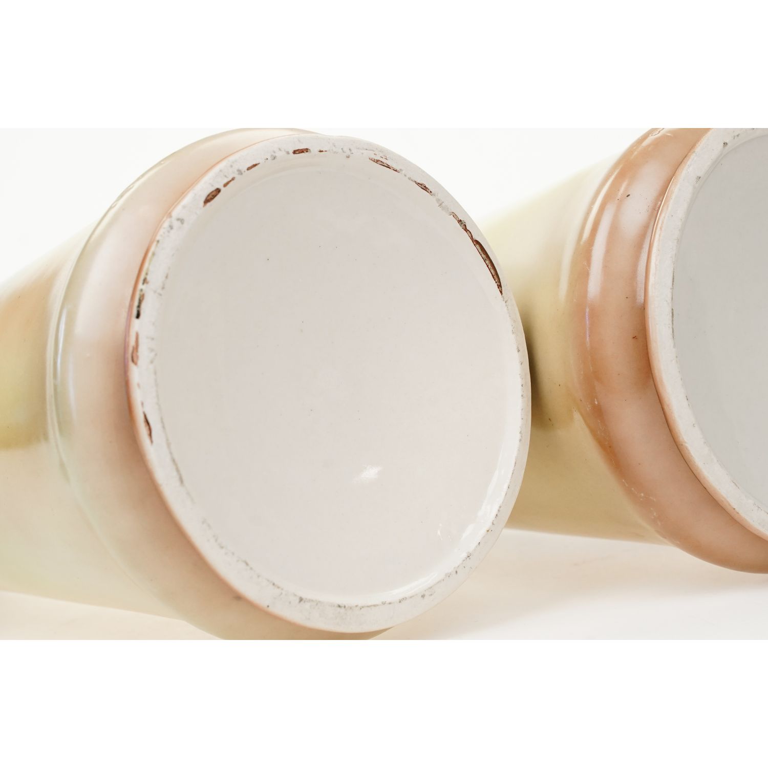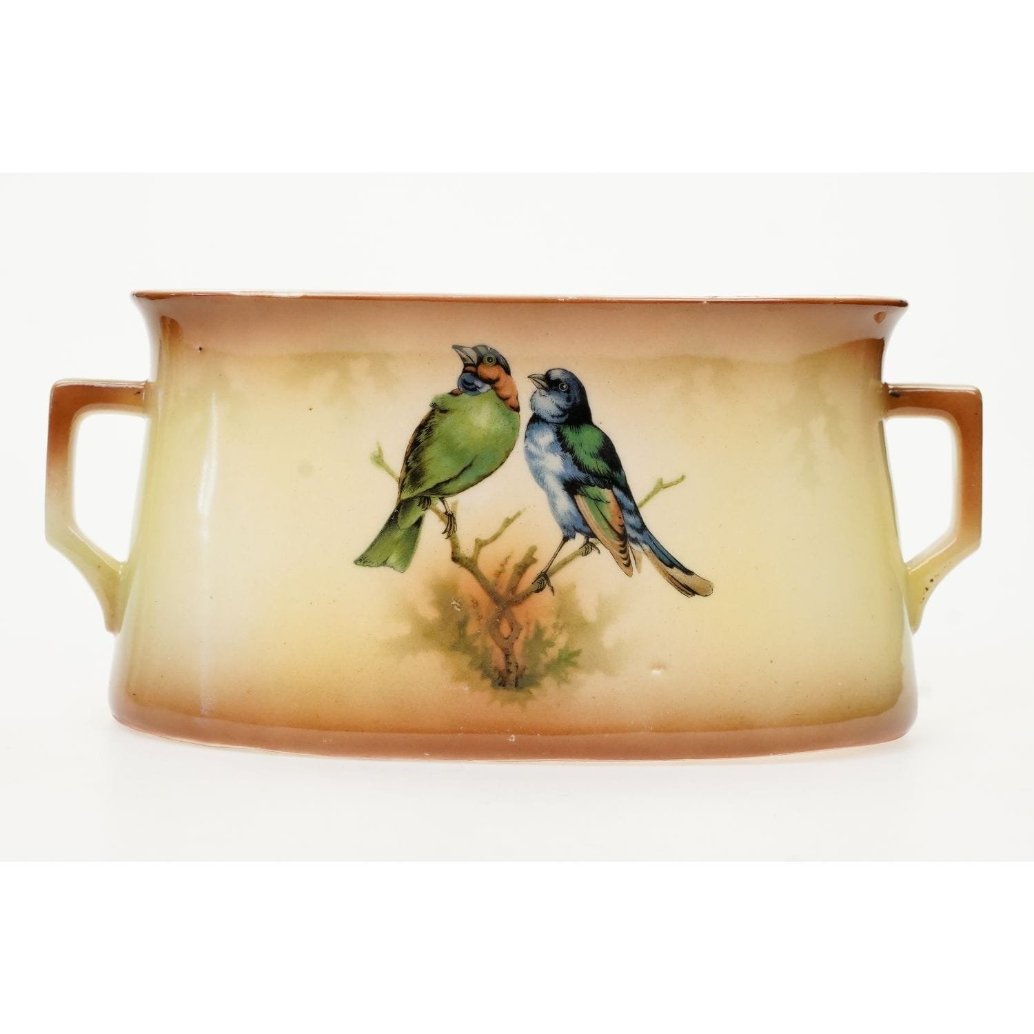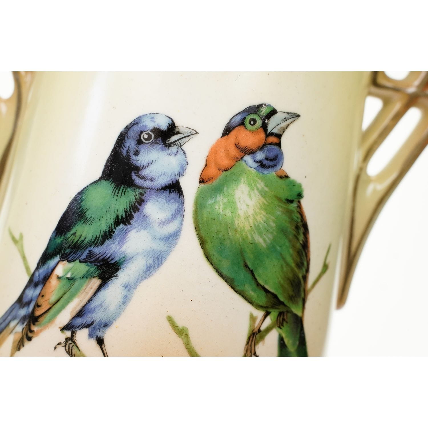 Na żardinierze sygnatura z napisem "Made in Czechoslovakia". Na wazonach wyciśnięty w masie cyfry. Zachowane w stylu Art-Deco. Na wszystkich elementach żółto-beżowa malatura, cieniowana. Od frontu każdego elementu podobizny ptaków. Szkliwione. Całość razem pięknie się prezentuje.