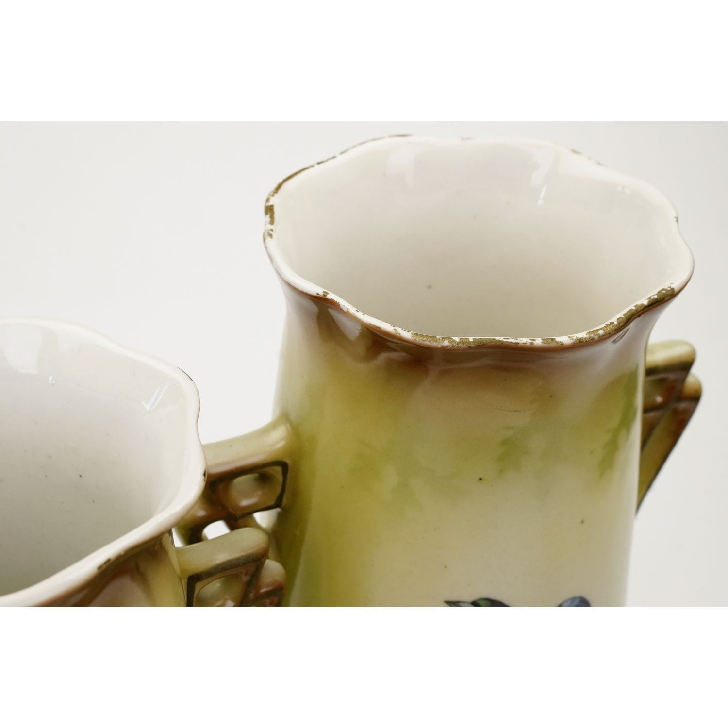 Majolika, cudowny, stareńki komplet na kominek składający się z dwóch wazonów i żardiniery.