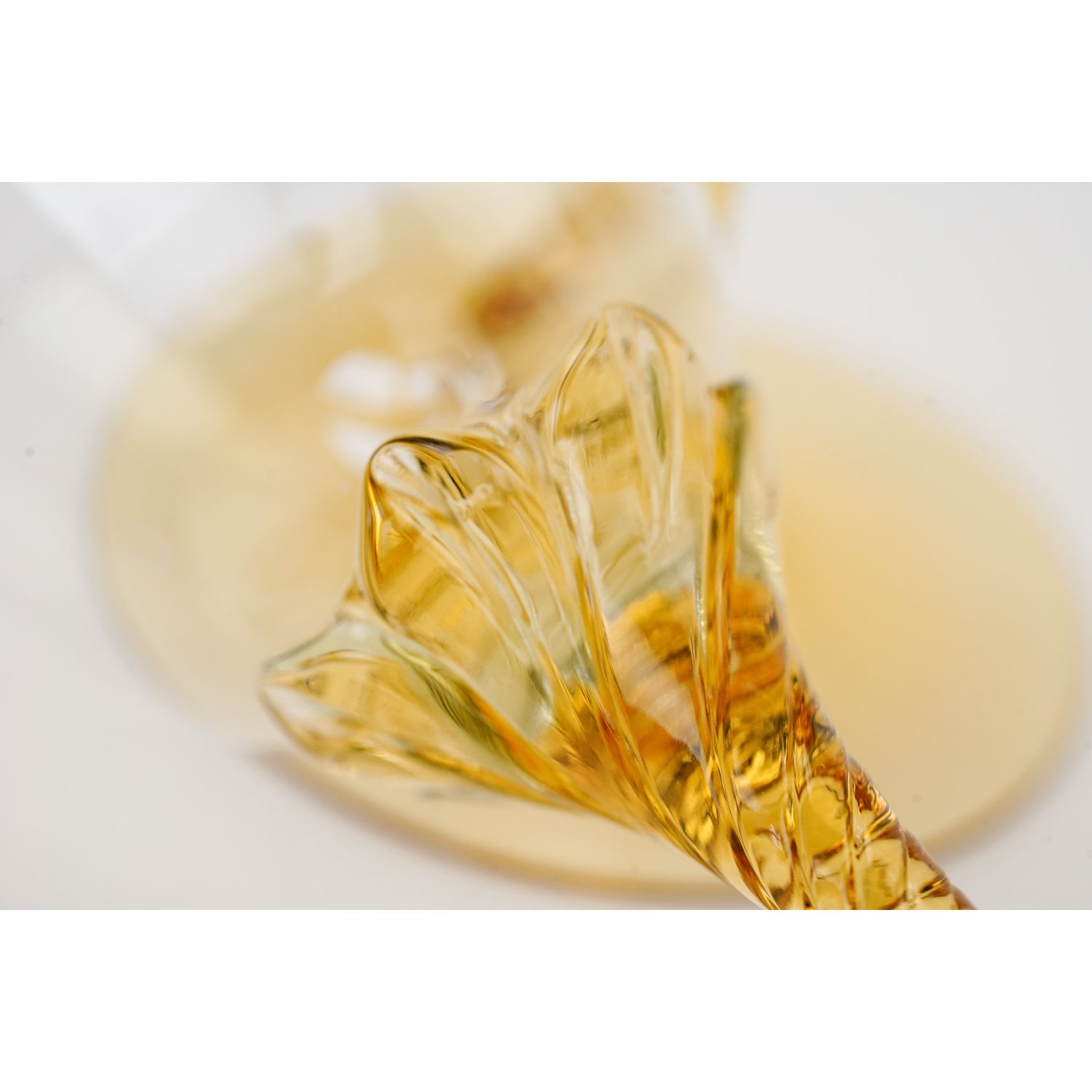 Śliczny komplet sześciu kieliszków na bursztynowych, spiralnie skręconych nóżkach. Pochodzi z Czechosłowacji z drugiej połowy XX wieku. Czasza delikatna, bezbarwna.