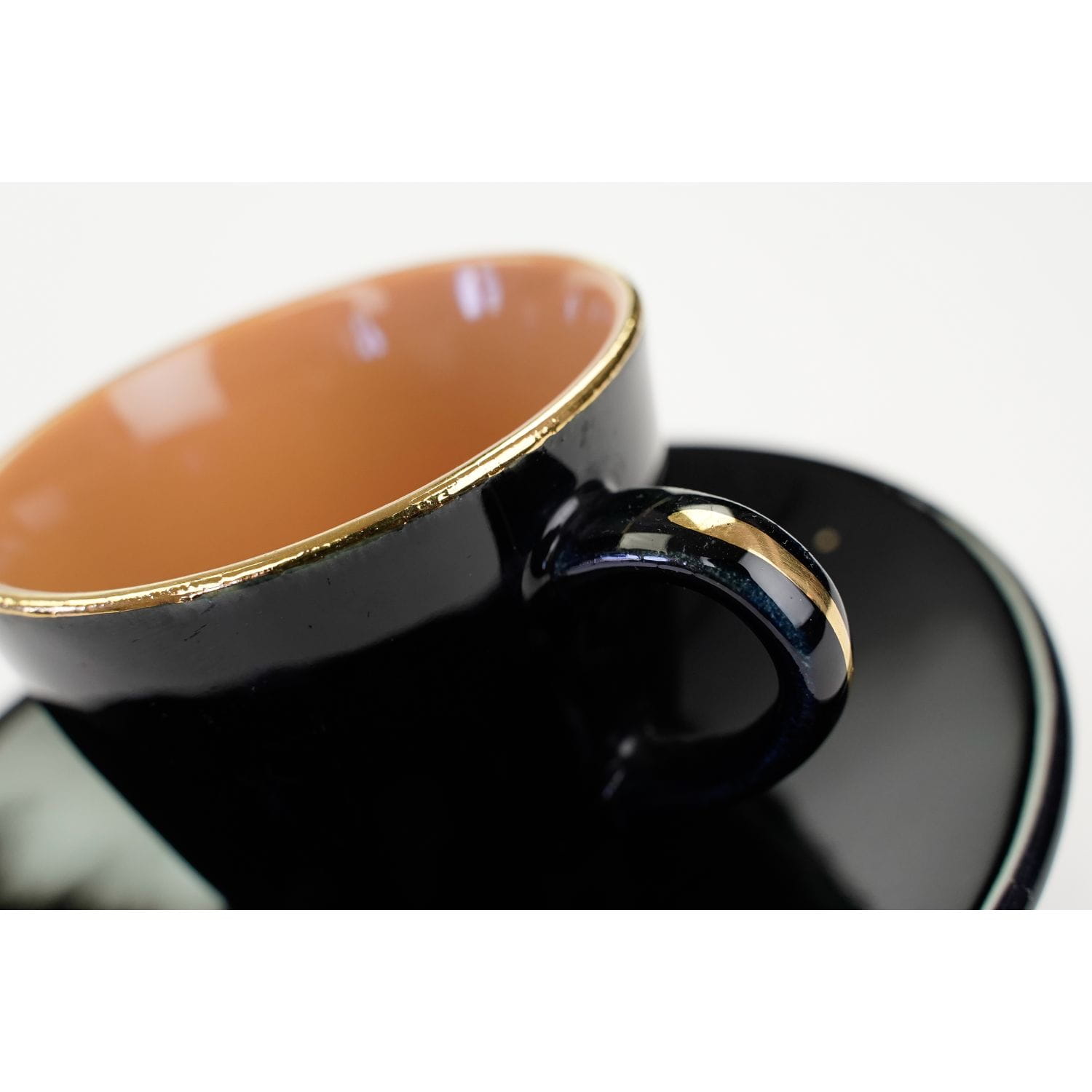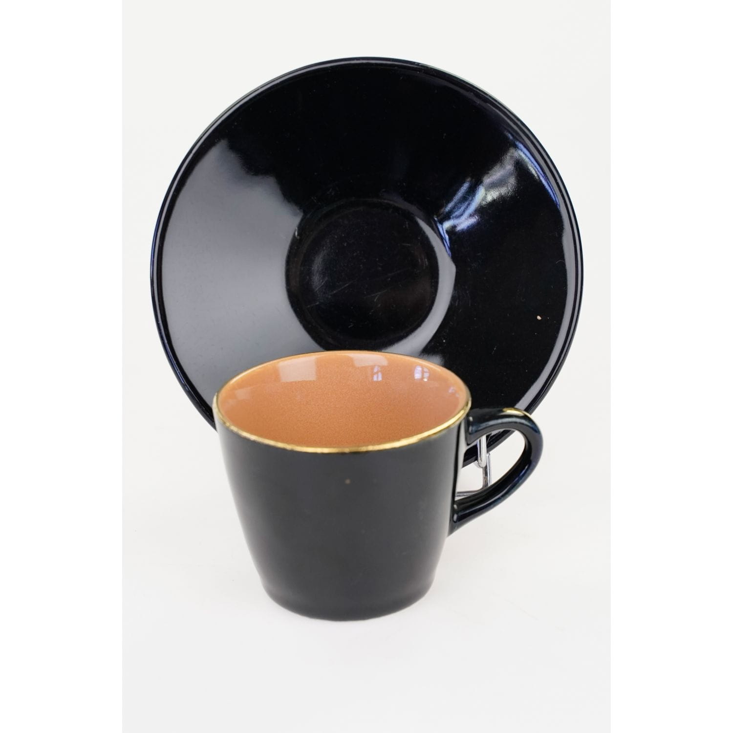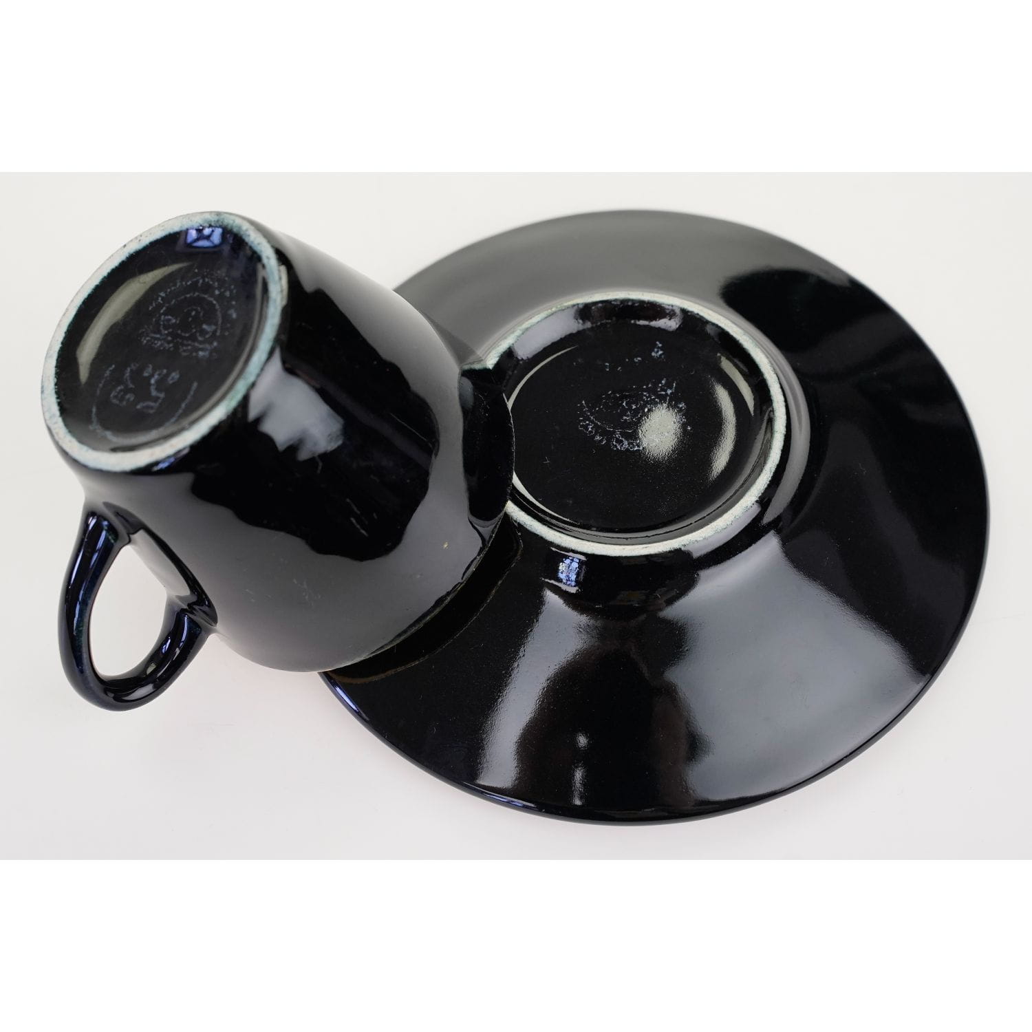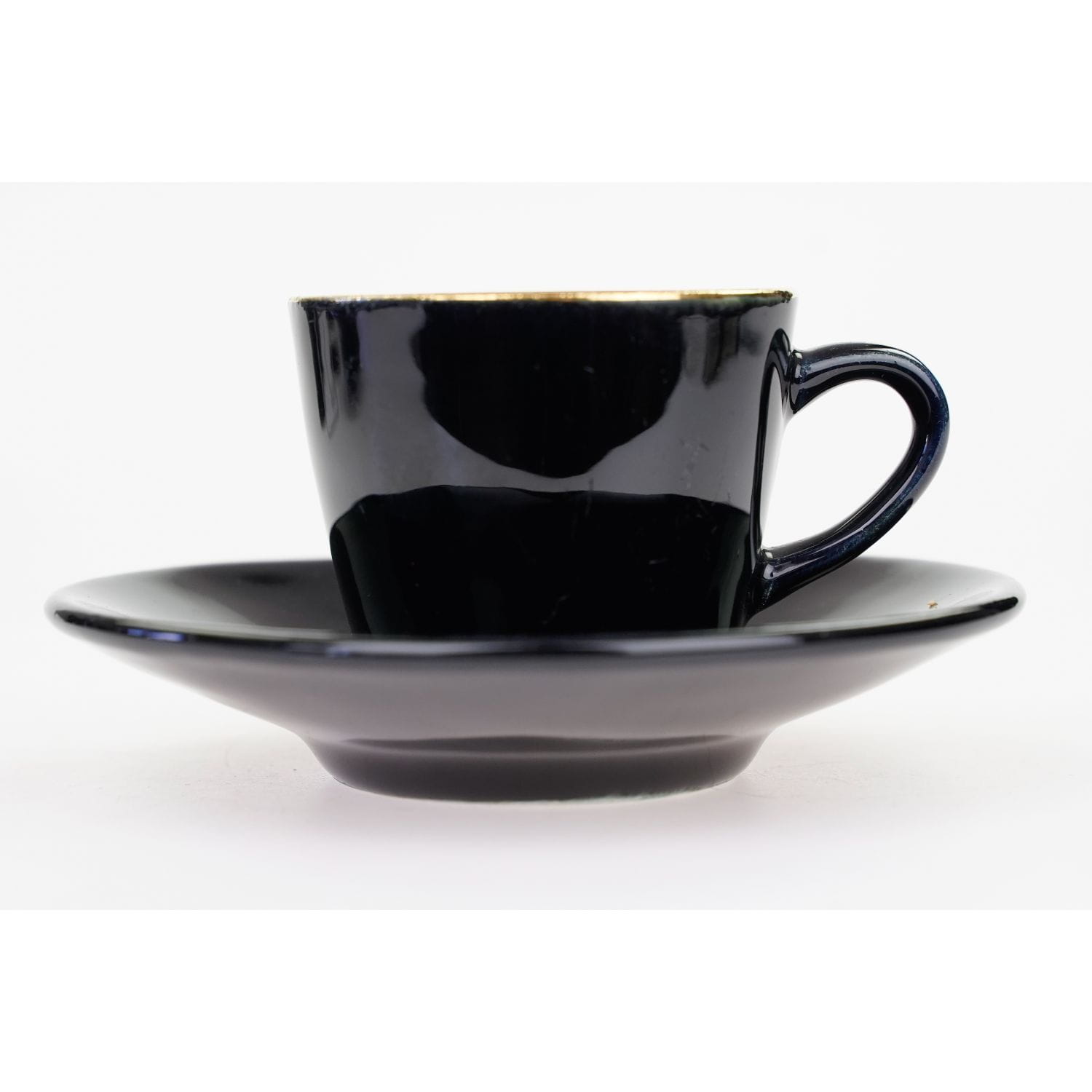 Pochodzi z Bohemii z miejscowości Trnovany z wytwórni Ditmar-Urabch z lat 60/70-tych XX wieku. Ceramika szkliwiona ze złoceniami na krawędziach. Spodek w czarnym kolorze, filiżanka na zewnątrz czarna, wewnątrz beżowa.