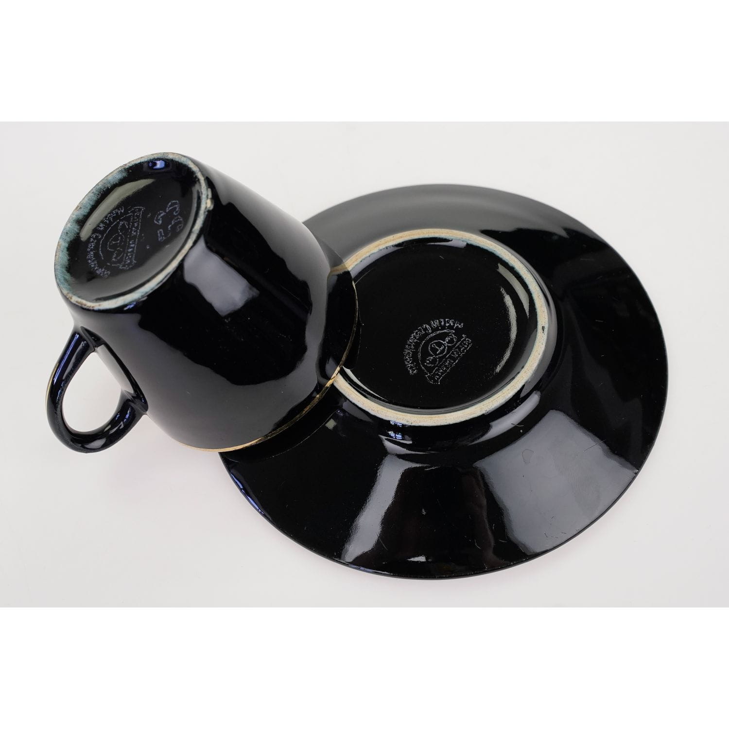 Pochodzi z Bohemii z miejscowości Trnovany z wytwórni Ditmar-Urabch z lat 60/70-tych XX wieku. Ceramika szkliwiona ze złoceniami na krawędziach. Spodek w czarnym kolorze, filiżanka na zewnątrz czarna, wewnątrz szaroniebieska.