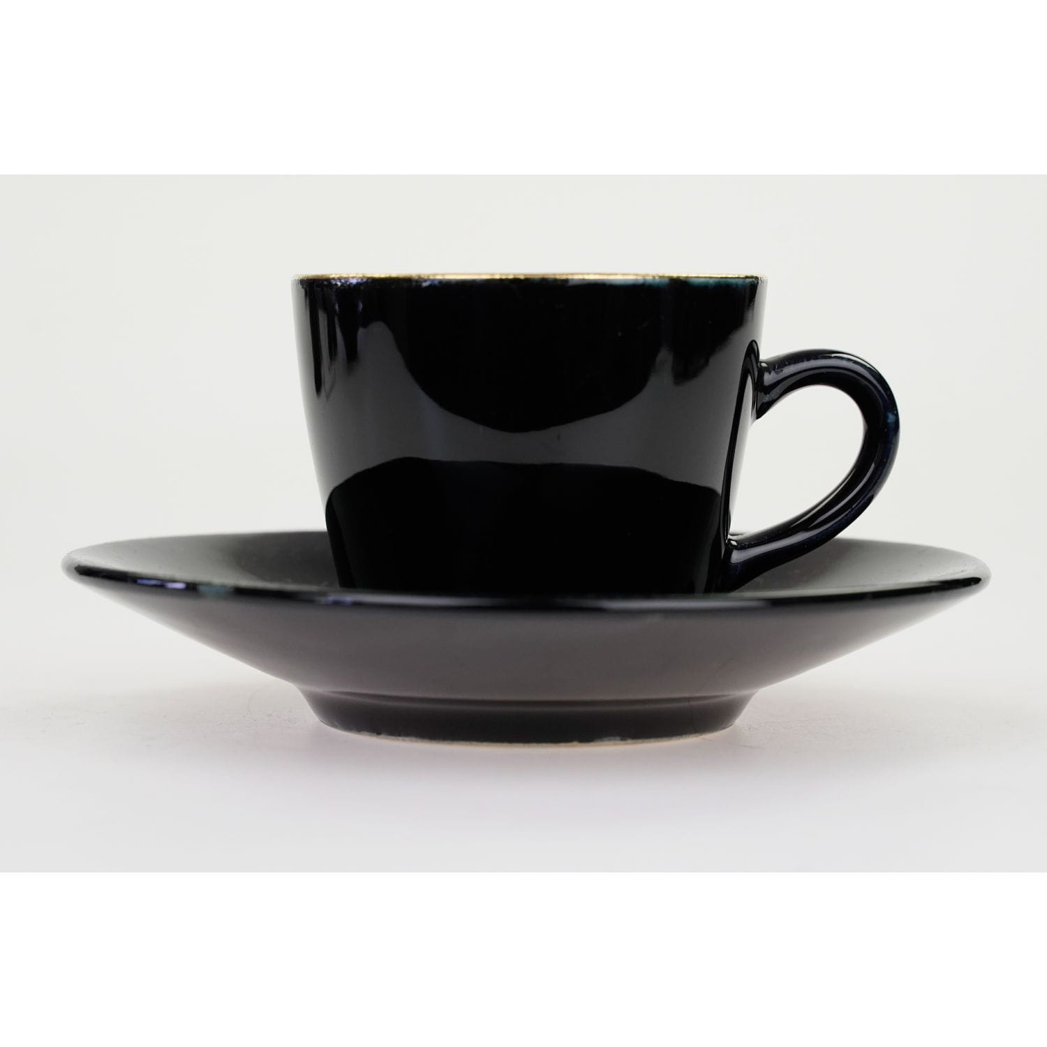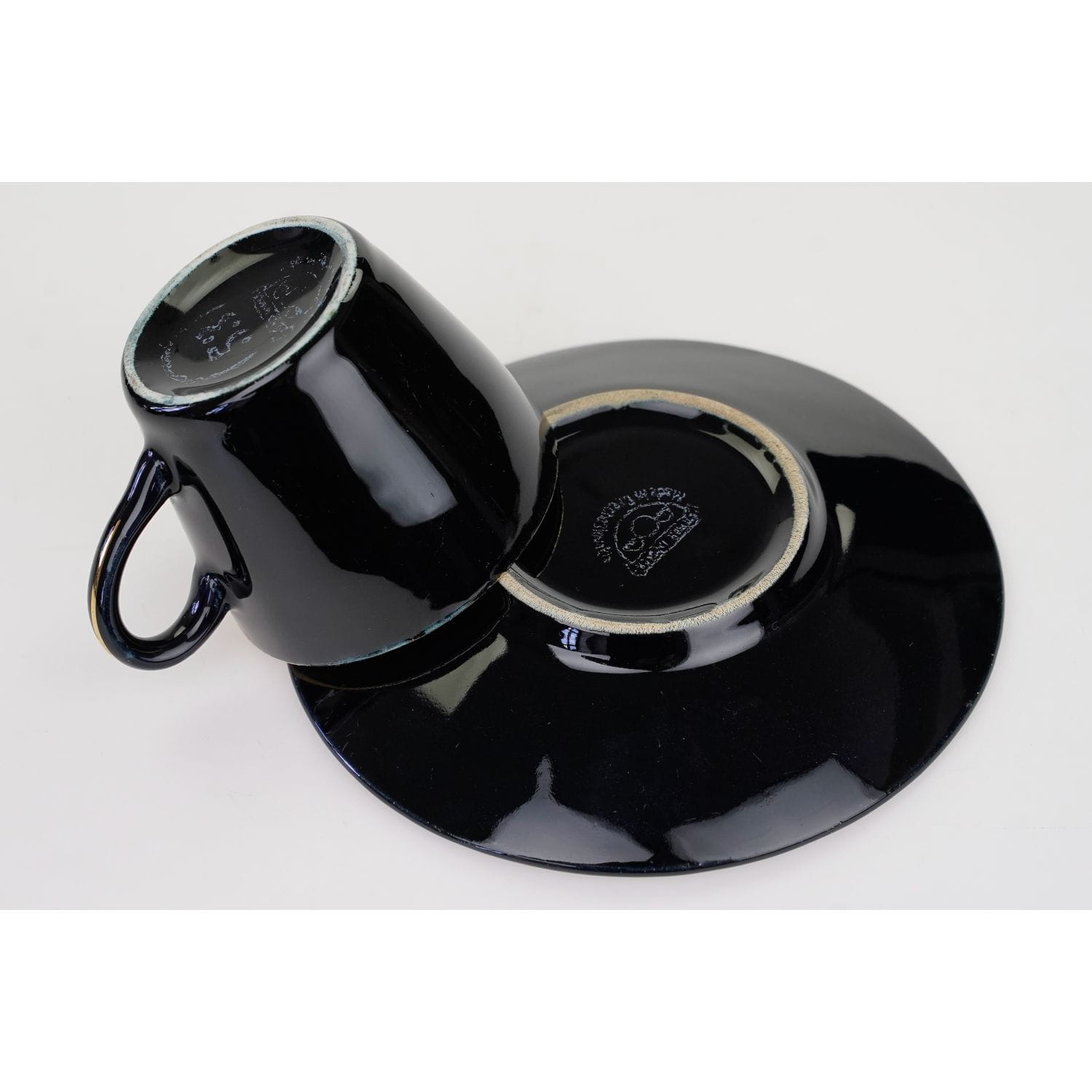 Pochodzi z Bohemii z miejscowości Trnovany z wytwórni Ditmar-Urabch z lat 60/70-tych XX wieku. Ceramika szkliwiona ze złoceniami na krawędziach. Spodek w czarnym kolorze, filiżanka na zewnątrz czarna, wewnątrz w żółci.