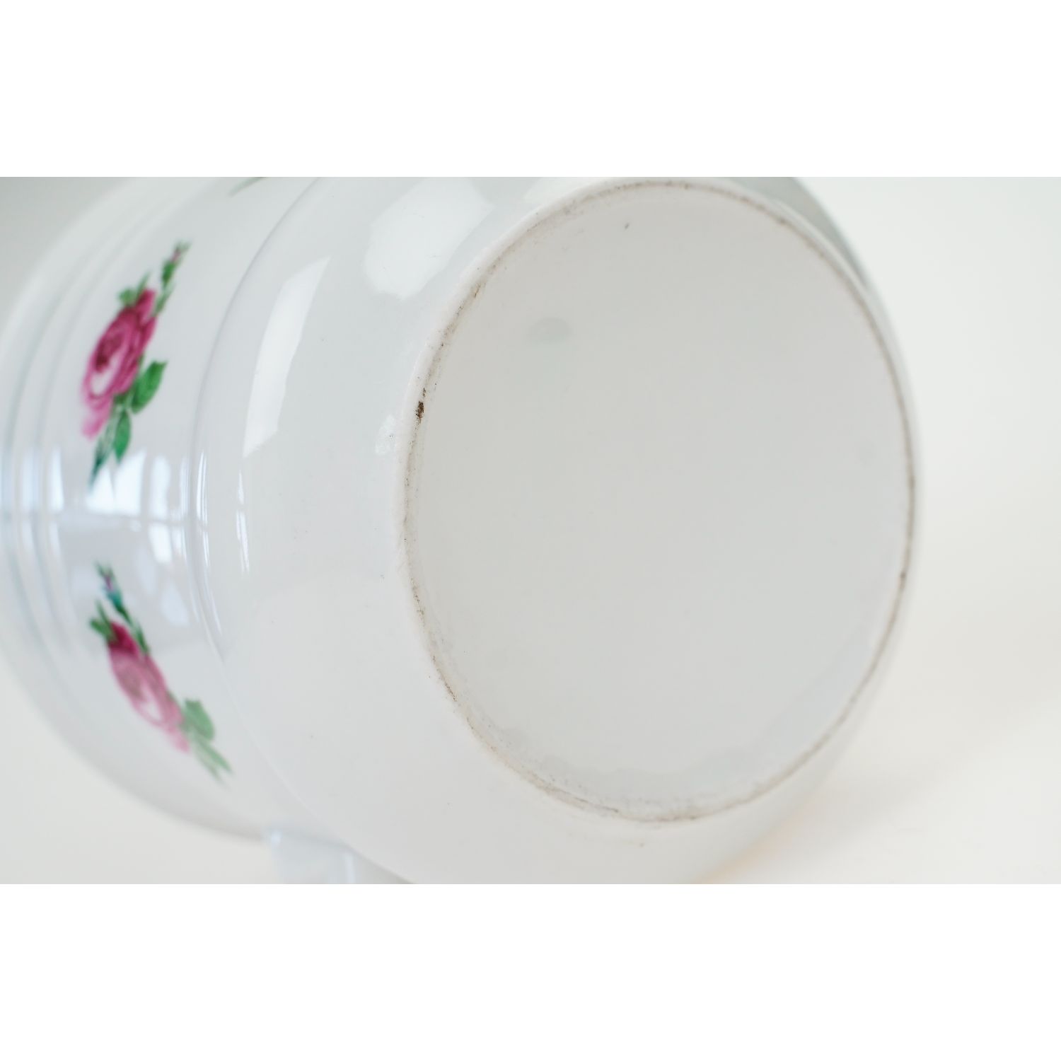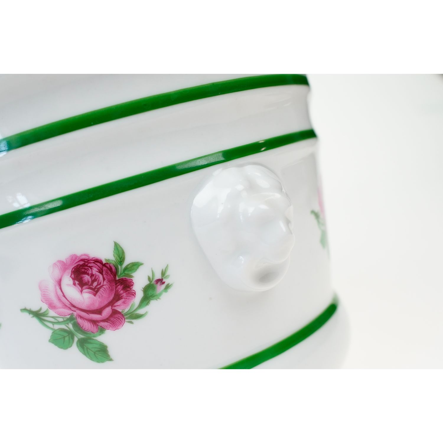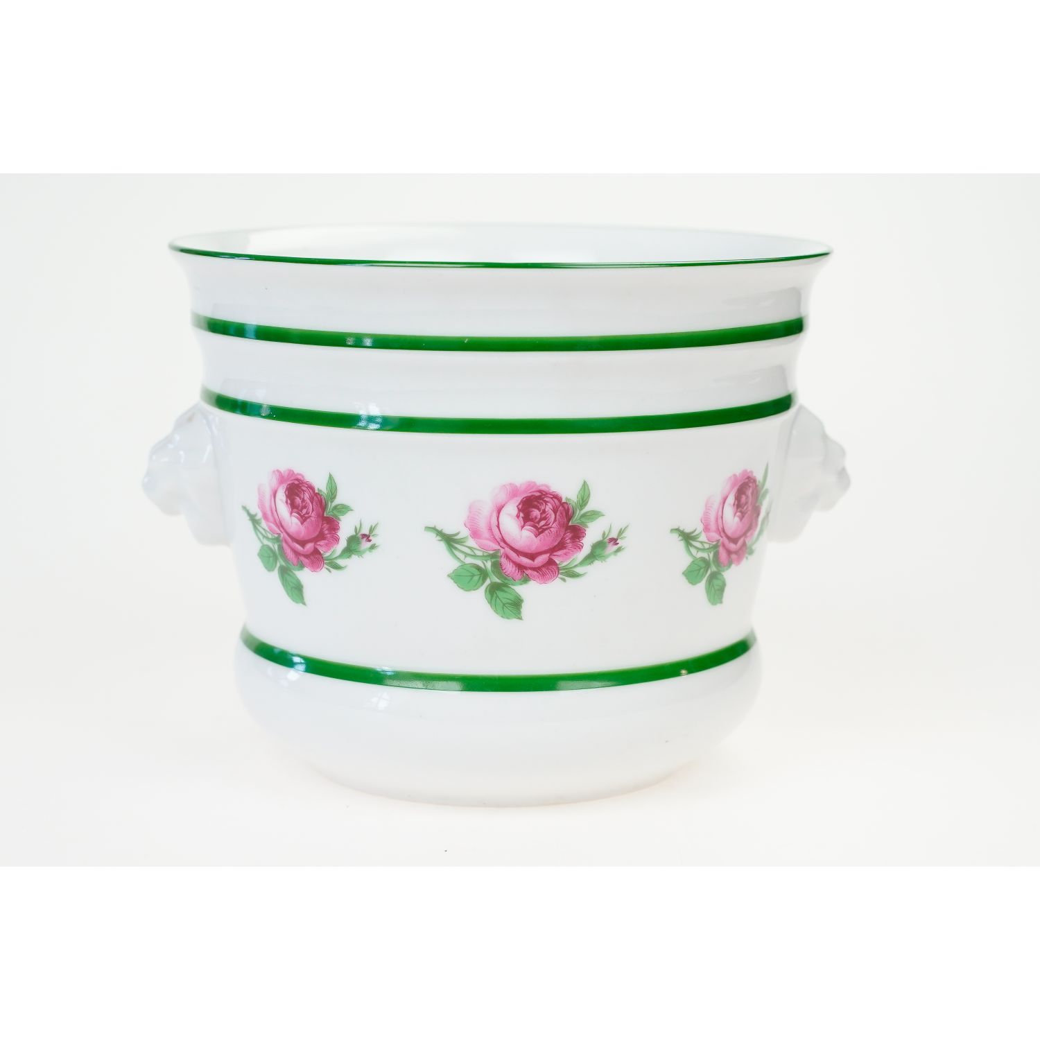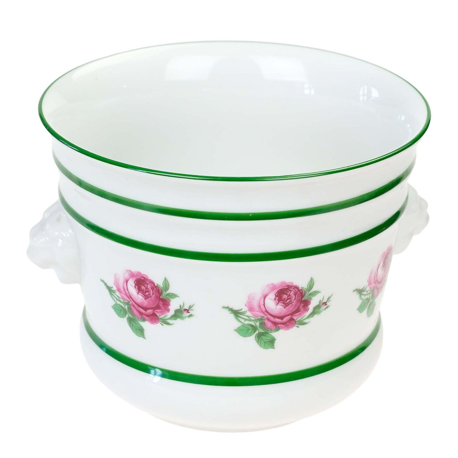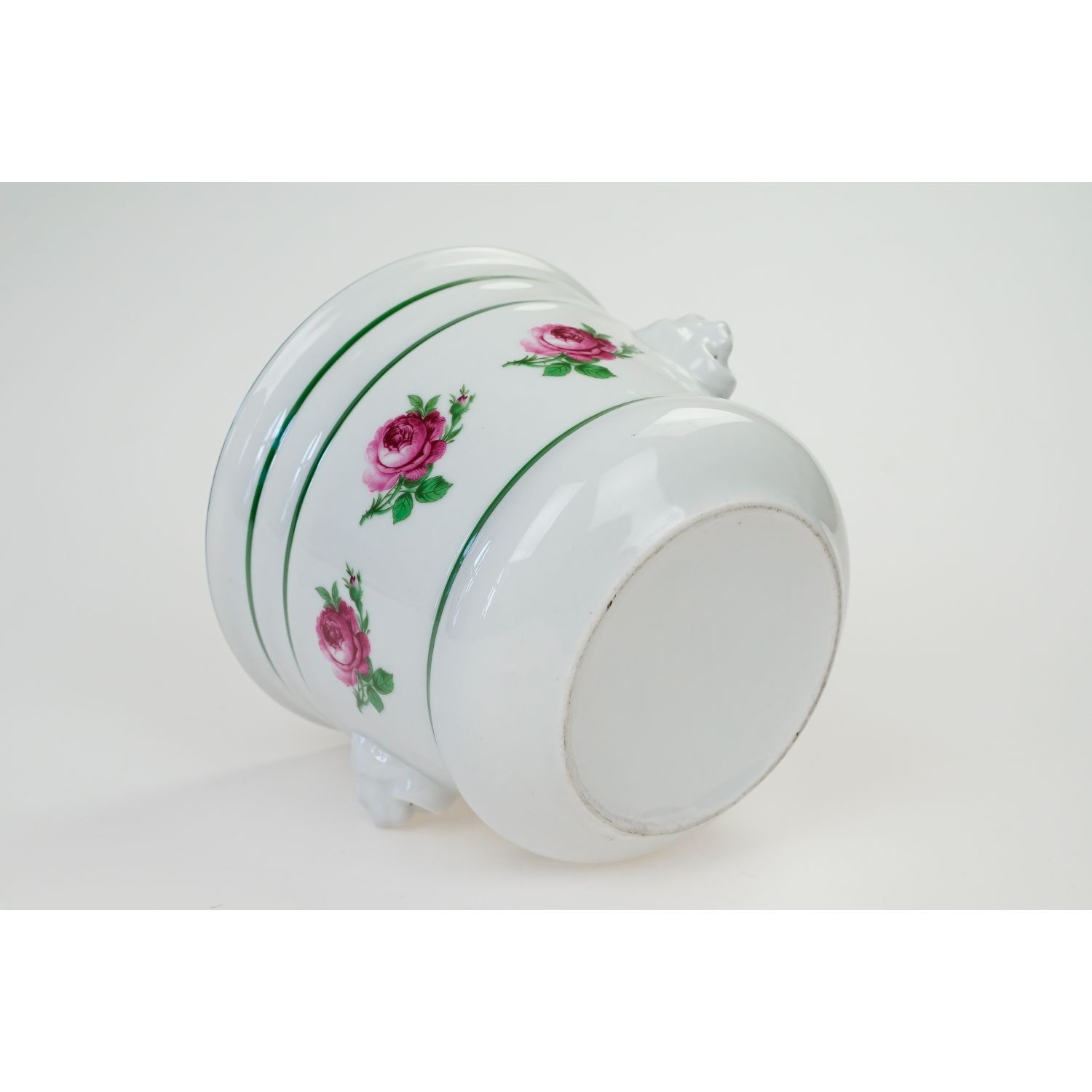 Nie jest sygnowana. Doniczka wykonana z wysokiej jakości porcelany. Uszy w postaci maszkaronów. Ranty i brzusiec udekorowany zielonymi obwódkami, konturówkami. Na brzuścu kwiaty róż.