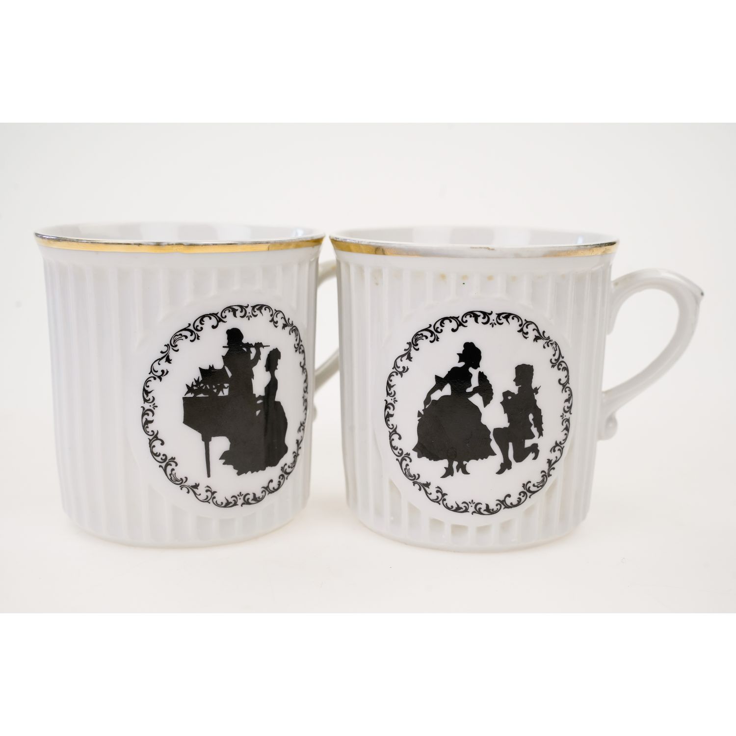Kubki pochodzą z Czech z miejscowości Dubí (kiedyś Eichwald), z wytwórni Duchovský Porcelán. Sygnowane znakiem stosowanym po 1945 roku. Porcelana biała, kanelowana. Z obu stron medaliony a w nich sentymentalne postaci kawalera z damą. Na każdym kubku inna scenka. Dekoracja typu schwarzlot, która nawiązuje do osiemnastowiecznych wycinanek konturowych. Dekoracje z obu stron. Ranty złocone.