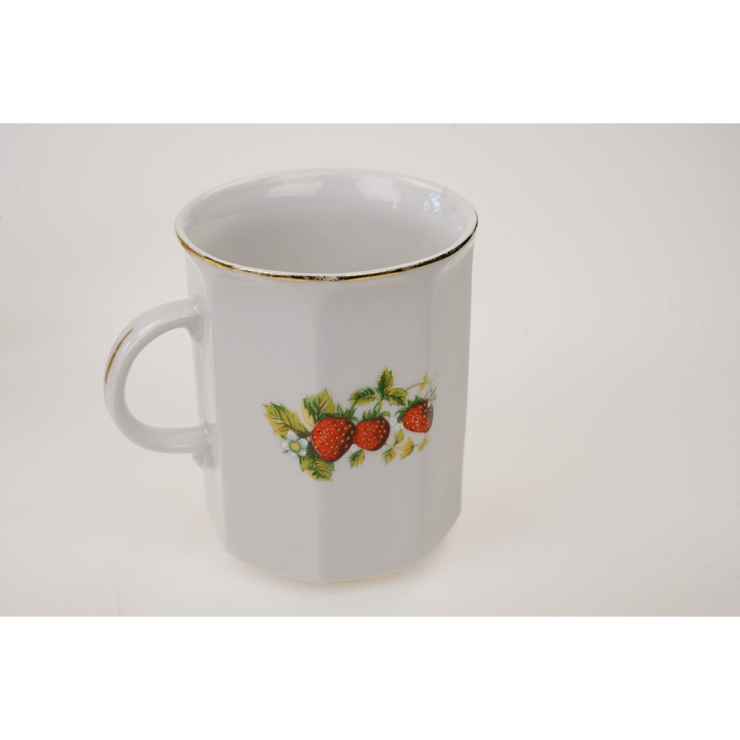Kubek pochodzi z Czech z miejscowości Dubí (kiedyś Eichwald), z wytwórni Ceský Porcelán Dubí. Porcelana, biała o graniastym kształcie. Z obu stron owocowe dekoracje przedstawiające truskawki - z jednej mniejsze, z drugiej większe. Ranty w złotej konturówce.
