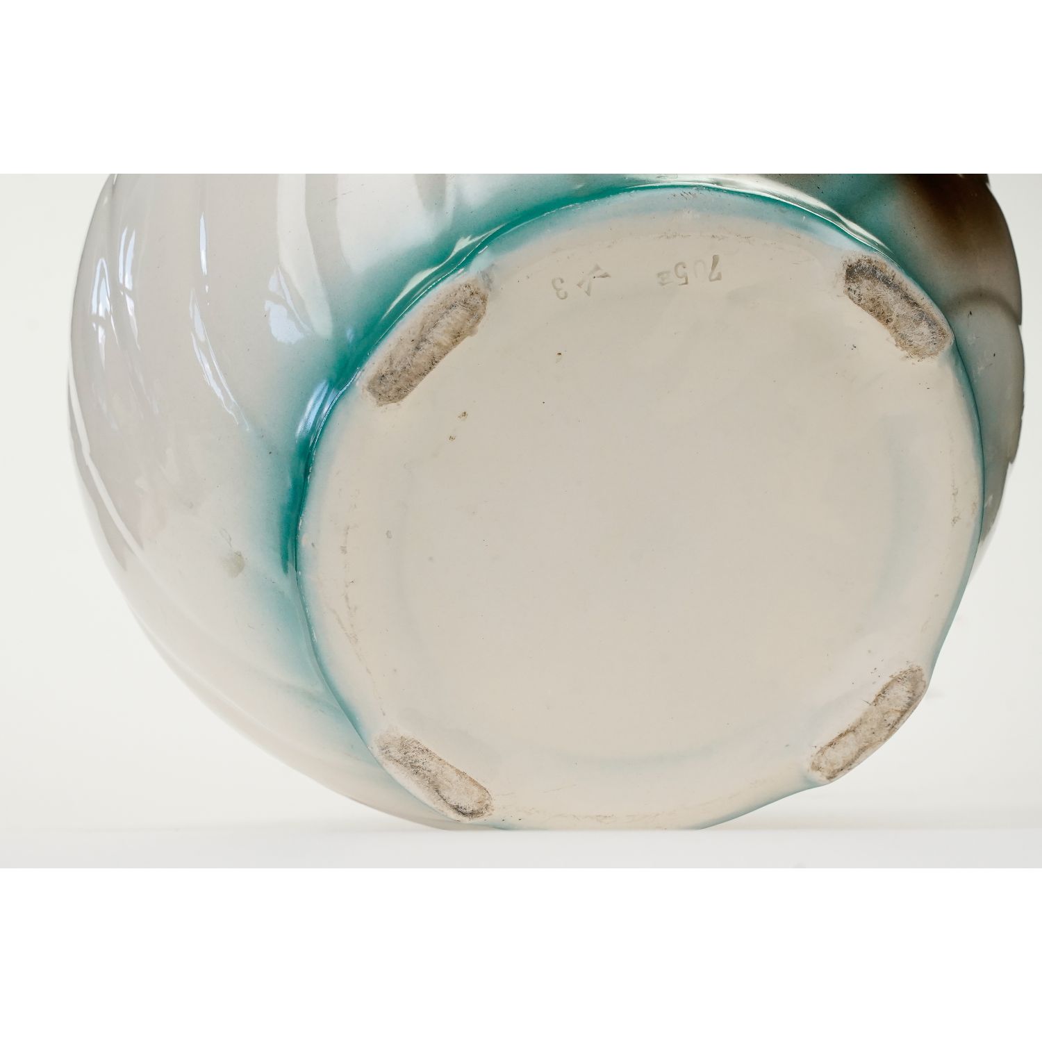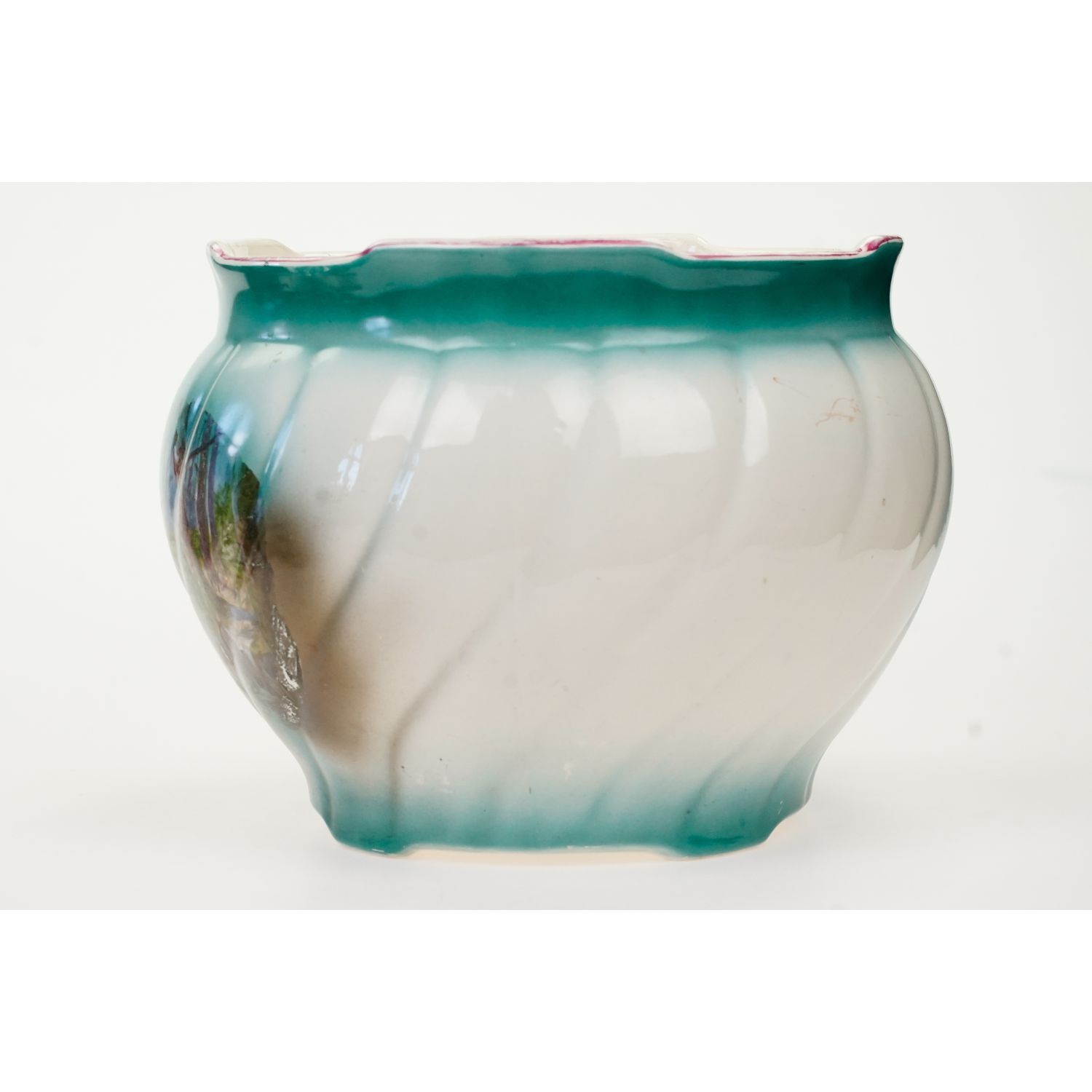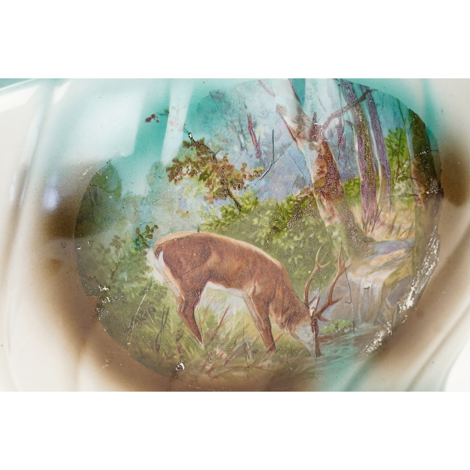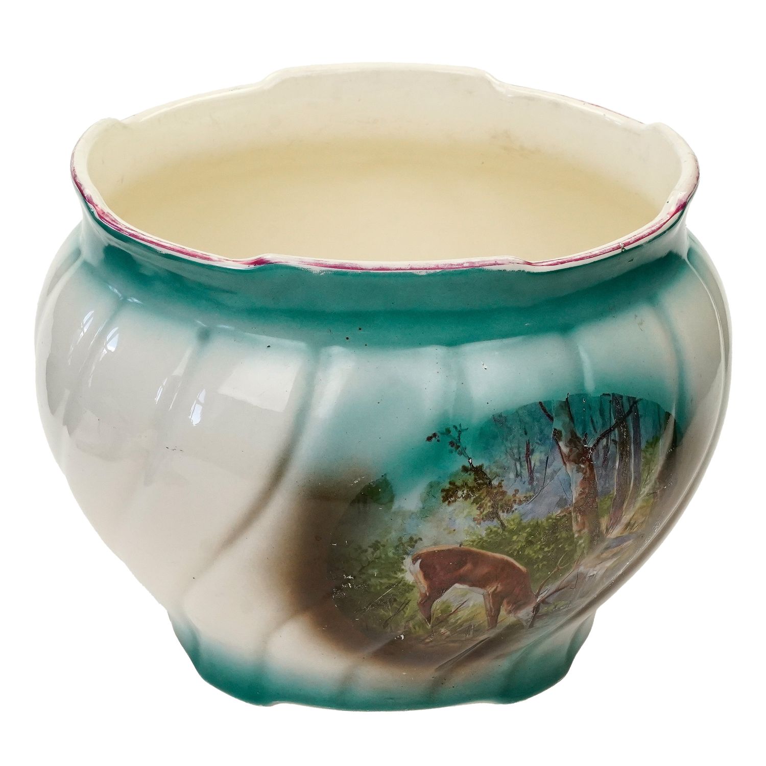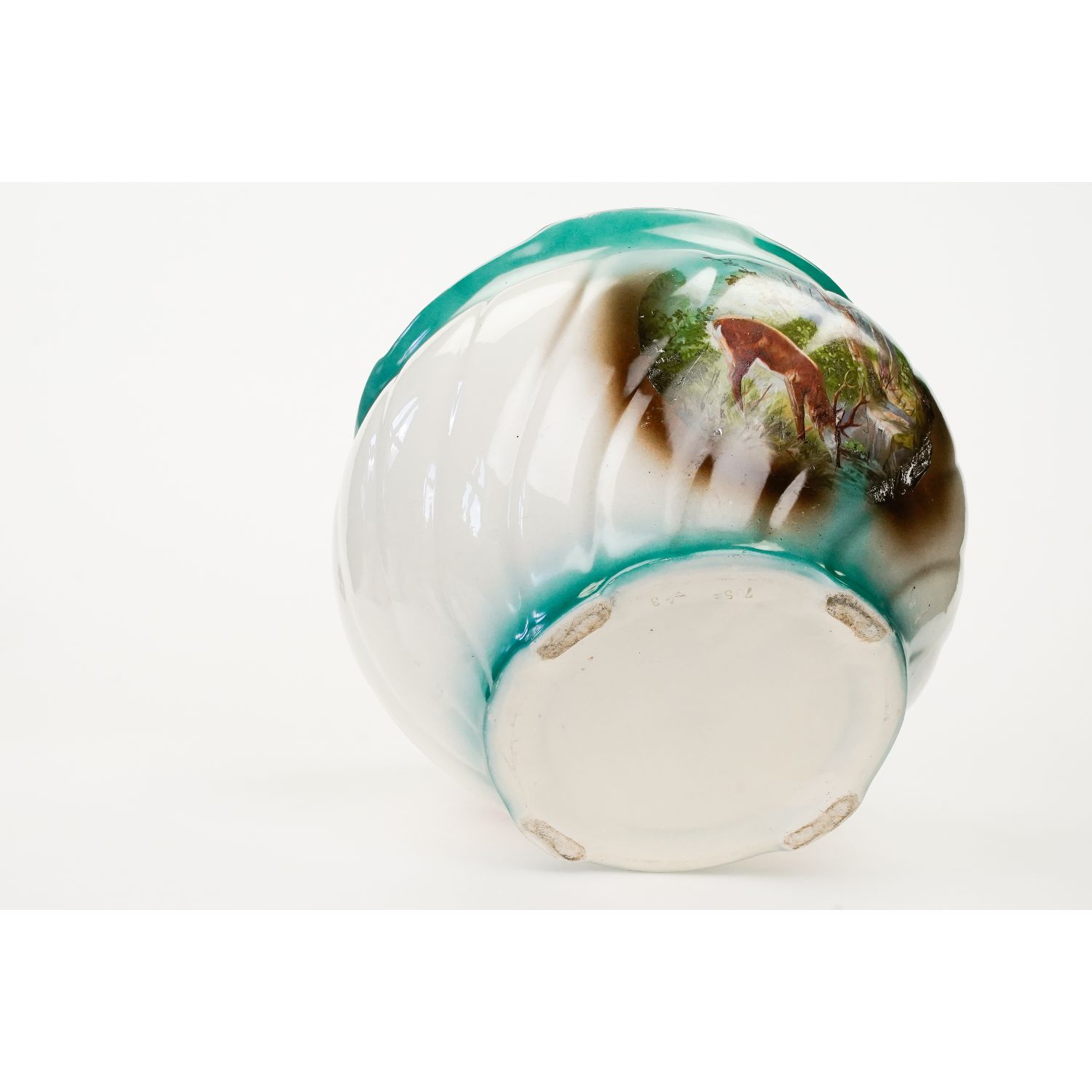 Sygnowana wyciskami w masie. Wykonana z ceramiki szkliwionej w odcieniu kremowym. Na zewnątrz cieniowana zieleń, na niej medalion z przedstawieniem jelenia w lesie. Z drugiej strony bukiet róż. Górna krawędź w malinowej obwódce.