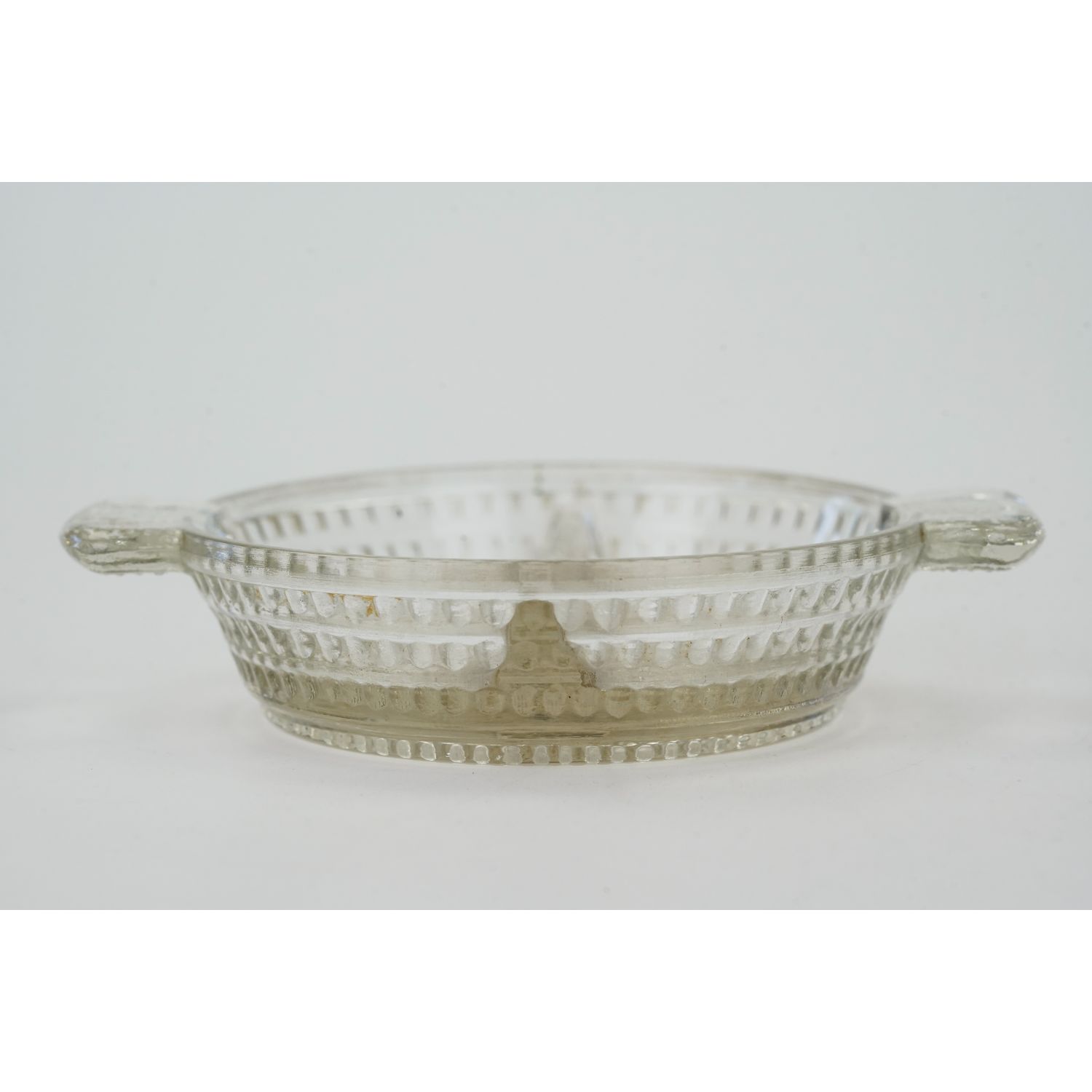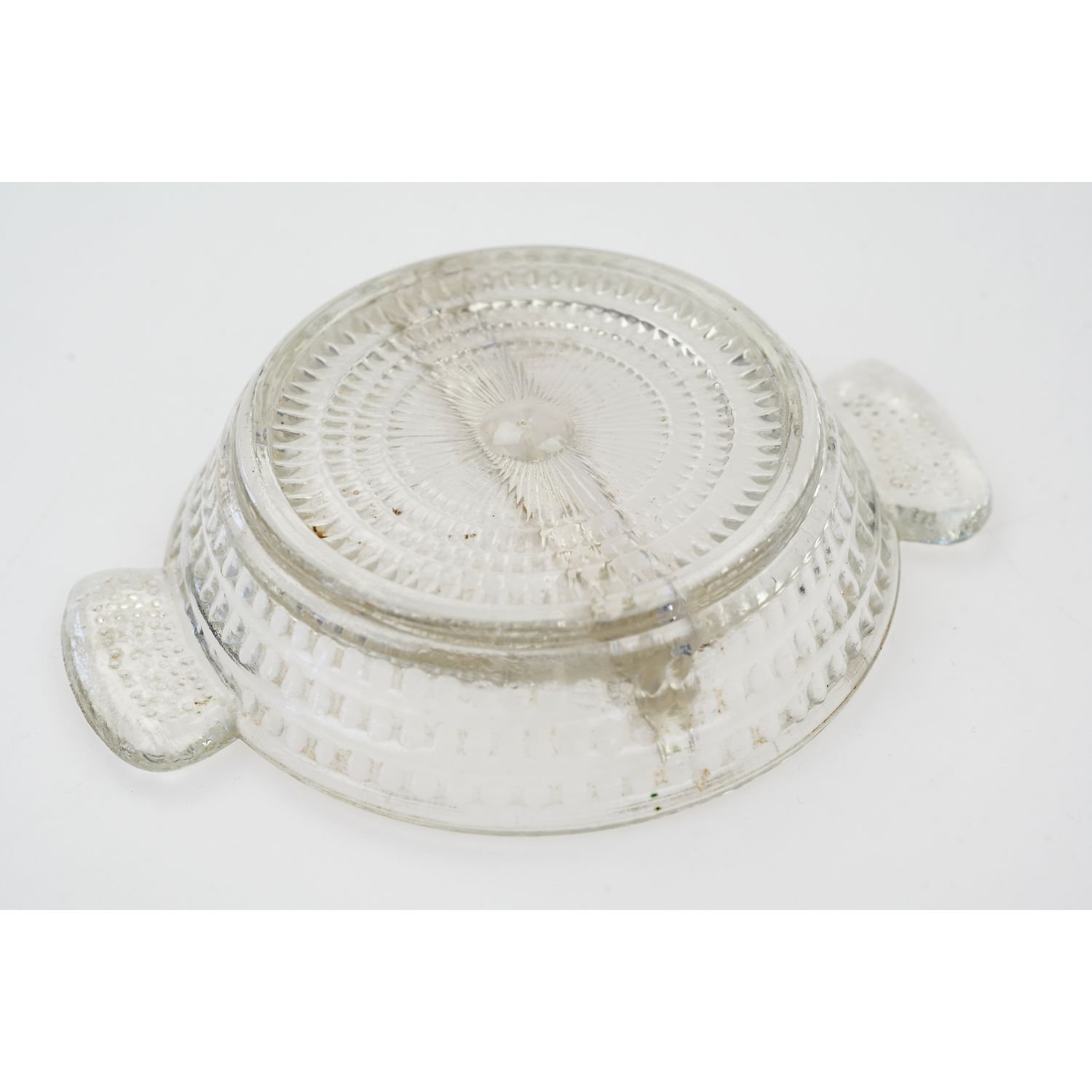 Wykonany ze szkła bezbarwnego, prasowanego. Zdobiony tłoczonym, rytmicznym wzorkiem. Z obu stron poręczne uszka.