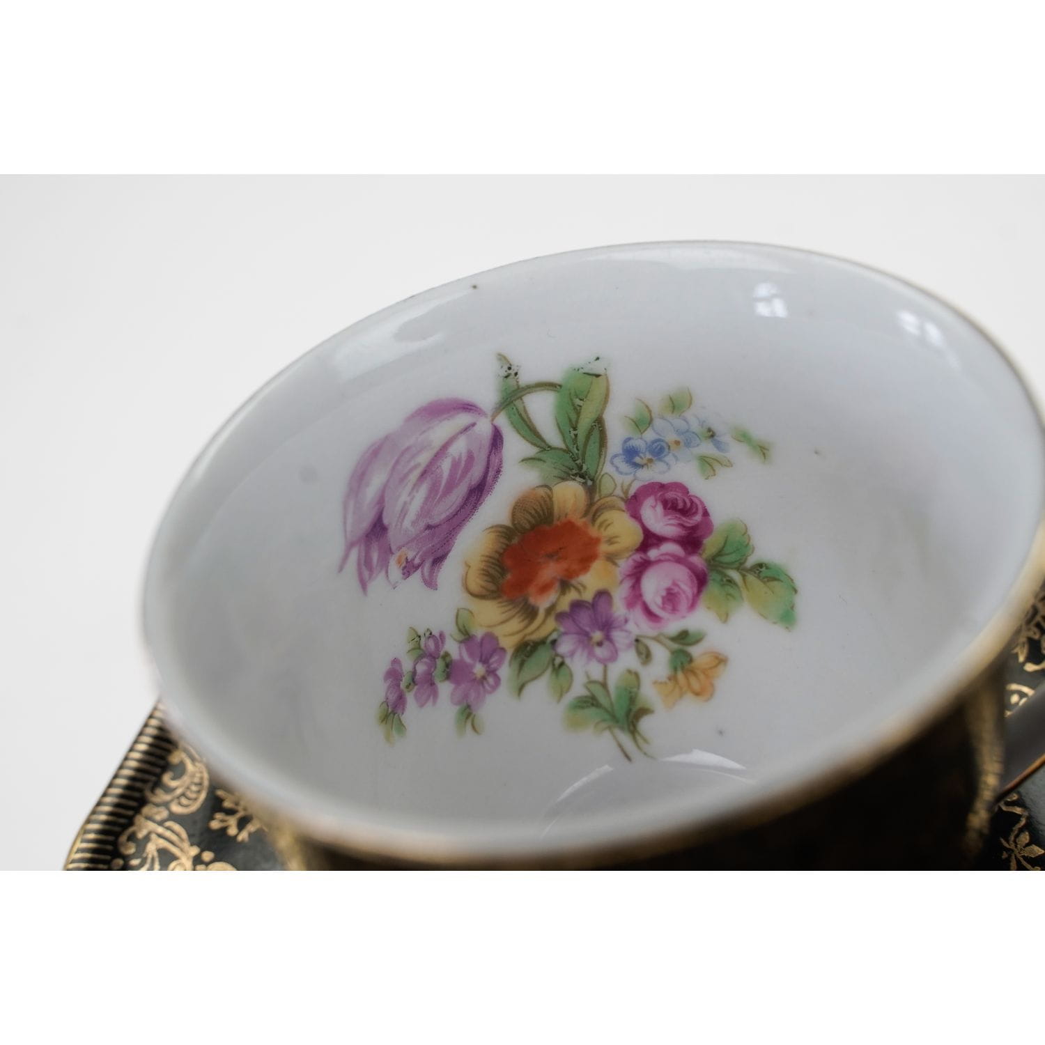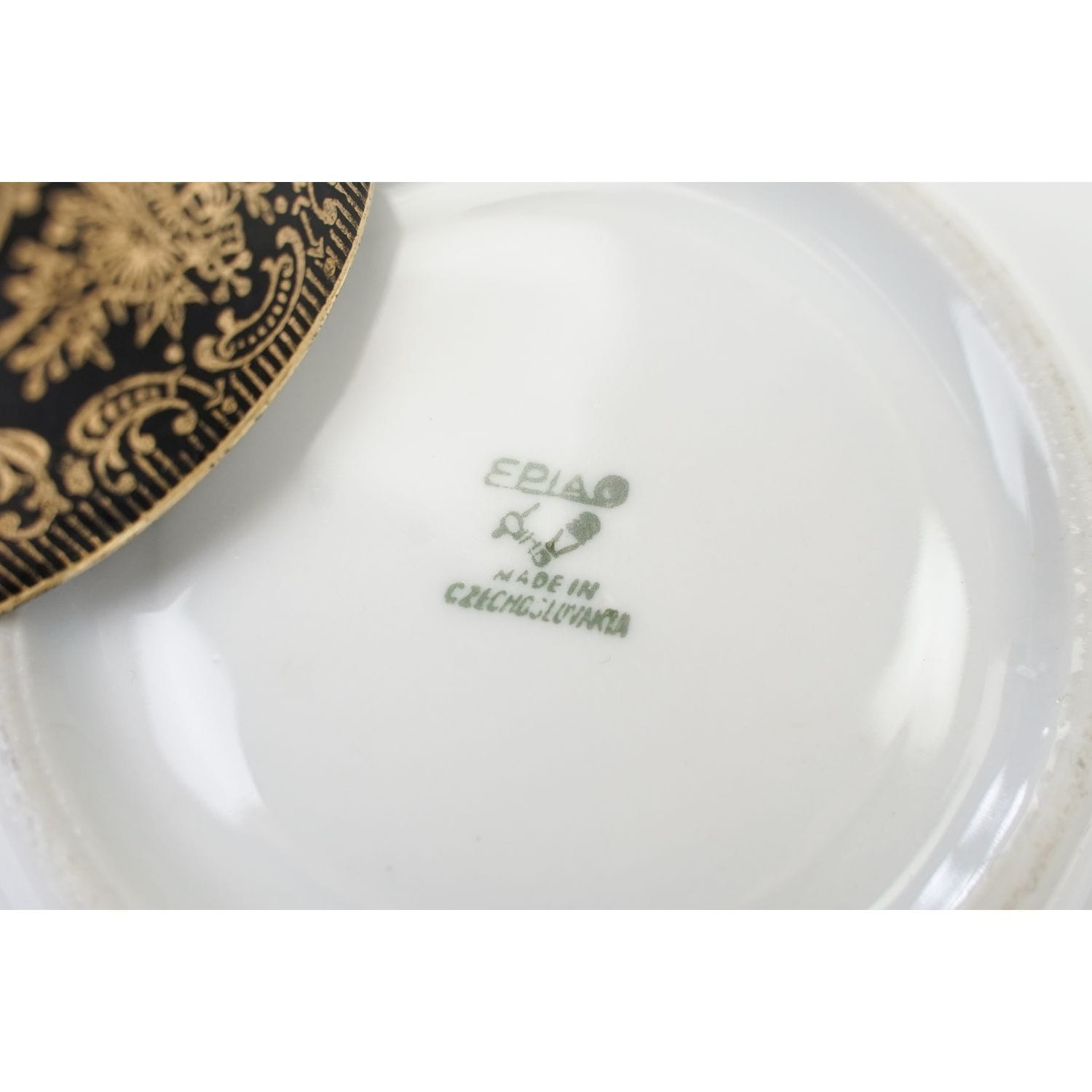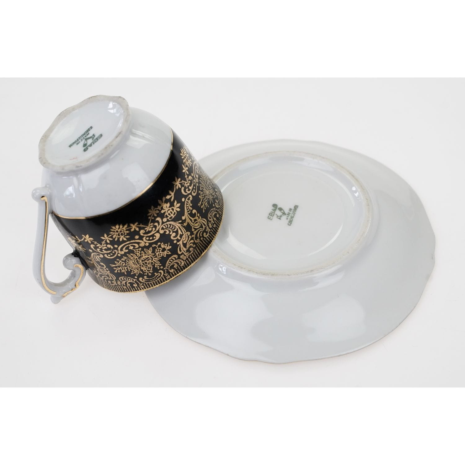 Pochodzi z Bohemii z miejscowości Loket (niem. Elbogen), z EPIAG - Erste Porzellan-Industrie AG / Karlsbad. Sygnowana znakiem stosowanym od 1945 roku. Porcelana stosunkowo delikatna, w odcieniu bieli, w dużej mierze pokryta czarną malaturą, która stała się tłem dla bogatych, ale subtelnych złotych ornamentów. Wewnątrz filiżanki duży, wielobarwny bukiet kwiatów. Ranty i uszko w złoceniu.