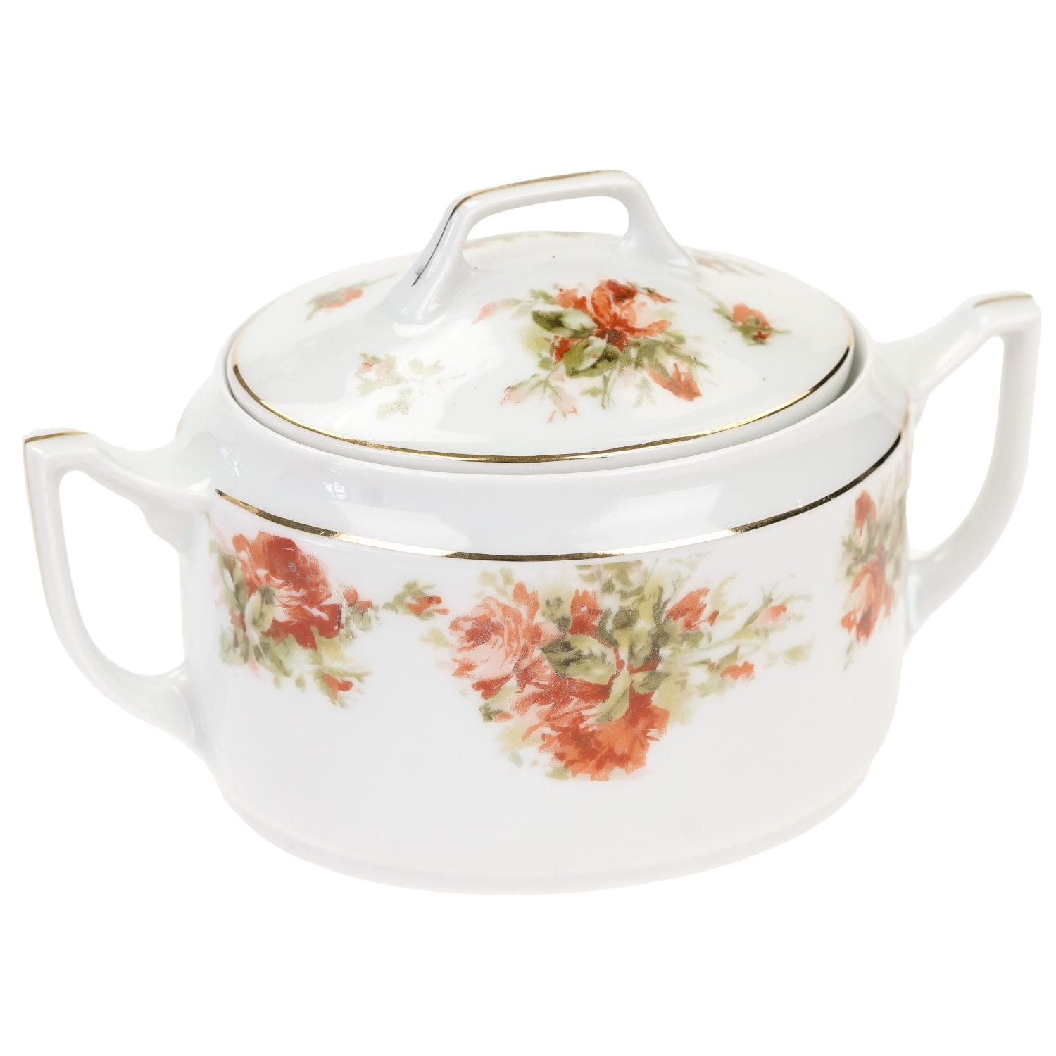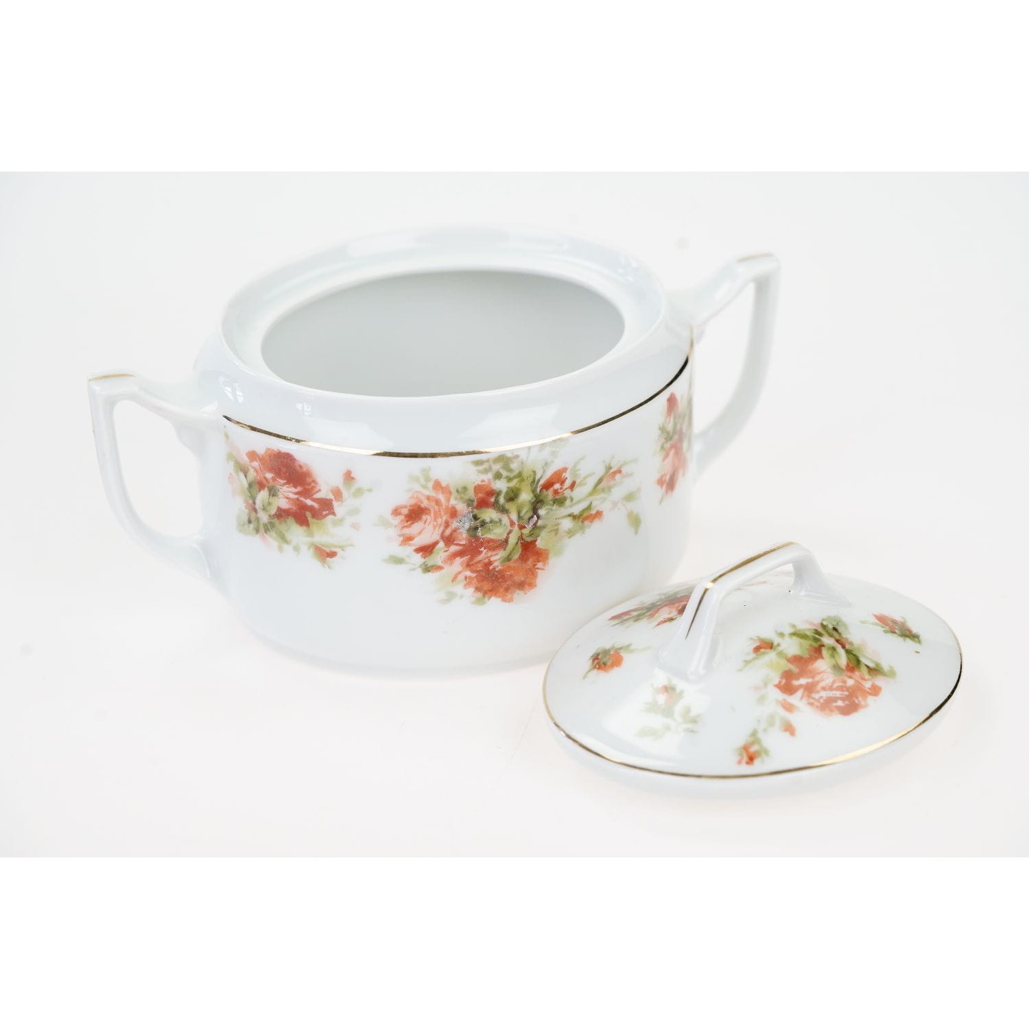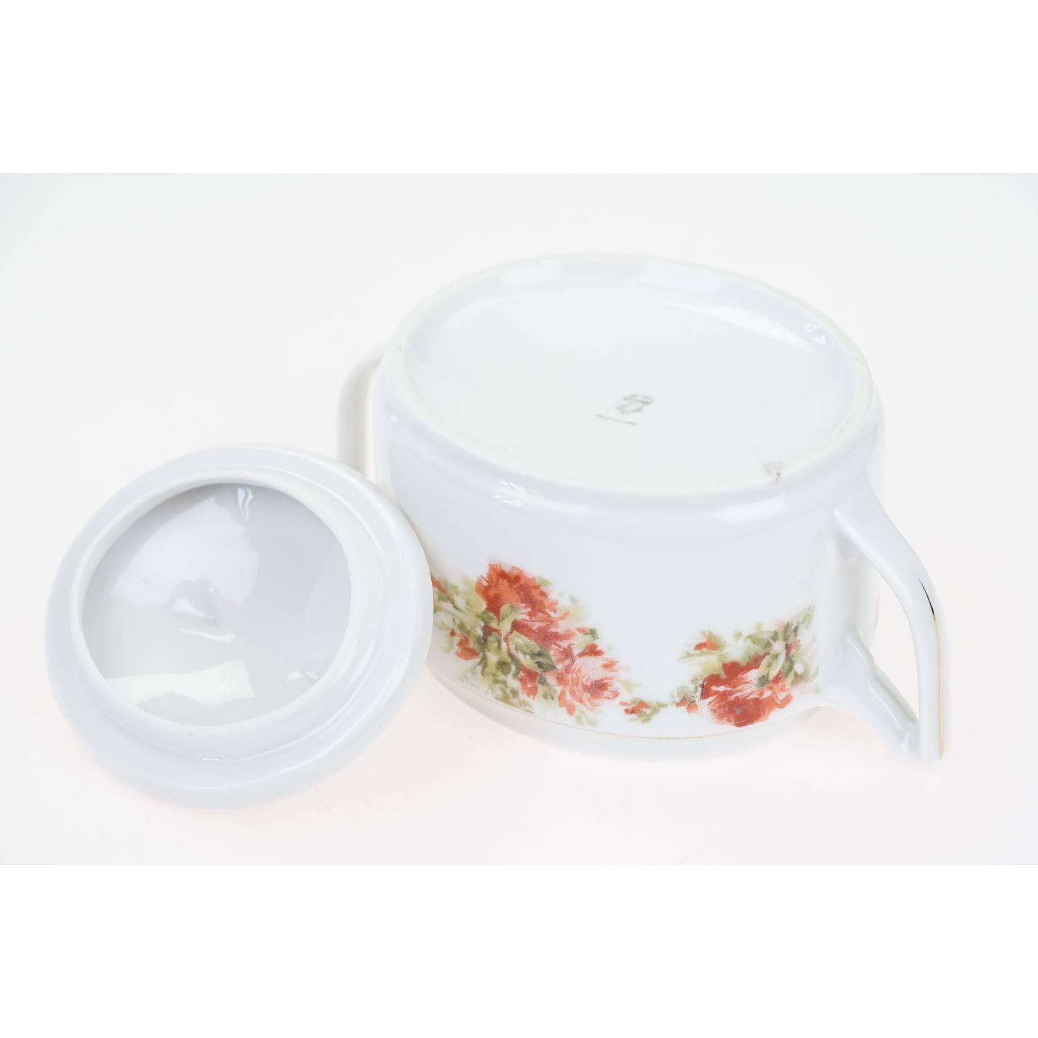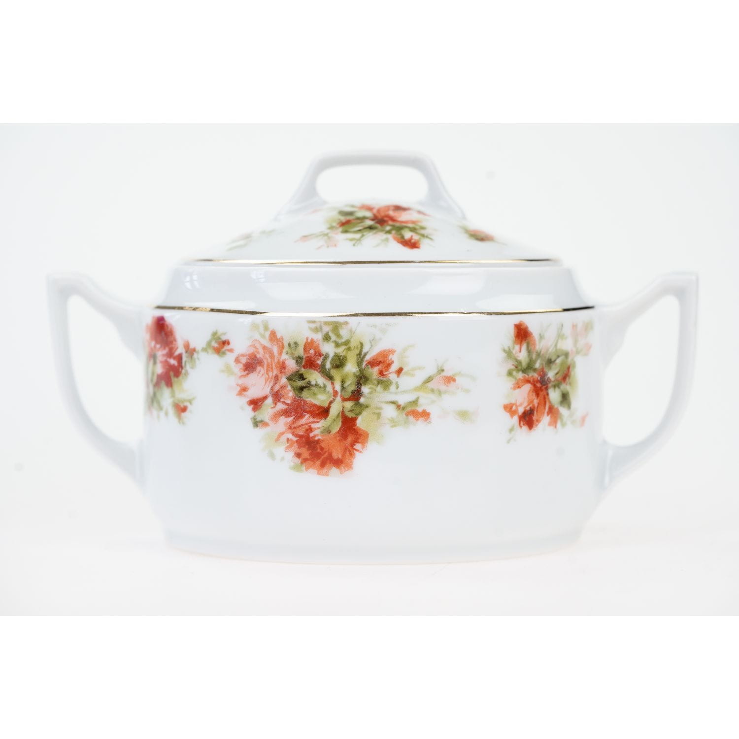 Pochodzi z Czech z miejscowości Loket (niem. Elbogen), z EPIAG - Erste Porzellan-Industrie AG / Karlsbad. Sygnowana znakiem stosowanym od 1920 roku. Bardzo prosta w formie. Ozdobiona dużymi, czerwonymi różami. Ranty, uszka i sterczynka złocone. Robi wrażenie!