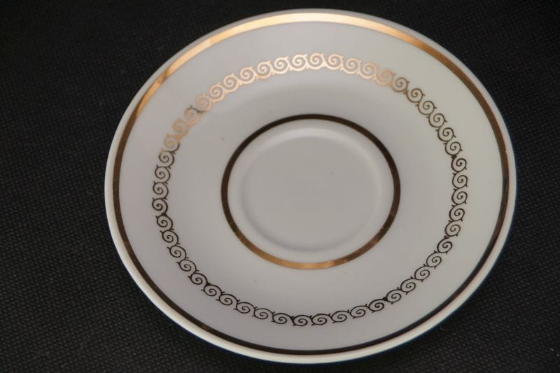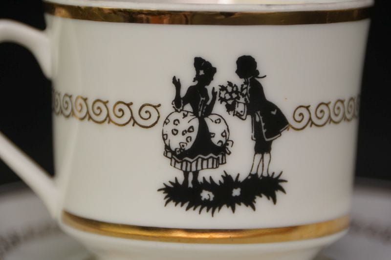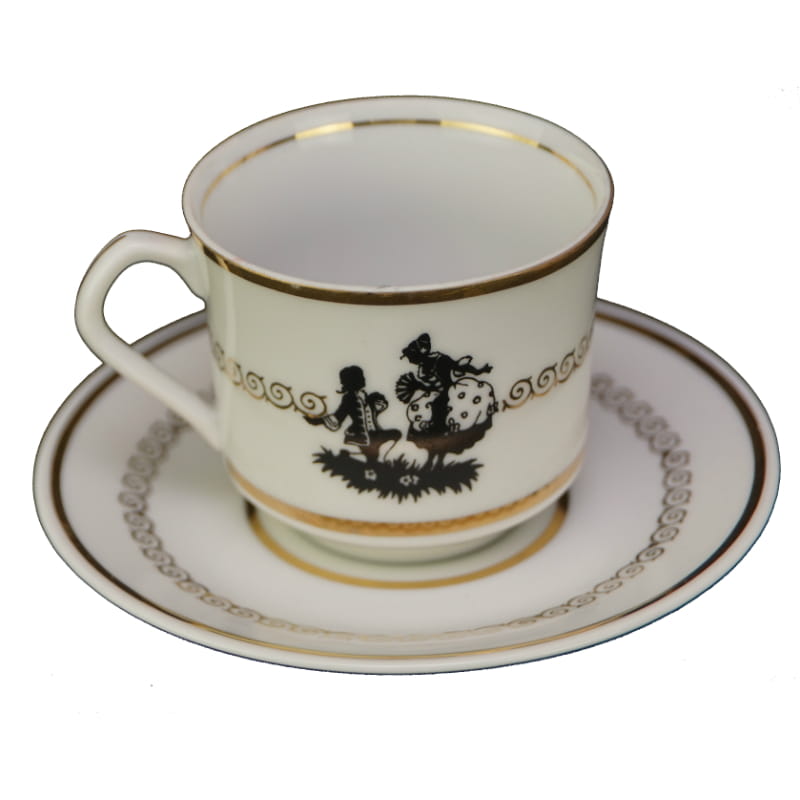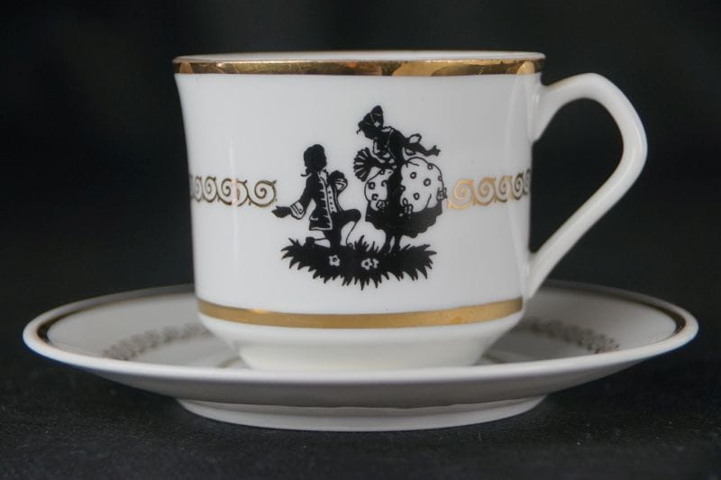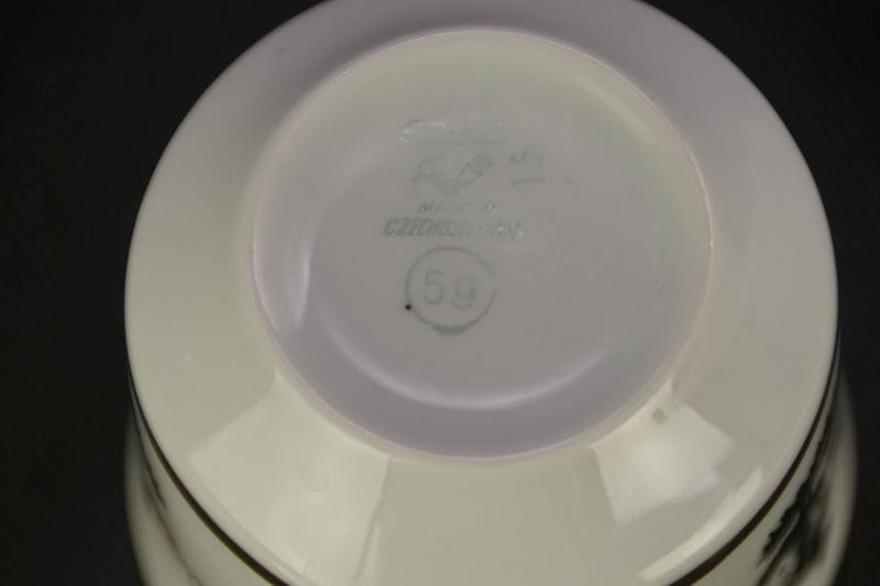 Pochodzi z Czech z Loket (niem. Elbogen), z EPIAG - Erste Porzellan-Industrie AG / Karlsbad. Sygnowana znakiem stosowanym od 1918 do 1938 roku. Porcelana biała, dość gruba, o prostej formie. Filiżanka zdobiona z obu stron romantycznymi scenkami z parami w czarnym kolorze typu schwarzlot, imitującymi stare wycinanki konturowe. Środek zajmuje złoty szlaczek meandrów. Krawędzie i uszko w złoceniu. Na spodeczku powtórzone złocenia i dekoracyjny szlaczek.