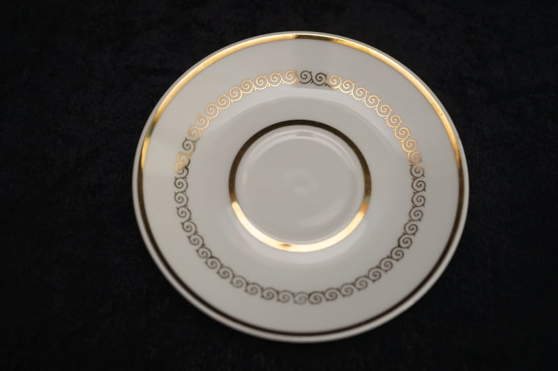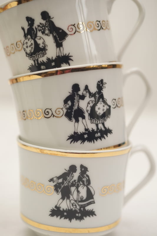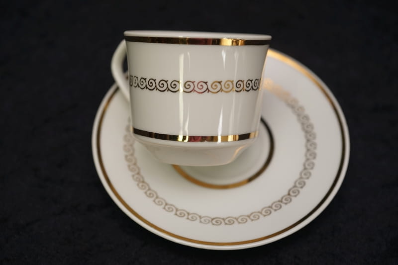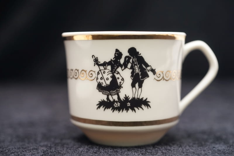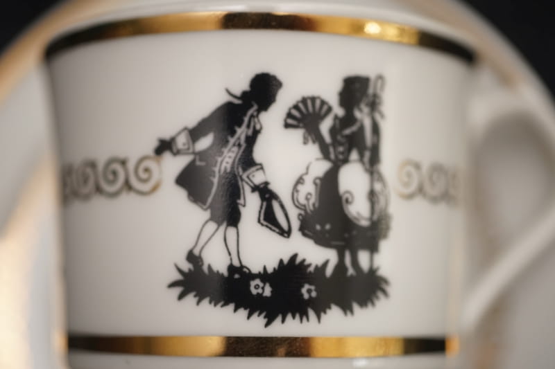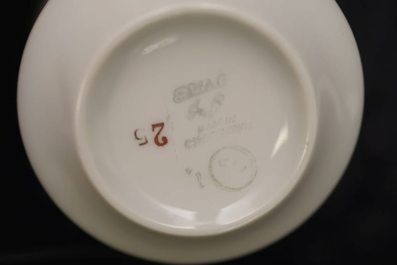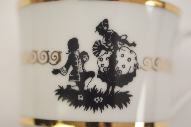Pochodzi z Czech z miejscowości Loket z EPIAG - Erste Porzellan-Industrie AG / Karlsbad, z sygnaturą stosowaną po 1918 roku. Porcelana biała o dość prostej formie. Na białym tle umieszczono tańczącą parę /typu Schwarzlot, inspirowane starymi wycinkami z papieru/. Dekoracja jednostronna. Na filiżance złoty szlaczek zawijasów, powtórzony też na spodku. Ranty i uszko złocone.