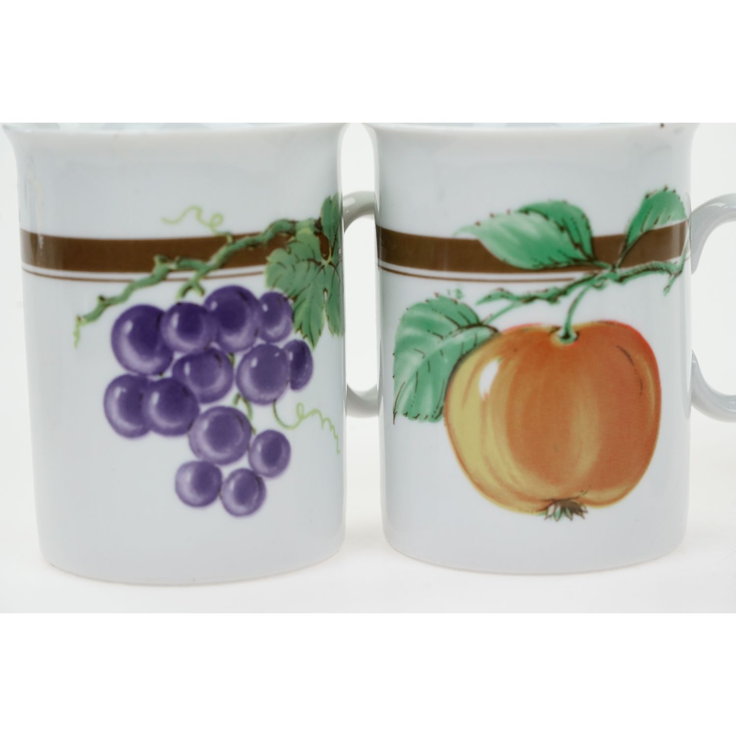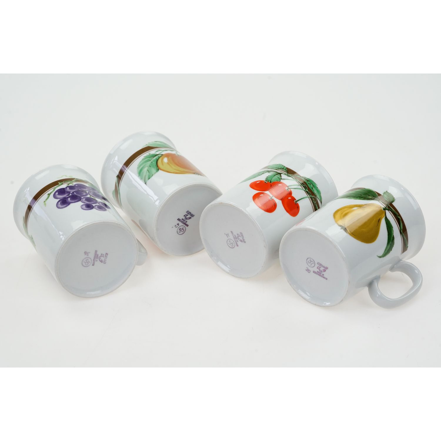 Bardzo ładny komplet smukłych kubków z motywami owocowymi.