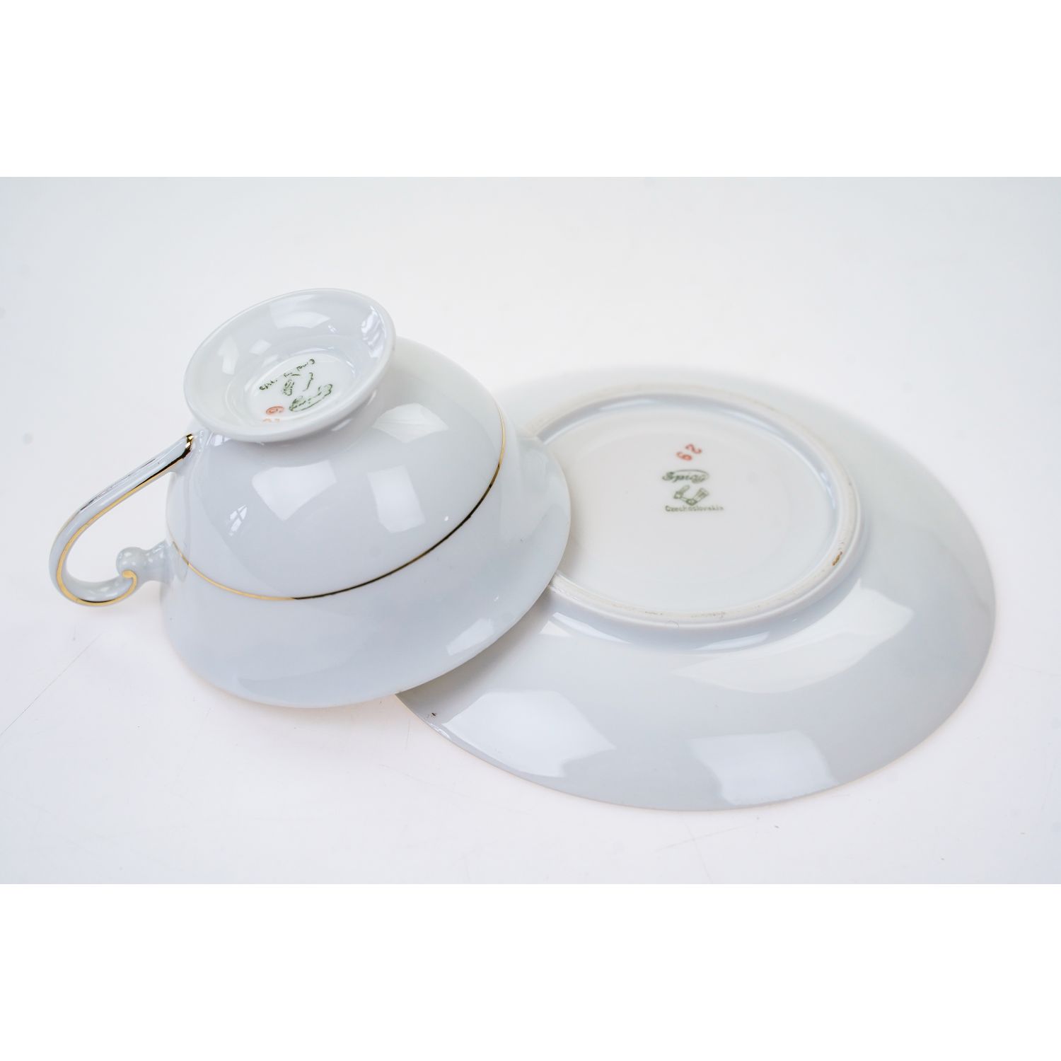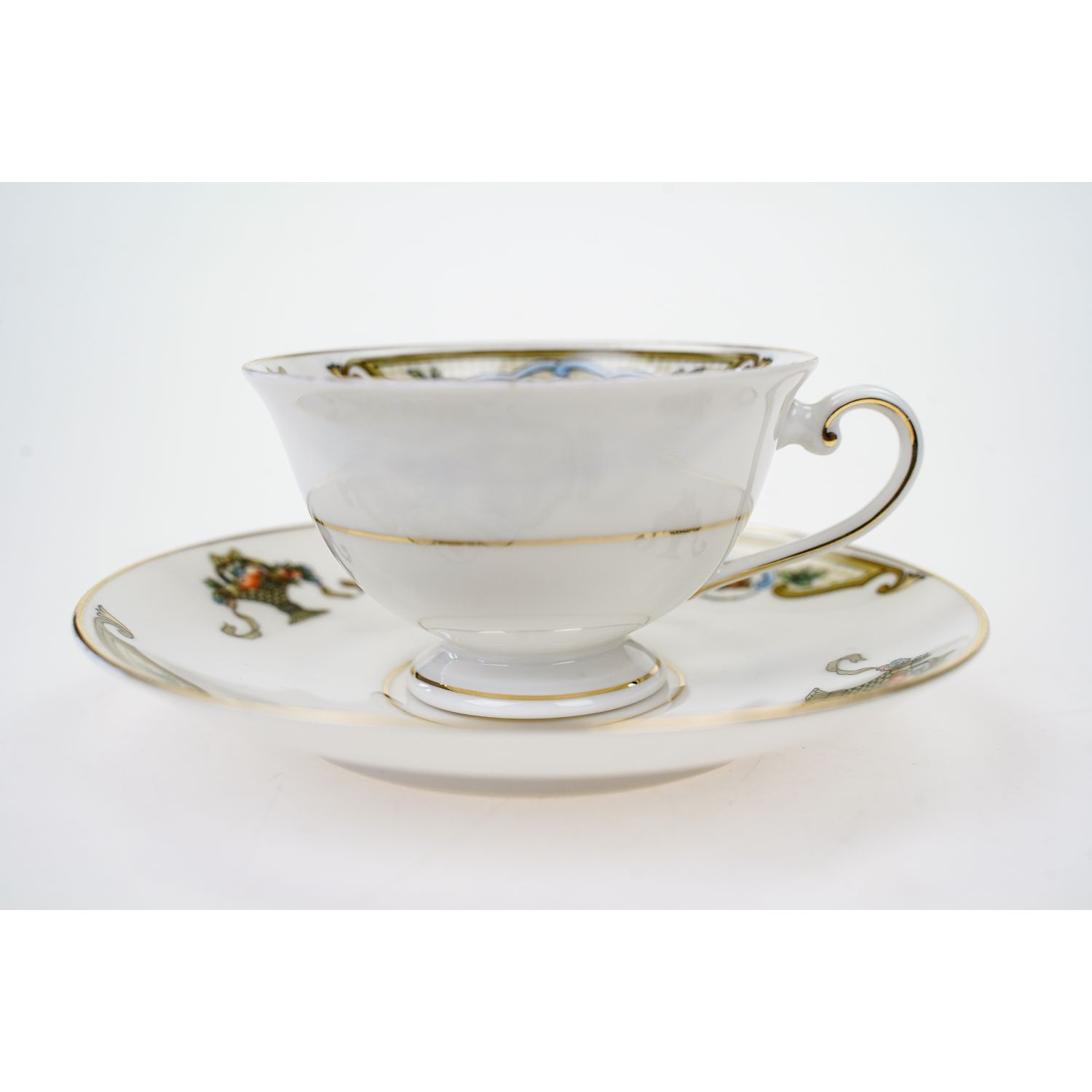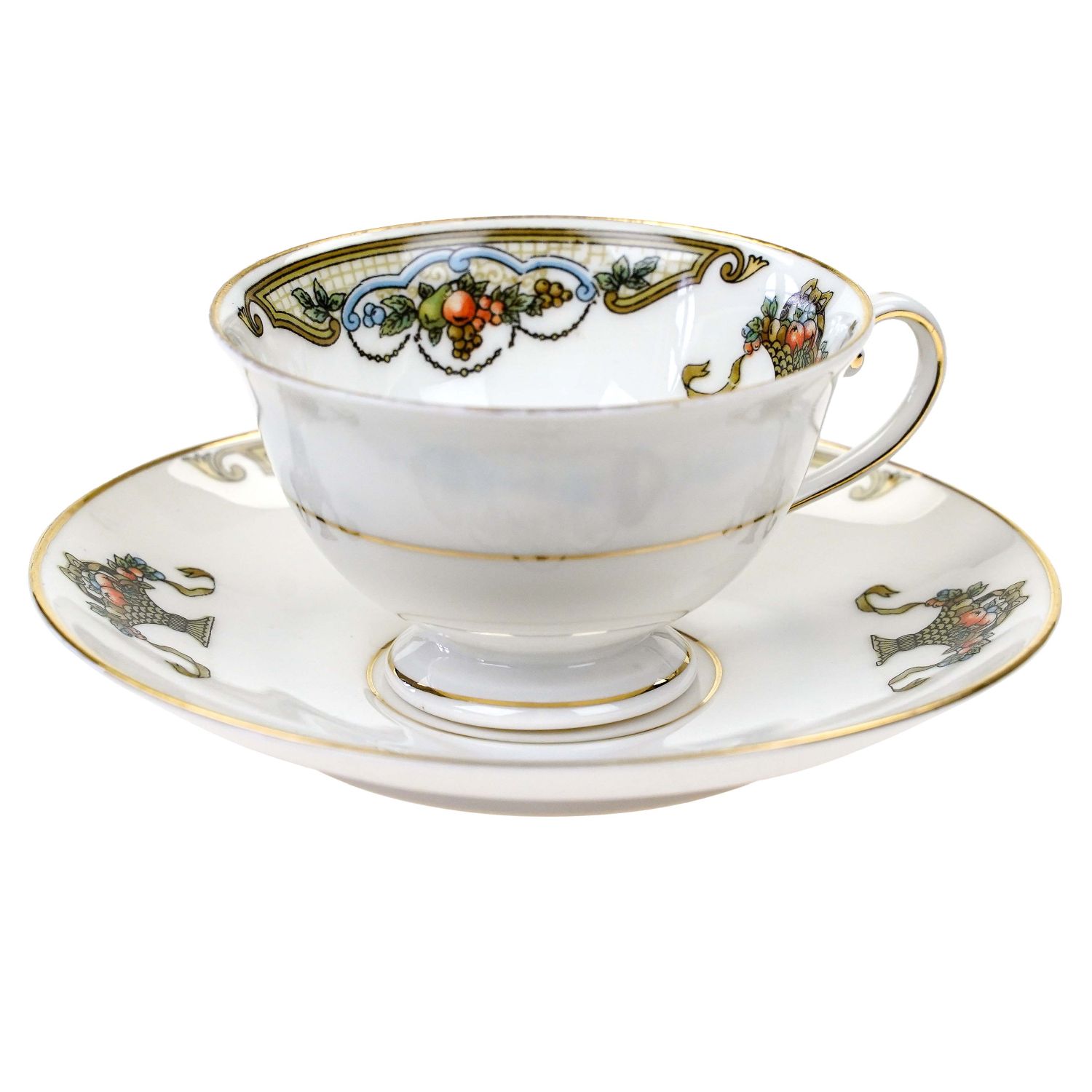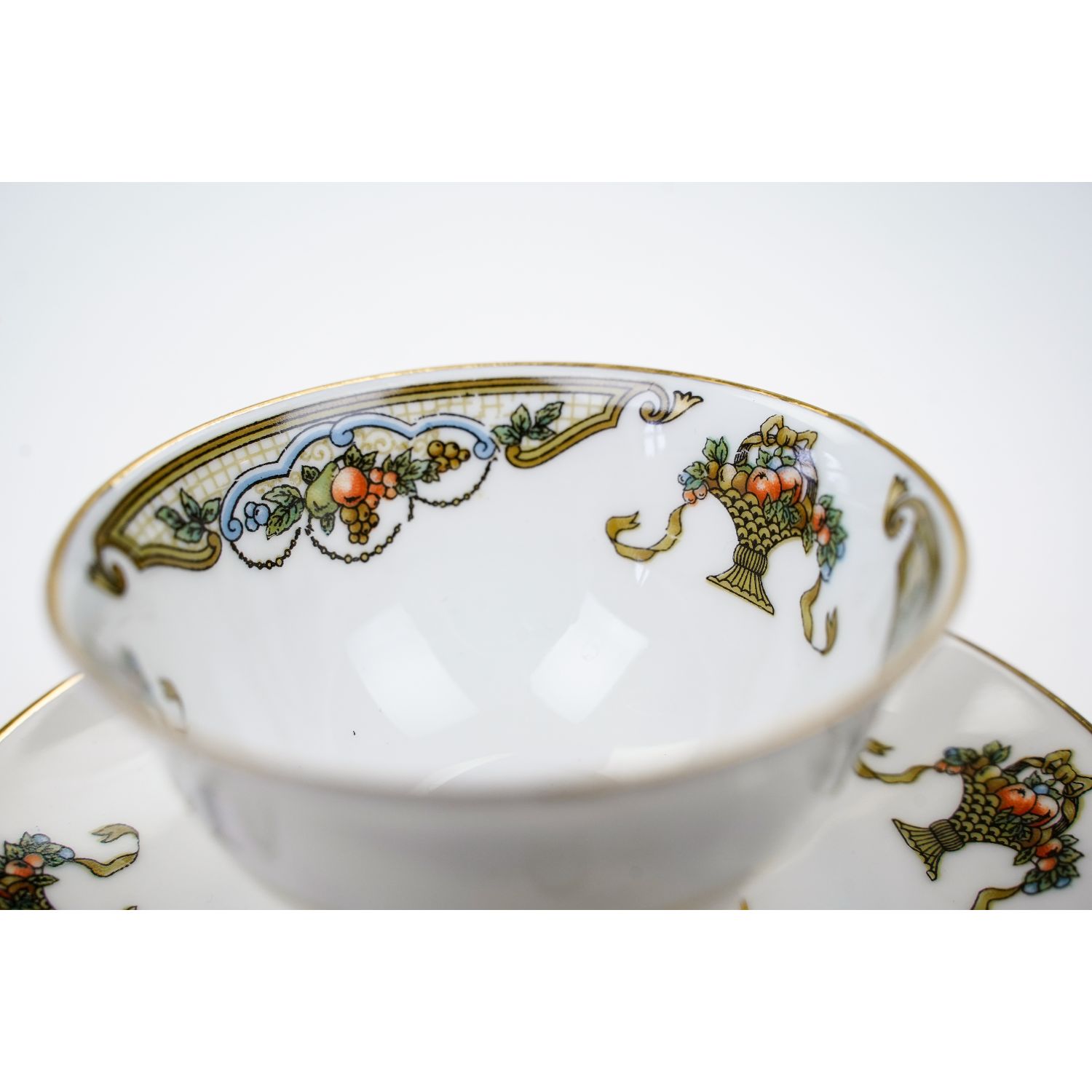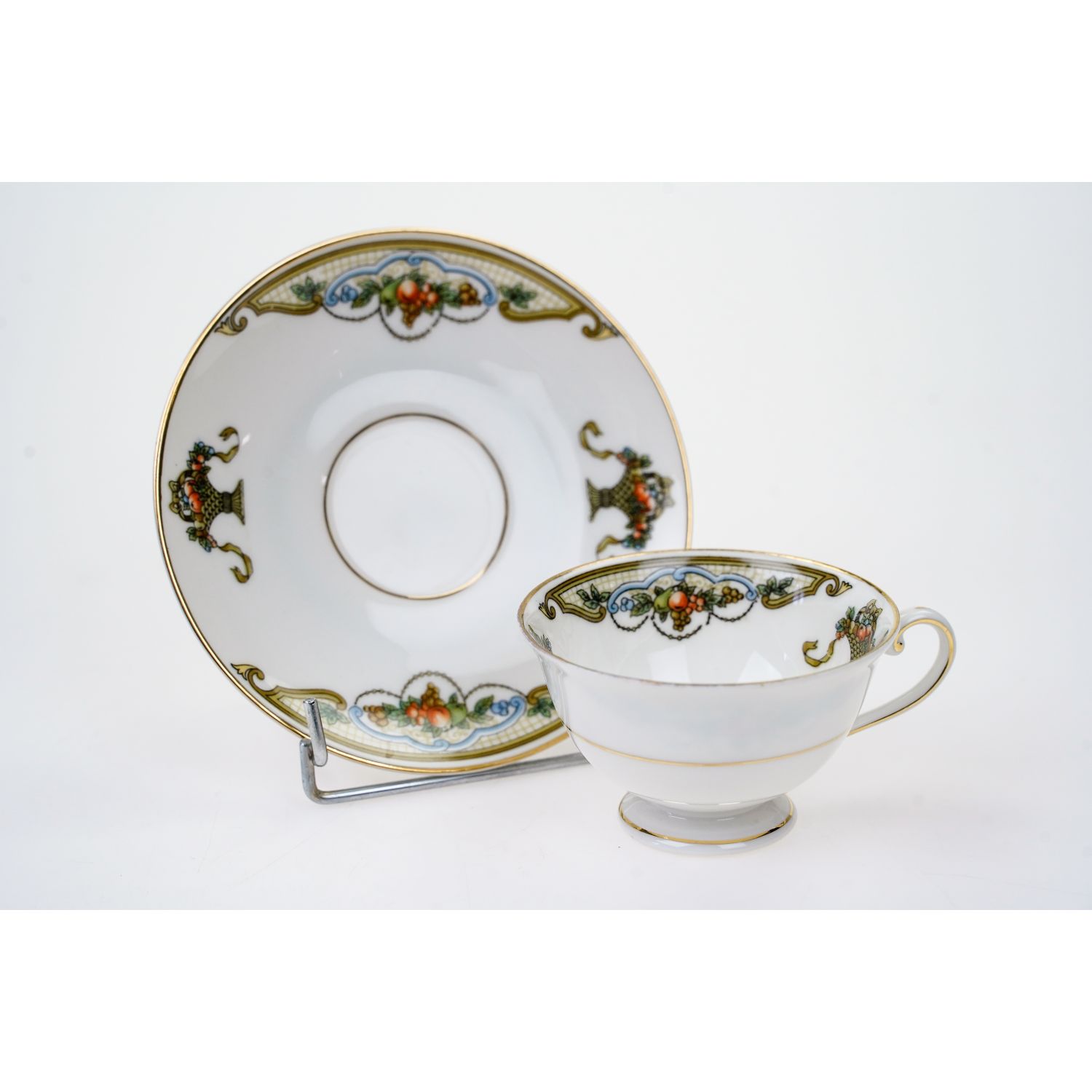 Porcelana w kolorze białym, dość delikatna (zwłaszcza filiżanka) o klasycznym kształcie na stópce. Piękna, ponadczasowa, klasyczna forma naczyń. Każdy element dekorowany girlandami owoców i koszami wypełnionymi owocami w beżowych obwódkach. Uszko i kontury złocone.