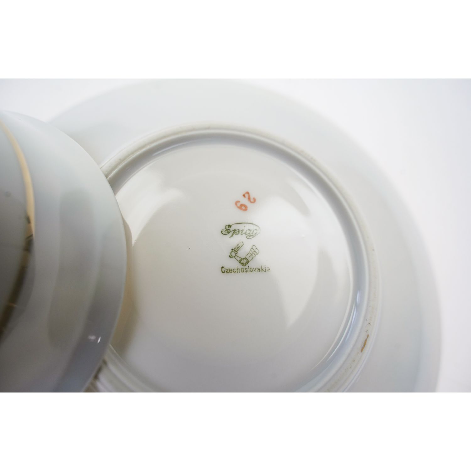 Pochodzi z wytwórni porcelany EPIAG - Erste Porzellan-Industrie AG / Karlsbad z Loket (niem. Elbogen). Sygnatura stosowana od 1920 do 1938 roku.