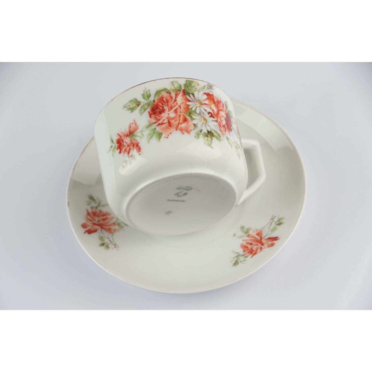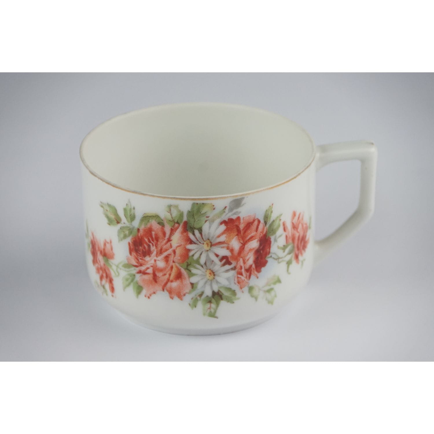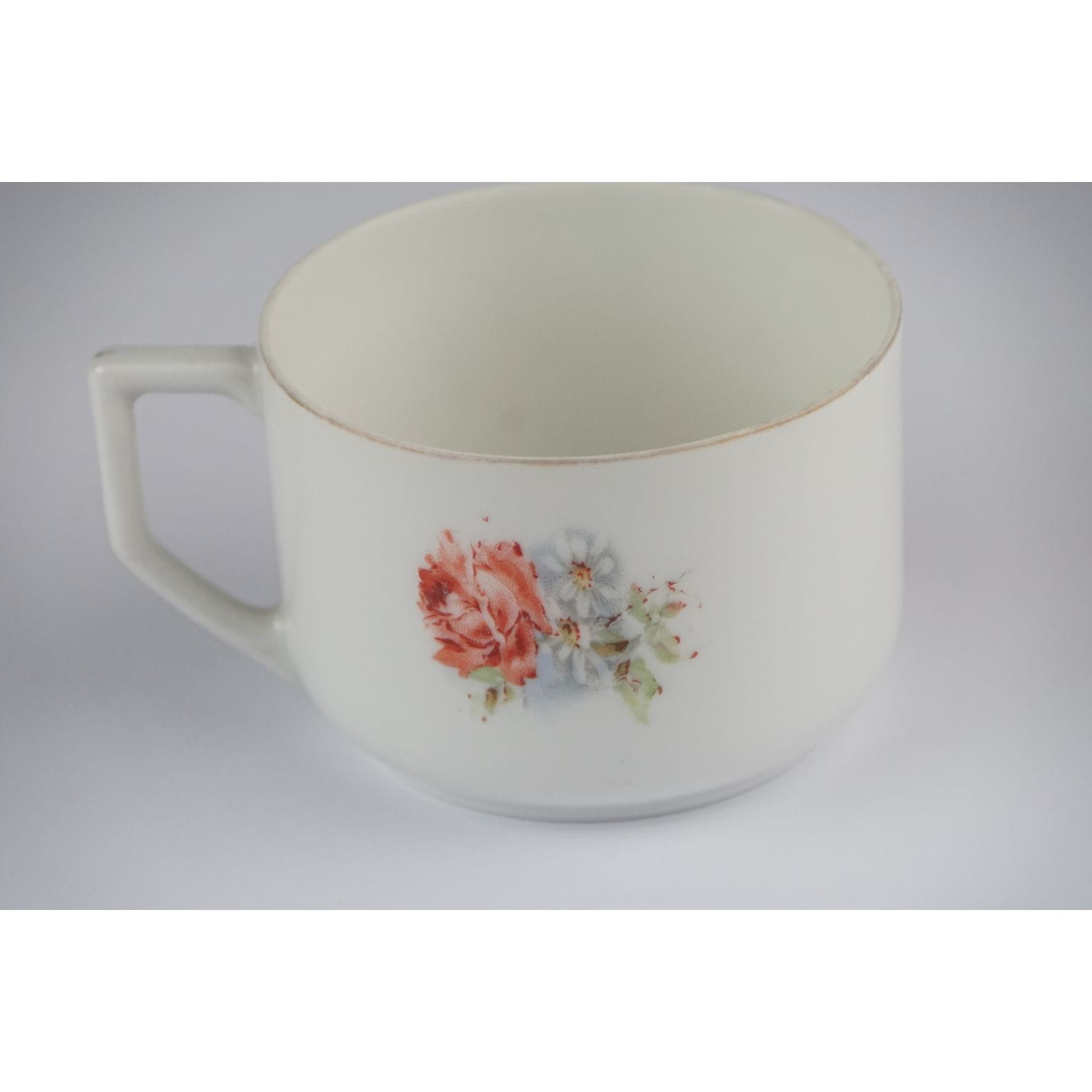 Bardzo prosta w formie. Z jednej strony filiżanki duży bukiet róż i stokrotek, z drugiej mały. Na kołnierzu spotka mały bukiecik i pojedyncze różyczki. Ranty złocone, w niektórych miejscach złocenia lekko poprzecierane. Filiżanka z delikatnej, prześwitującej porcelany. Przyjemna, praktyczna i ładna!