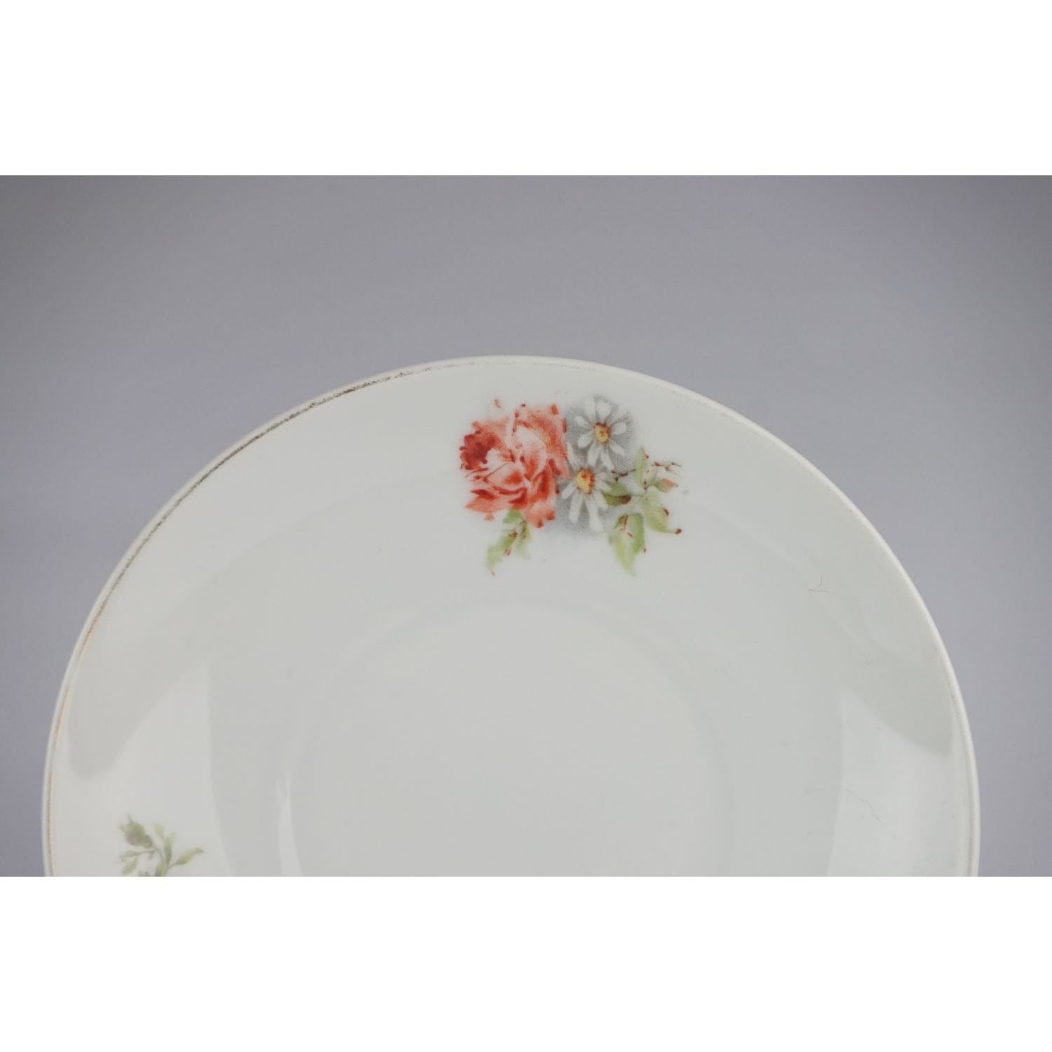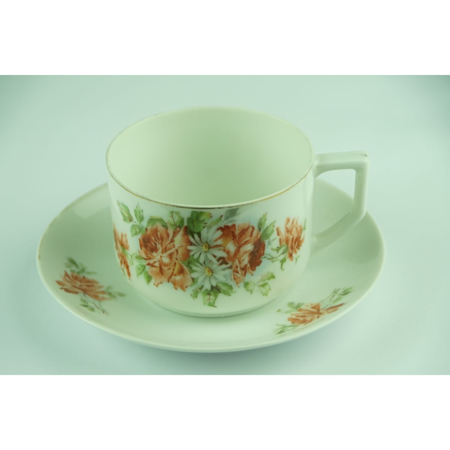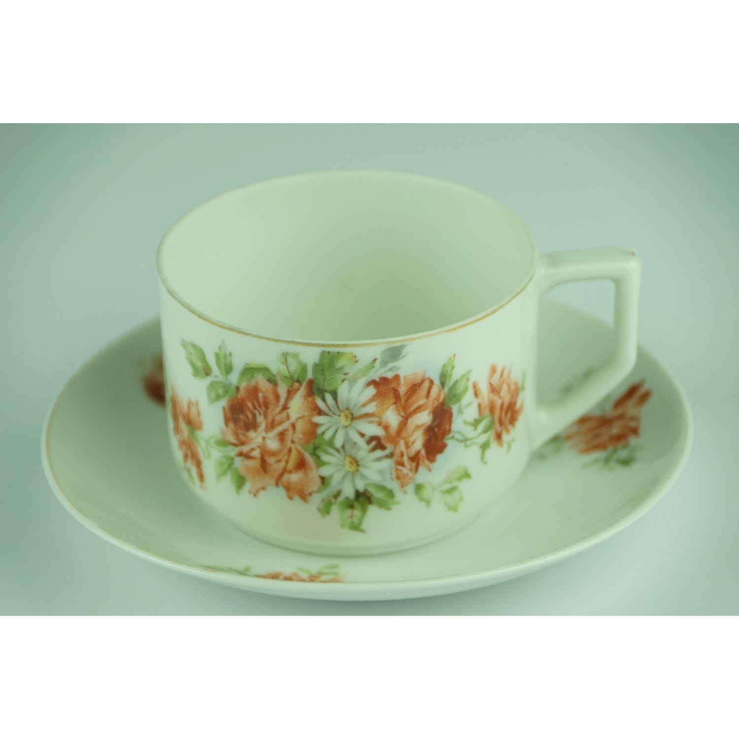 Bardzo prosta w formie. Z jednej strony filiżanki duży bukiet róż i stokrotek, z drugiej mały. Na kołnierzu spotka mały bukiecik i pojedyncze różyczki. Ranty złocone, w niektórych miejscach złocenia lekko poprzecierane. Filiżanka z delikatnej, prześwitującej porcelany. Przyjemna, praktyczna i ładna!