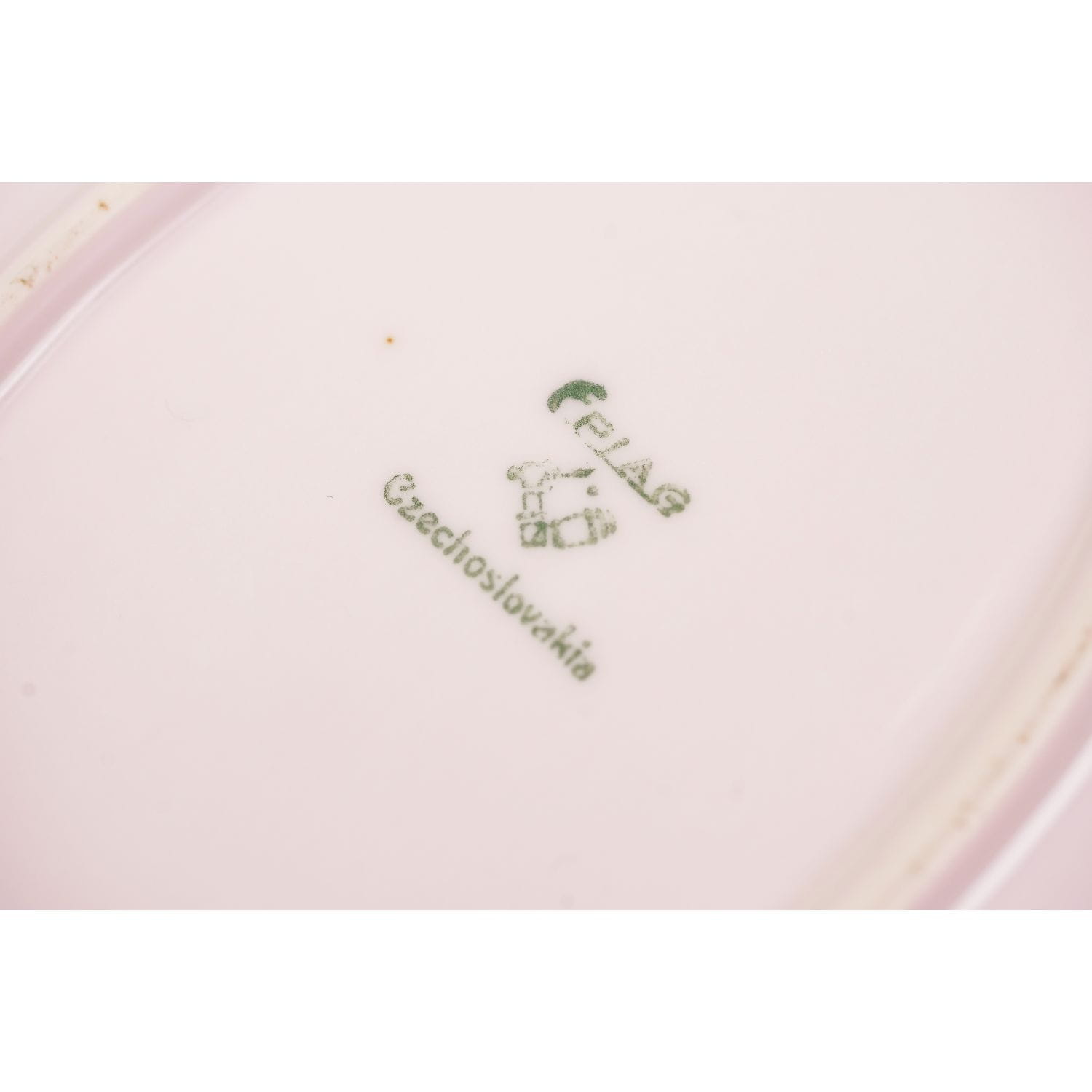 Pochodzi z Czech z Bohemii z miejscowości Loket (niem. Elbogen), z EPIAG - Erste Porzellan-Industrie AG / Karlsbad. Sygnatura stosowana od 1920 do 1938 roku. Kolor porcelany różowy, który uzyskuje się poprzez dodatek złota. Ranty w złoceniu. Na porcelanie złote kwiaty róż i złocenia na konturach.