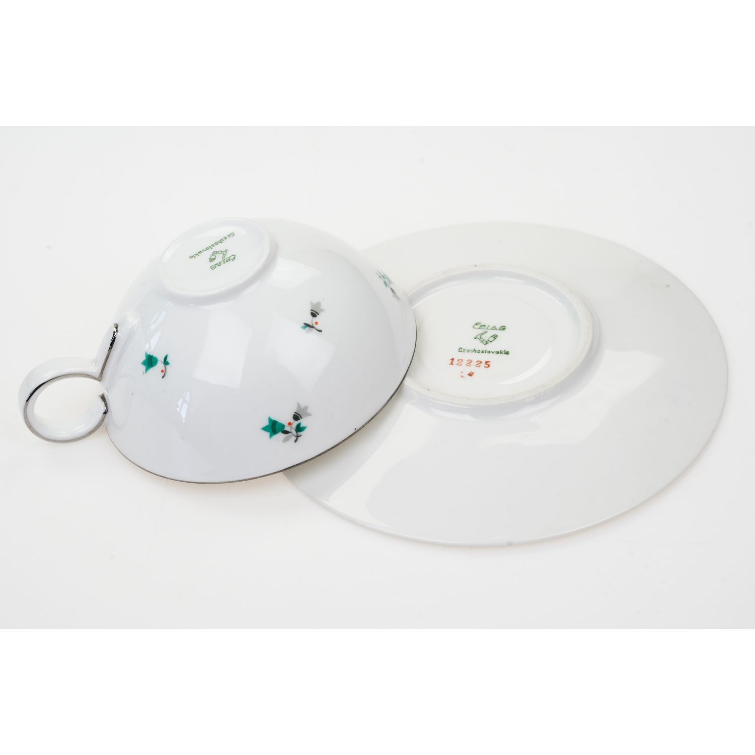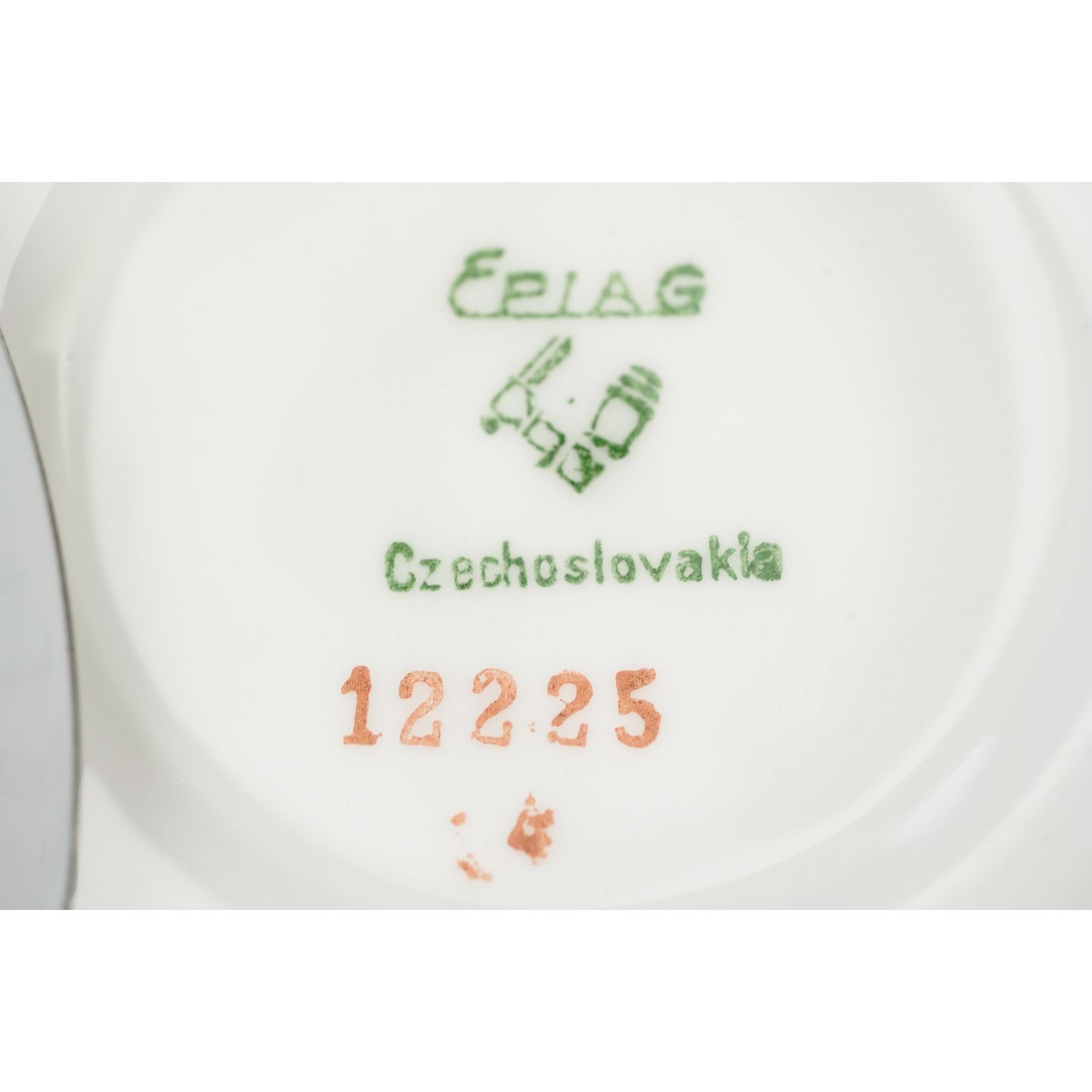 Pochodzi z Czech z Bohemii z miejscowości Loket (niem. Elbogen), z EPIAG - Erste Porzellan-Industrie AG / Karlsbad. Sygnatura stosowana od 1920 do 1938 roku. Kolor porcelany biały. Ranty w srebrze. Na porcelanie rozrzucone drobne kwiatki w stylu epoki.