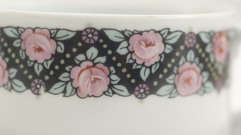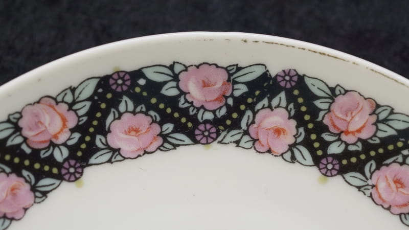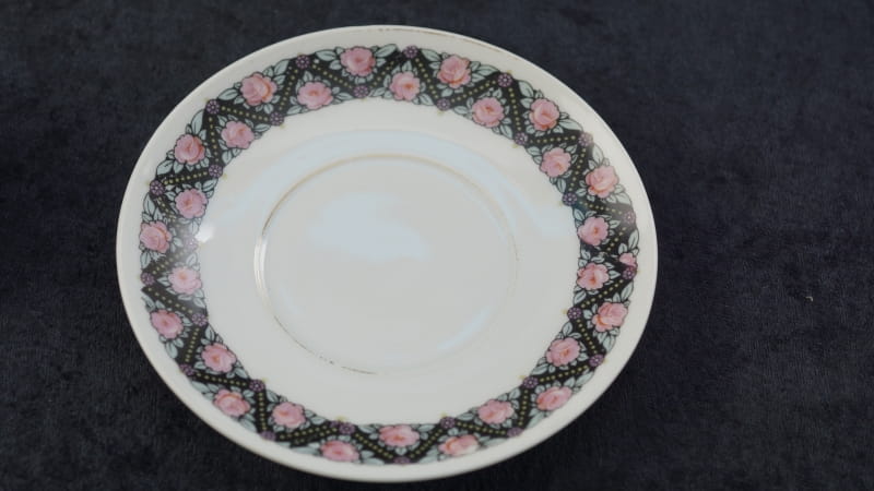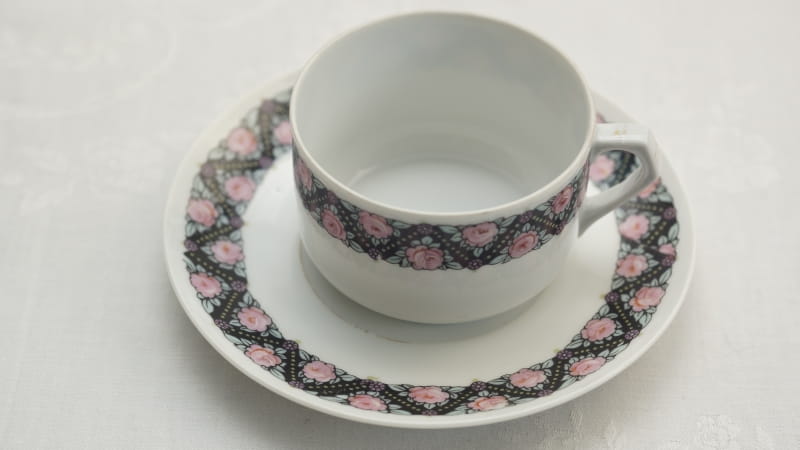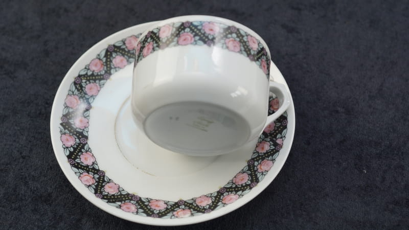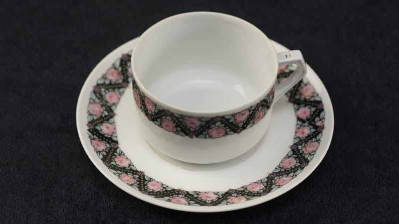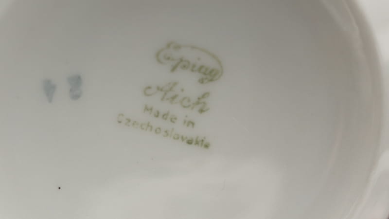 Pochodzi z Czech z miejscowości Doubí (niem. Aich), z EPIAG - Erste Porzellan-Industrie AG / Karlsbad . Sygnowana znakiem stosowanym od 1923 roku. Porcelana w odcieniu bieli, dość delikatna. Zdobiona uroczym szlaczkiem róż przy górnej krawędzi filiżanki i na kołnierzyku spodka. Kontury i uszko kiedyś złocone, dzisiaj złocenia w śladowych ilościach.