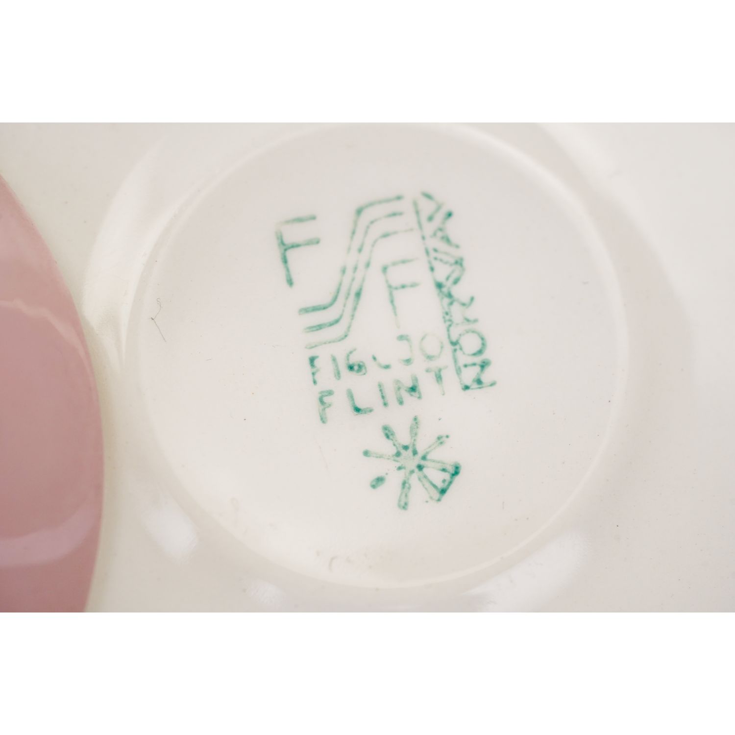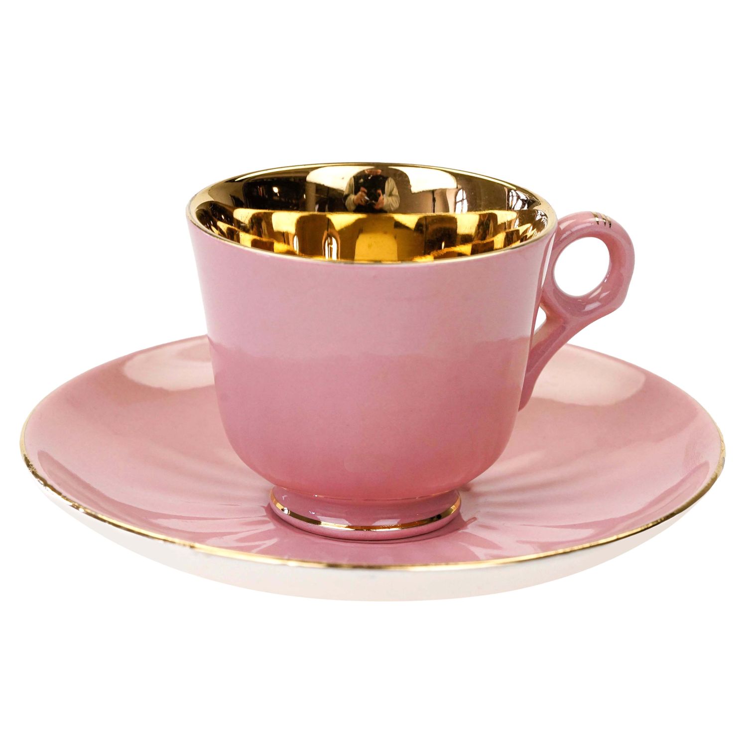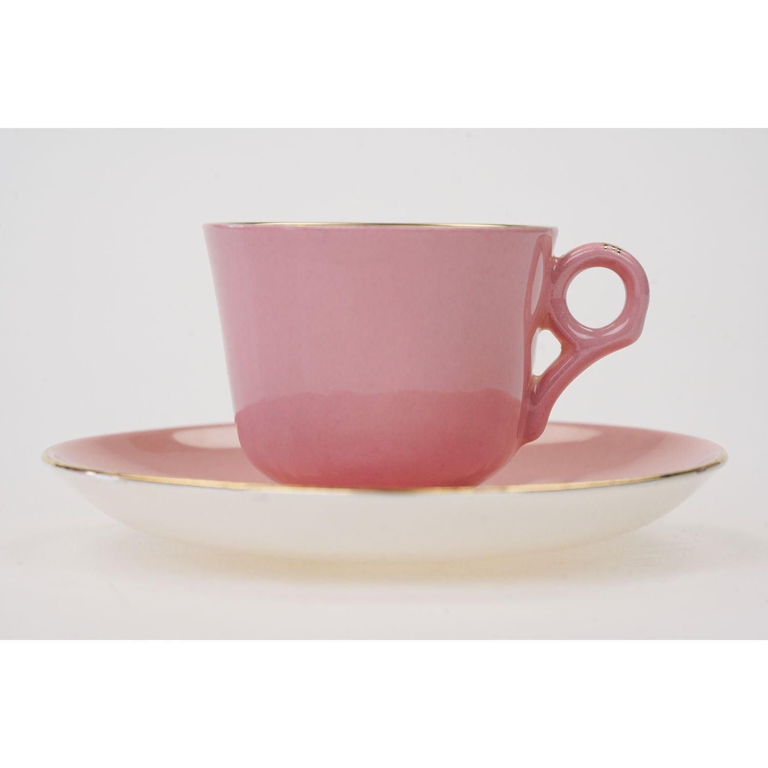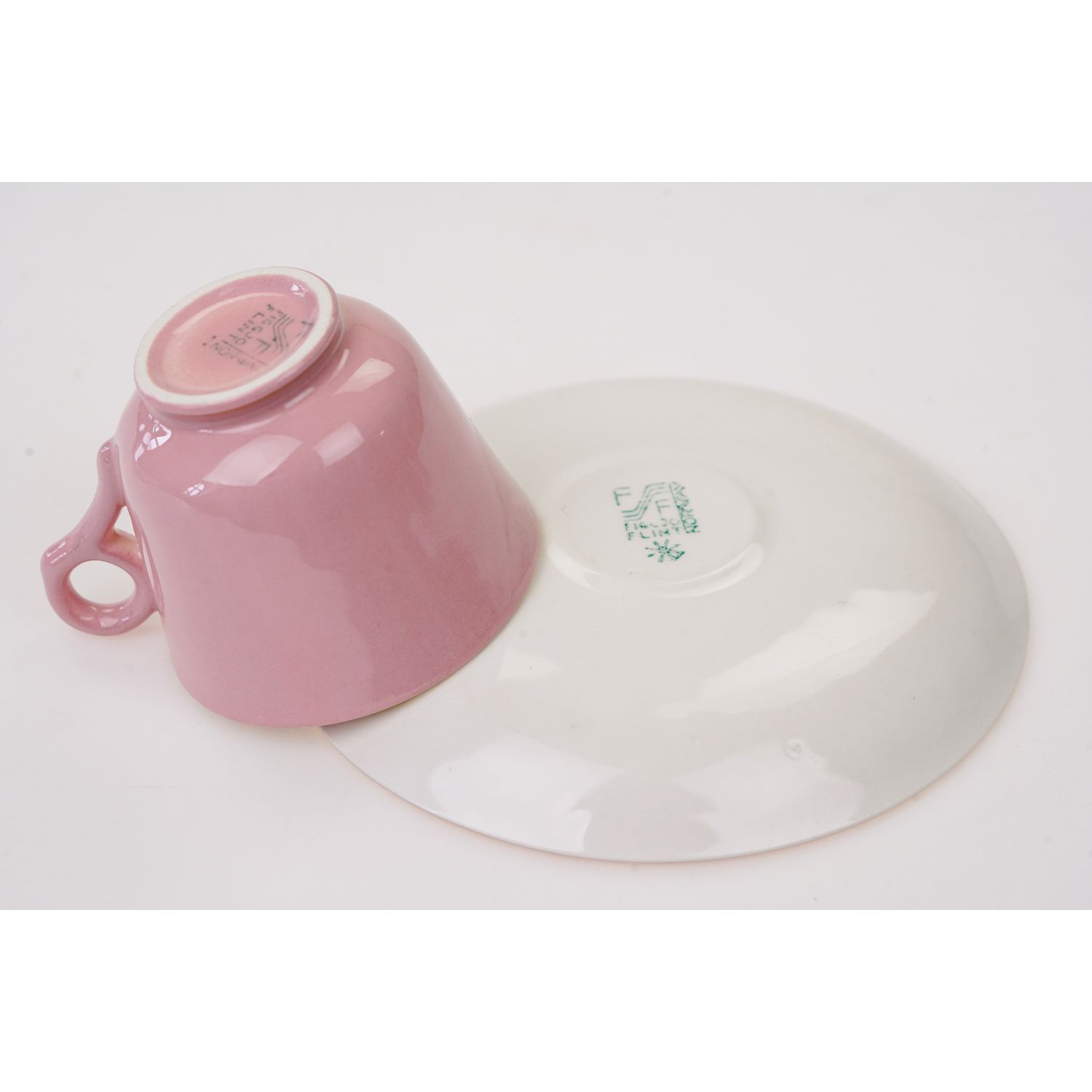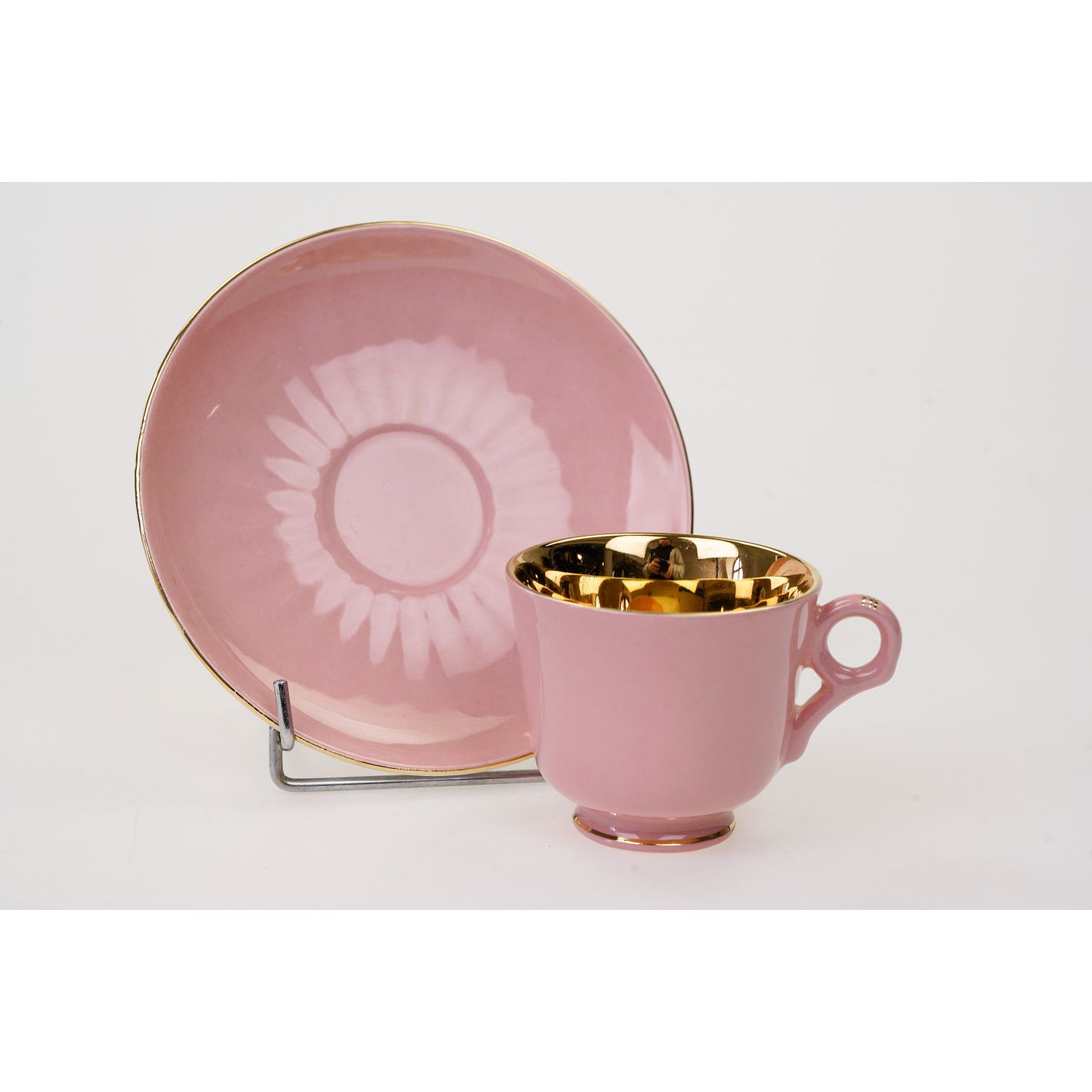Pochodzi z Norwegii z wytwórni Figgjo Flint. Jest to projekt w stylu skandynawskim z połowy XX wieku, wyprodukowany w latach 50-tych XX wieku. Marka Figgjo słynie z kunsztu i dbałości o detale, dzięki czemu zestaw jest zarówno funkcjonalny, jak i estetyczny. Doda odrobinę skandynawskiego designu na stole dzięki temu uroczemu i ponadczasowemu zestawowi. Wykonany z ceramiki, podobnej do porcelitu. Oba elementy pokryte różowym malaturą. Wnętrze filiżanki w złocie. Filiżanka z fikuśnym uszkiem. To nie jest typowy zestaw produkowany masowo. Zaprojektowano go jako stylowy zestaw do kawy i przyjęć herbacianych w złotej erze skandynawskiego wzornictwa.
