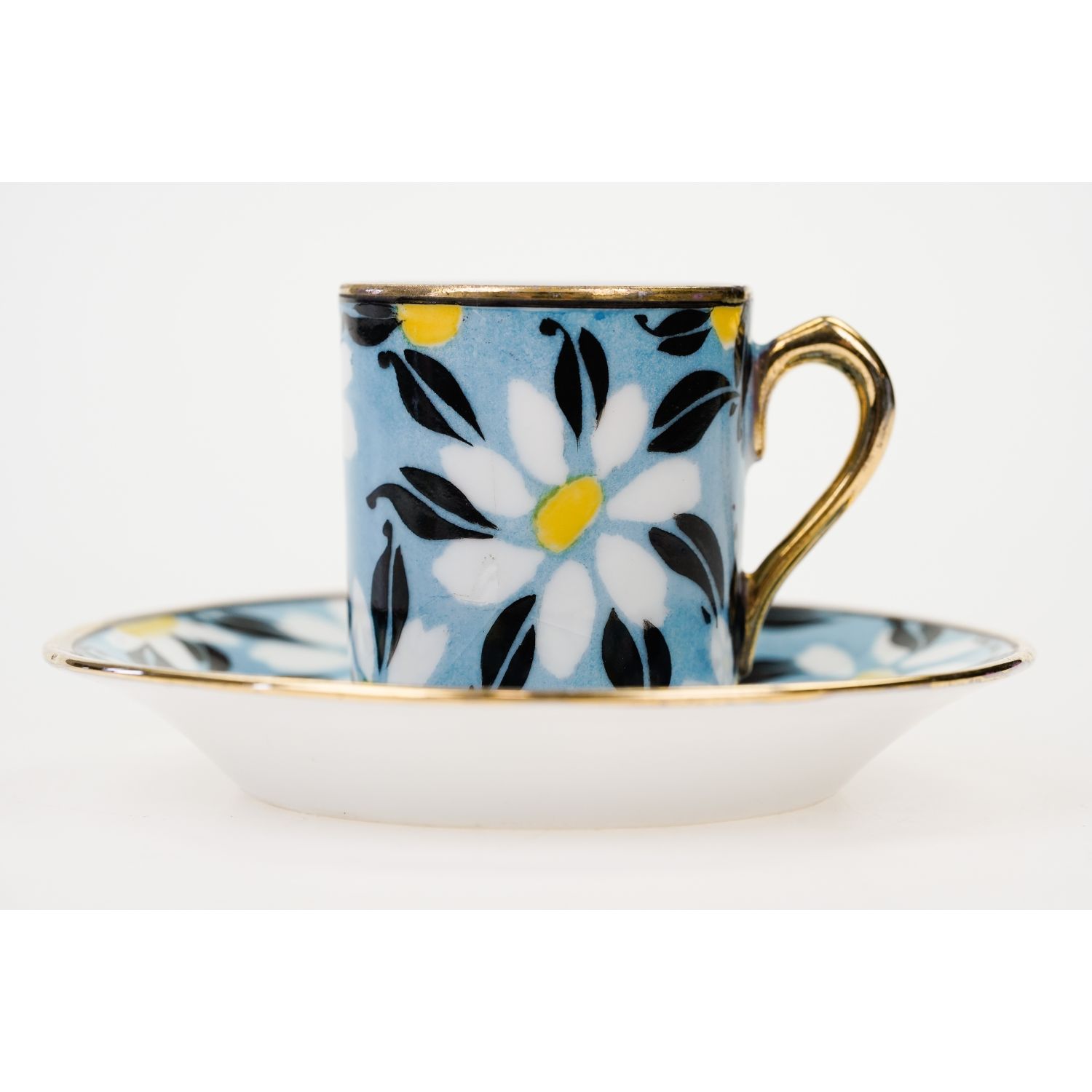 Porcelana w odcieniu bieli, prosta filiżanka, delikatna. Oba elementy ozdobione ręcznie malowanymi, dużymi kwiatami. Kolorystyka w odcieniach błękitu, czerni i żółci. Złotem udekorowano kontury i w pełni pozłocono uszko.