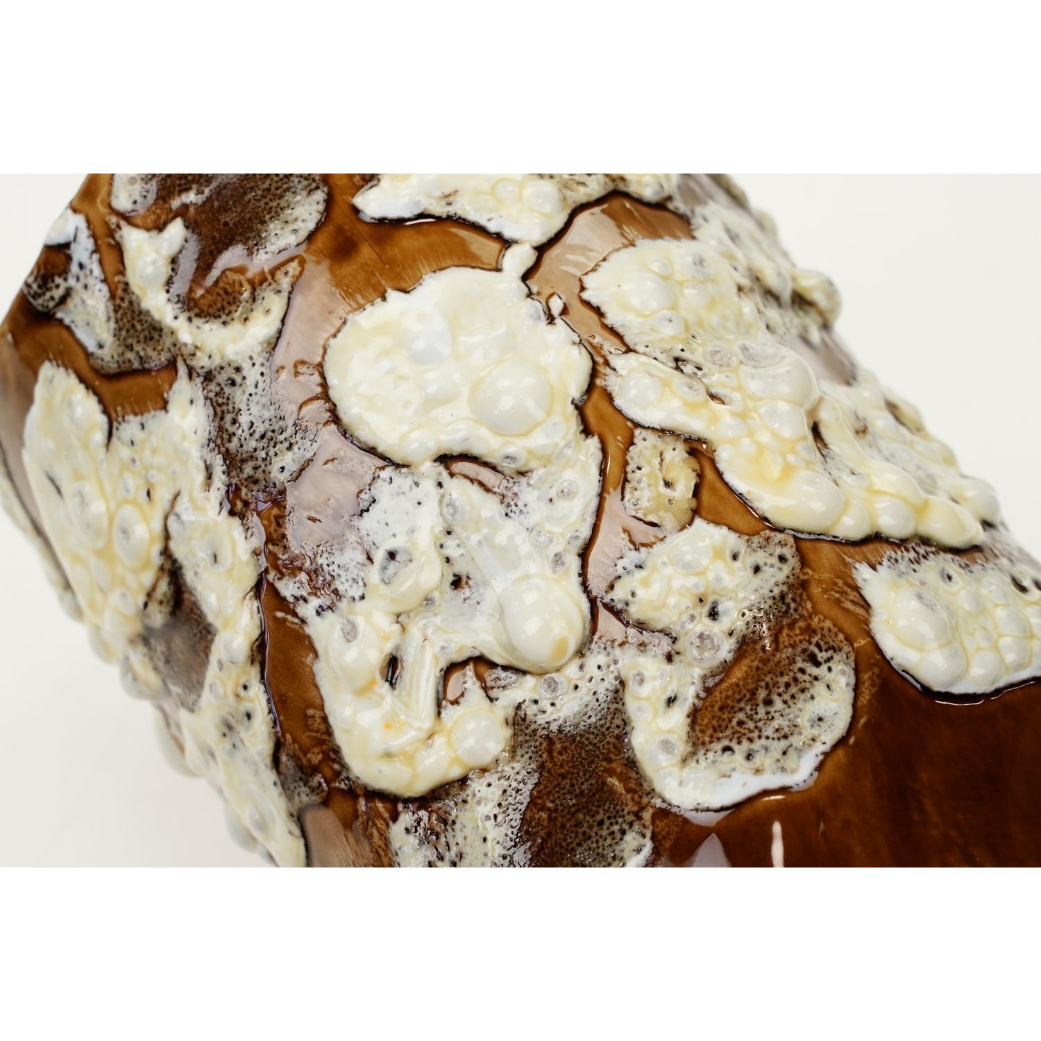 Charakteryzujący się ręcznie formowaną, trójwymiarową fakturą. Powierzchnia pokryta jest kombinacją szkliw błyszczących i satynowych. Duży i naprawdę efektowny wazon w stylu francuskim z połowy XX wieku, wyjątkowo dekoracyjny, który doskonale sprawdzi się jako wazon do aranżacji kwiatowych. Zachwyca fakturą emalii, przywodzącą na myśl lawę wulkaniczną i wzbogaconą złotymi niuansami przywodzącymi na myśl słodycz miodu.