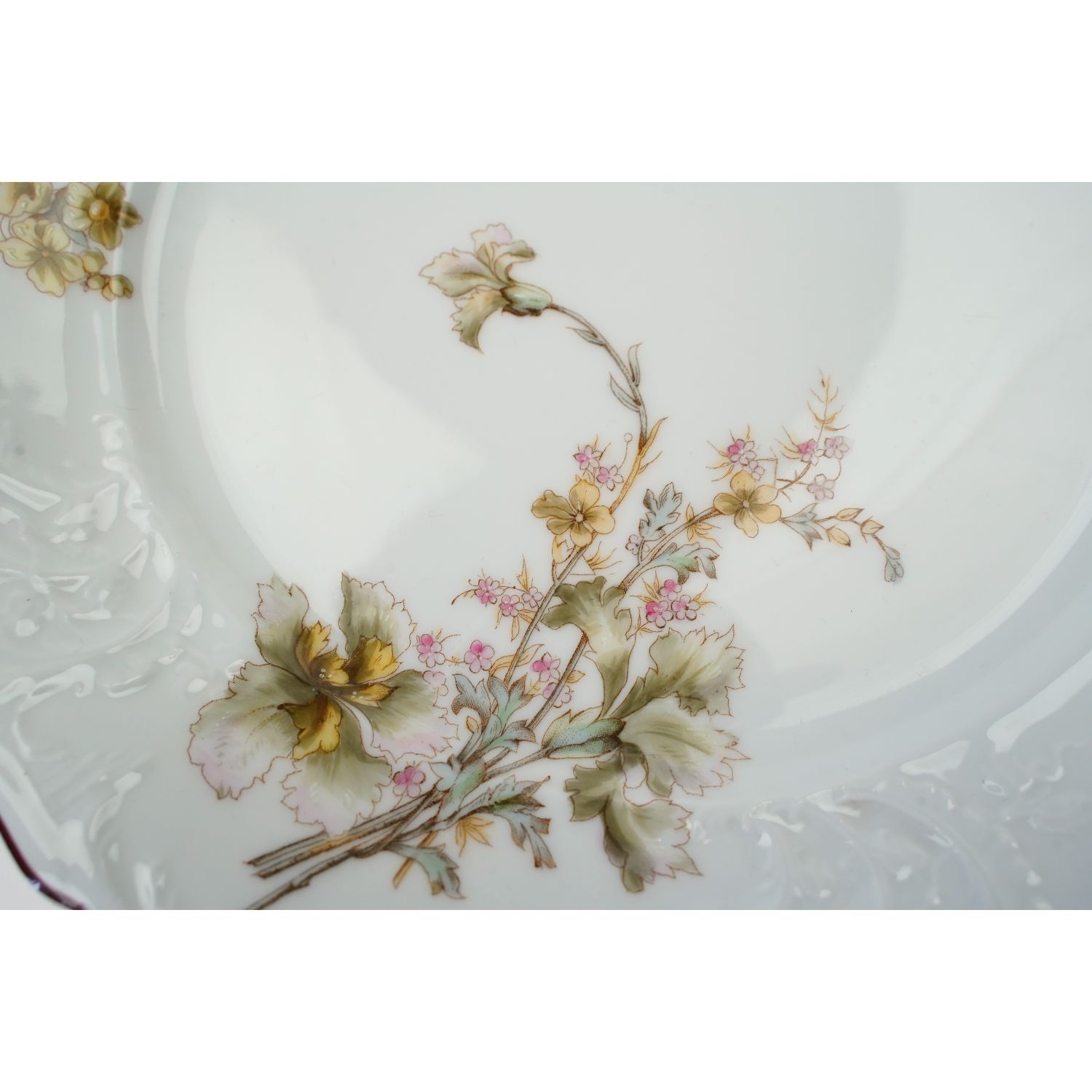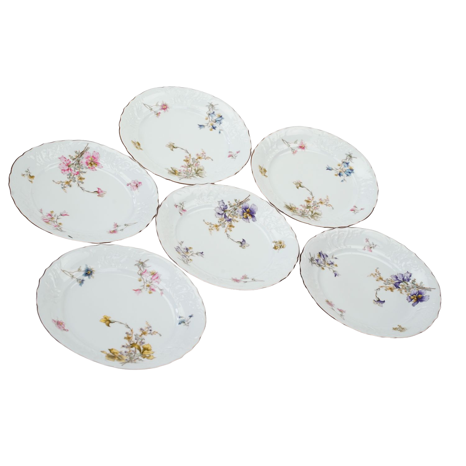 Komplet sześciu ślicznych, zabytkowych talerzy obiadowych z niesamowitymi reliefami i pięknymi, ręcznie malowanymi kwiatami.