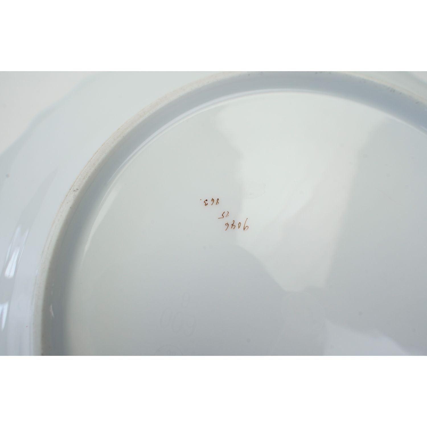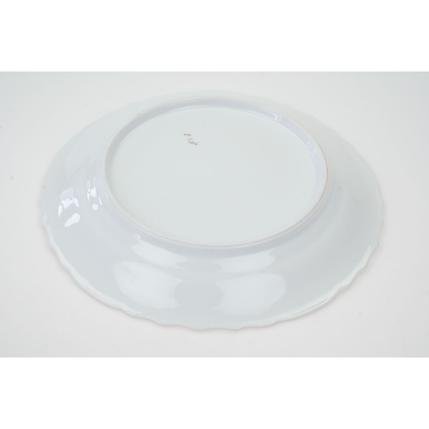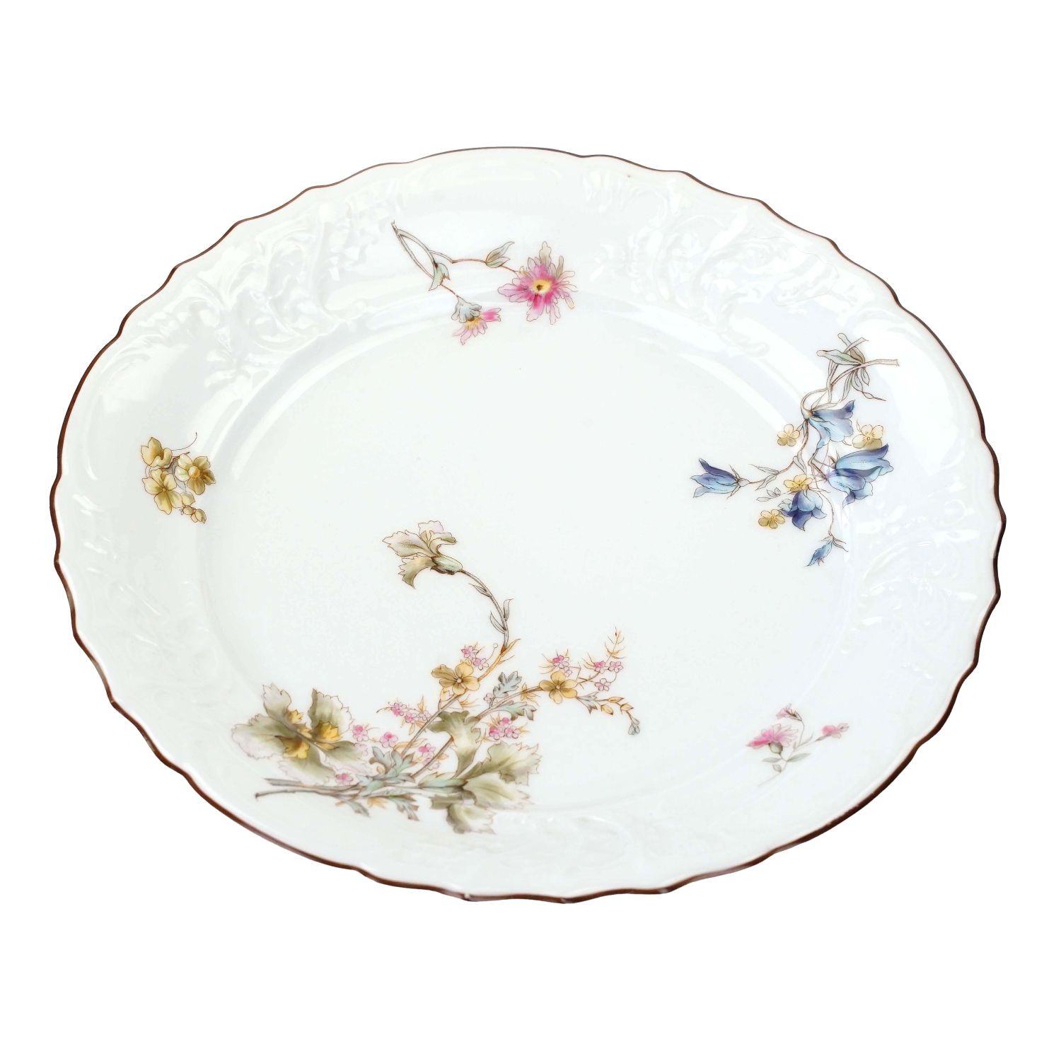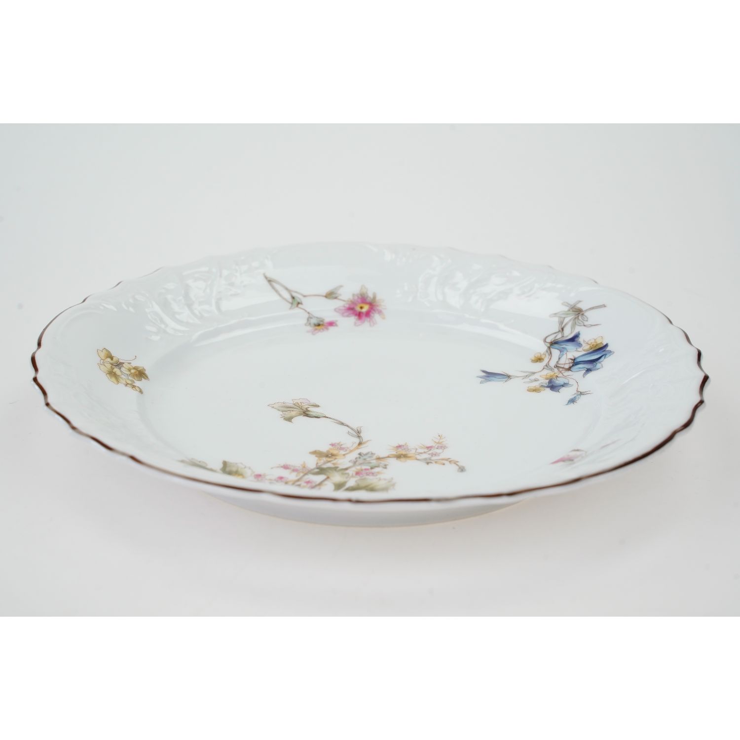Pochodzi z Saksonii z Fraureuth (Von Römer & Foedisch Porzellanfabrik), sygnowany znakiem stosowanym w okresie 1866-1896. Wyciśnięta w masie literka "F" w kółeczku i 119. Talerze wykonane z solidnej, białej porcelany. Z reliefowanym kołnierzem z wzorem Rocaille w stylu rokoko. Z fantazyjnymi deseniami skręconych liści, falujących linii oraz wygięte, nieregularne gałązki. Dekoracje w stylu drezdeńskim, nawiązującą do wyrafinowanej tradycji związanej z odrodzeniem rokoka. Ranty ze brązową konturówką. Na porcelanie piękne, barwne, różnorodne kwiaty. Na poszczególnych talerzach kwiaty w różnych kolorach.