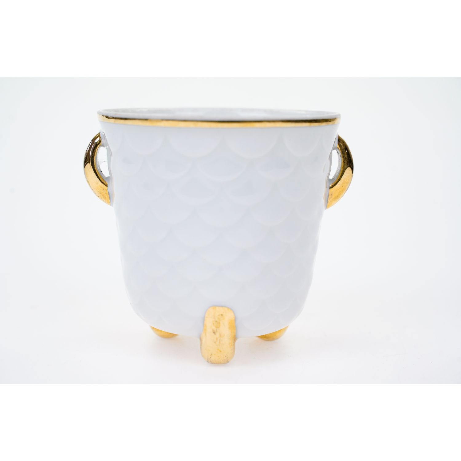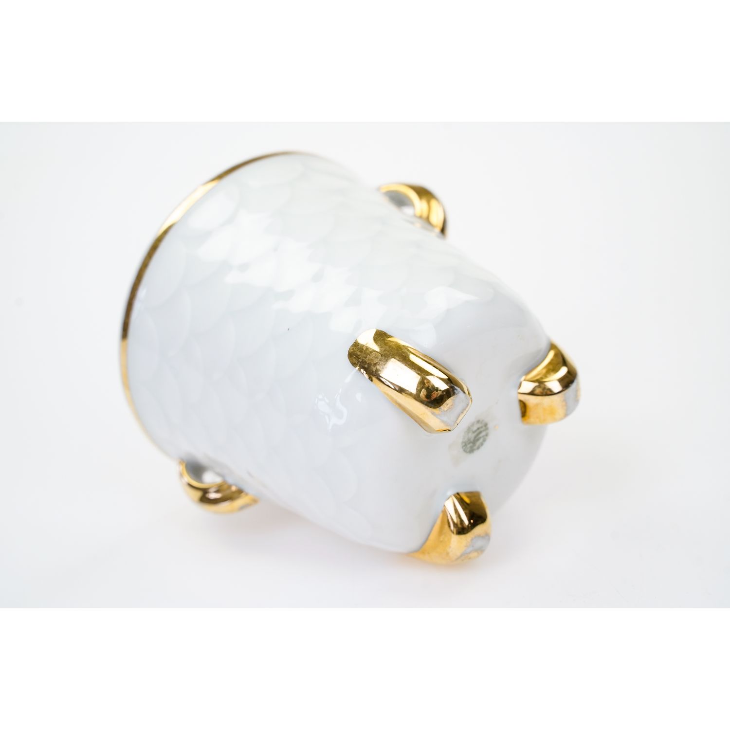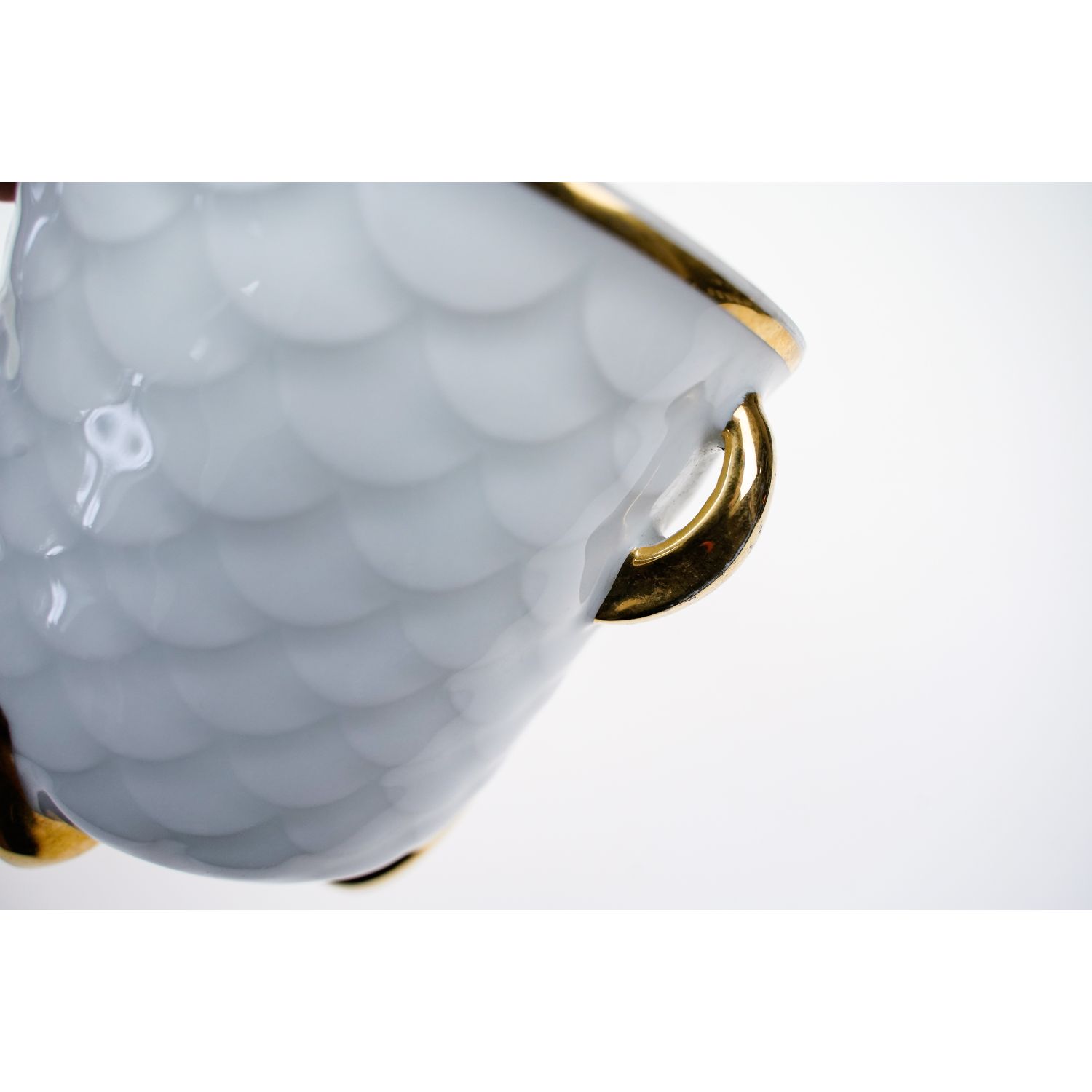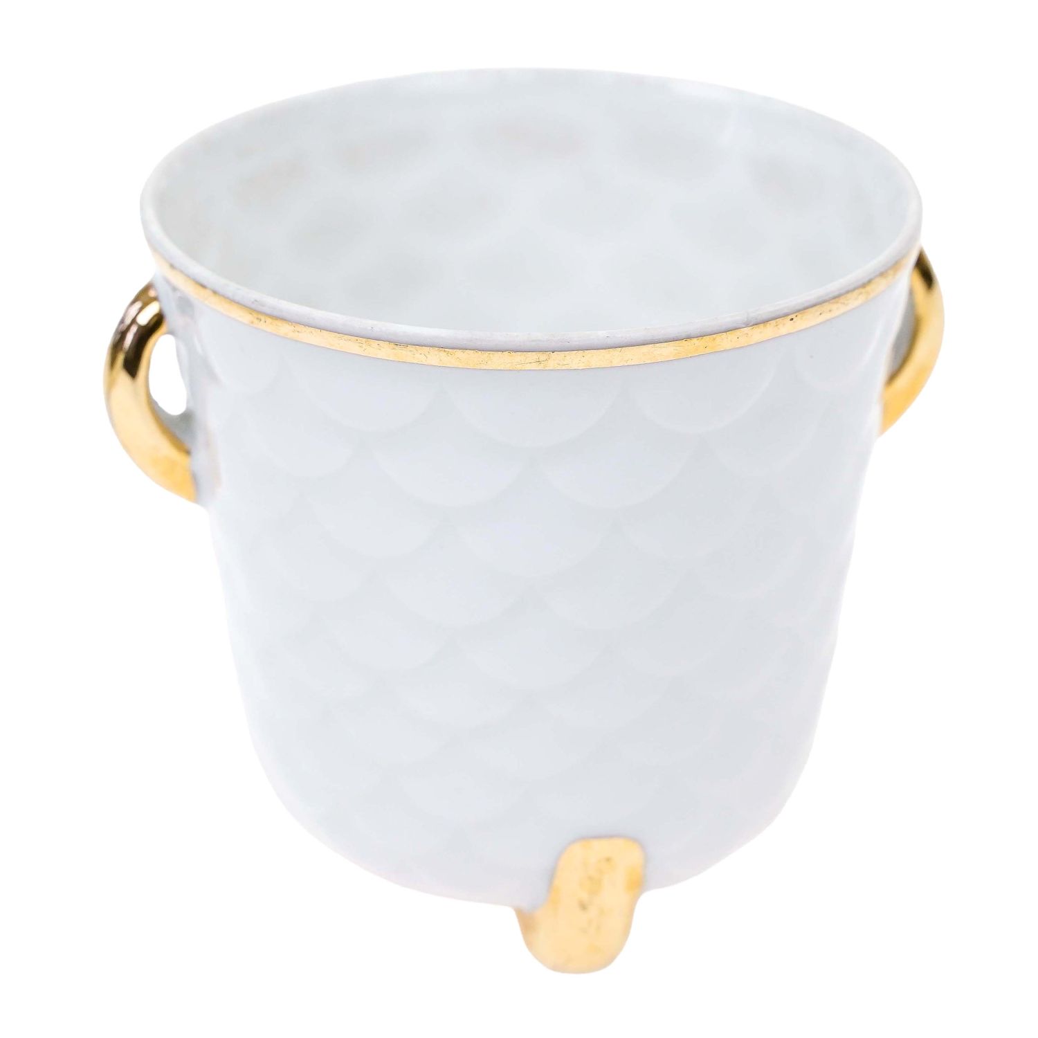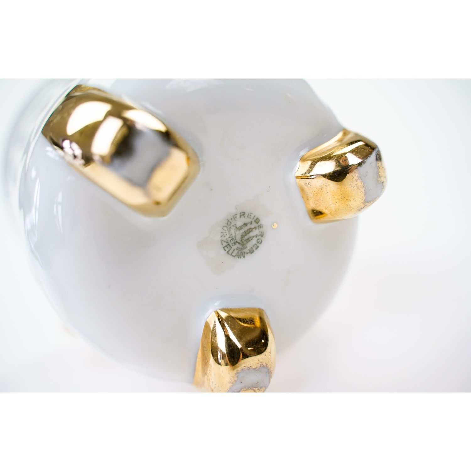 Pochodzi z miejscowości Freiberg z VEB Porzellanfabrik Freiberg. Sygnowana znakiem stosowanym od 1954 roku. Porcelana dość gruba w odcieniu bieli z reliefem w formie rybiej łuski na całej powierzchni. Z obu stron złote uszy pokryte grubym złoceniem. Całość osadzona na trzech nogach pokrytych złoceniami.