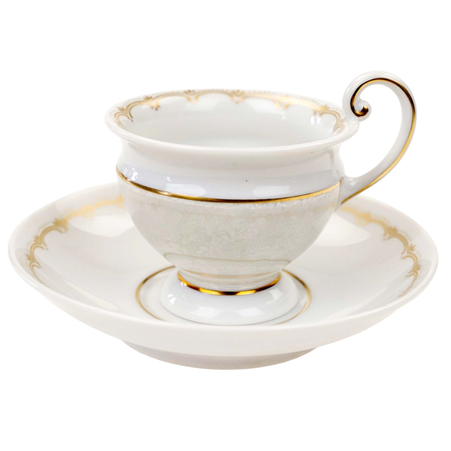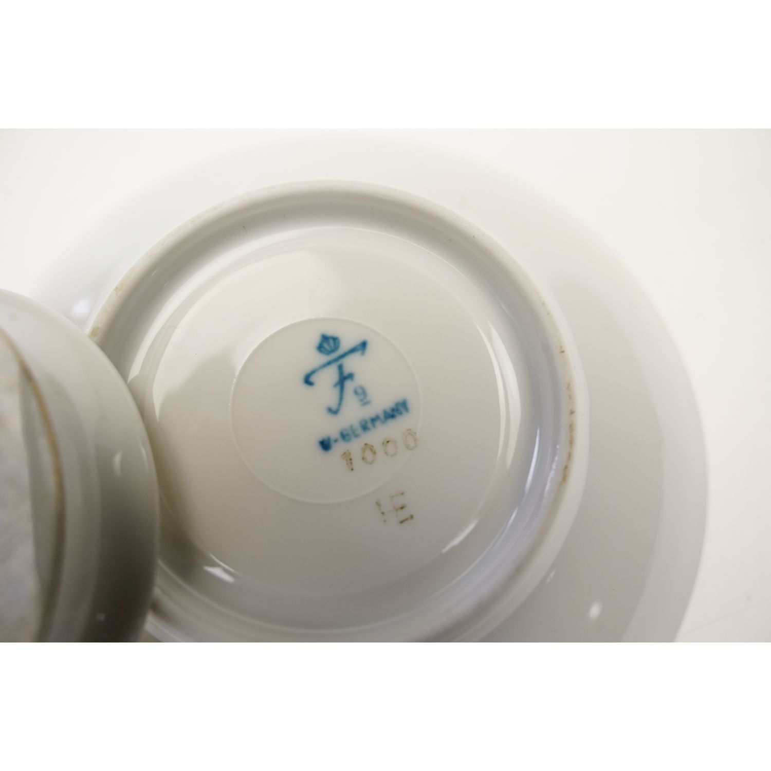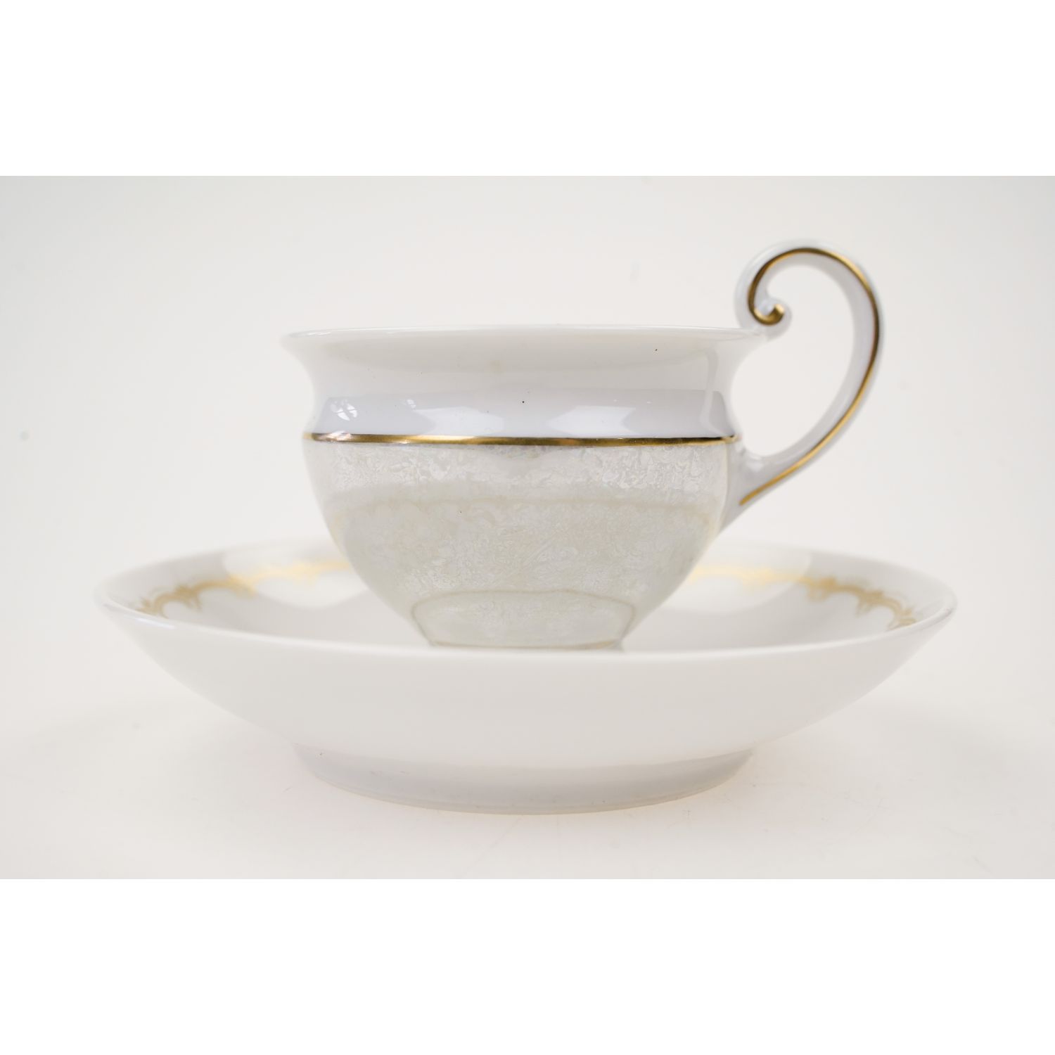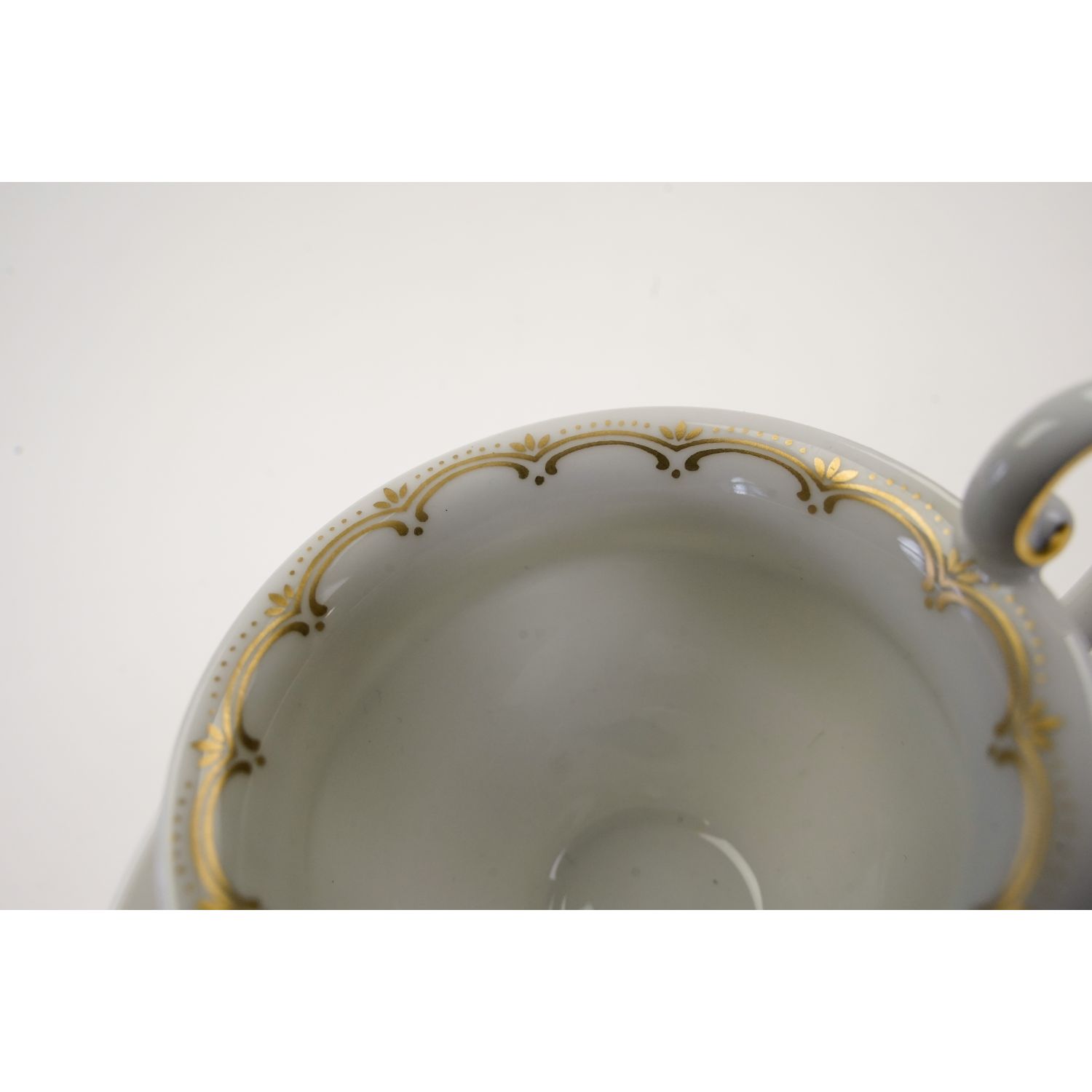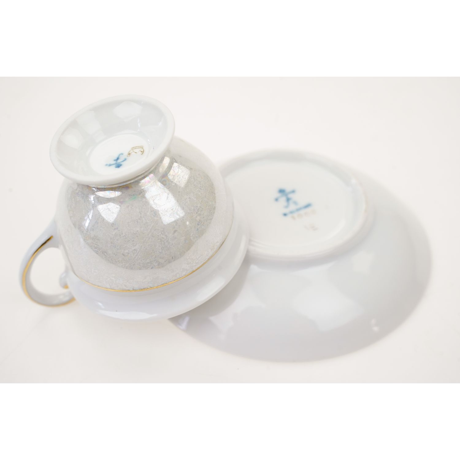 Pochodzi z wytwórni porcelany Fürstenberg z Brunszwiku. Sygnowana jak na zdjęciu. Filiżanka jest wykonana z porcelany w kolorze białym z pięknie wyprofilowanym uszkiem. Filiżanka osadzona na stópce z opalizowaną czaszą. Przy krawędziach złota konturówka i szlaczek złotych ornamentów.