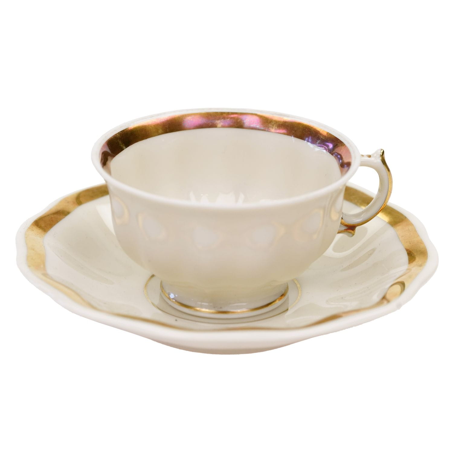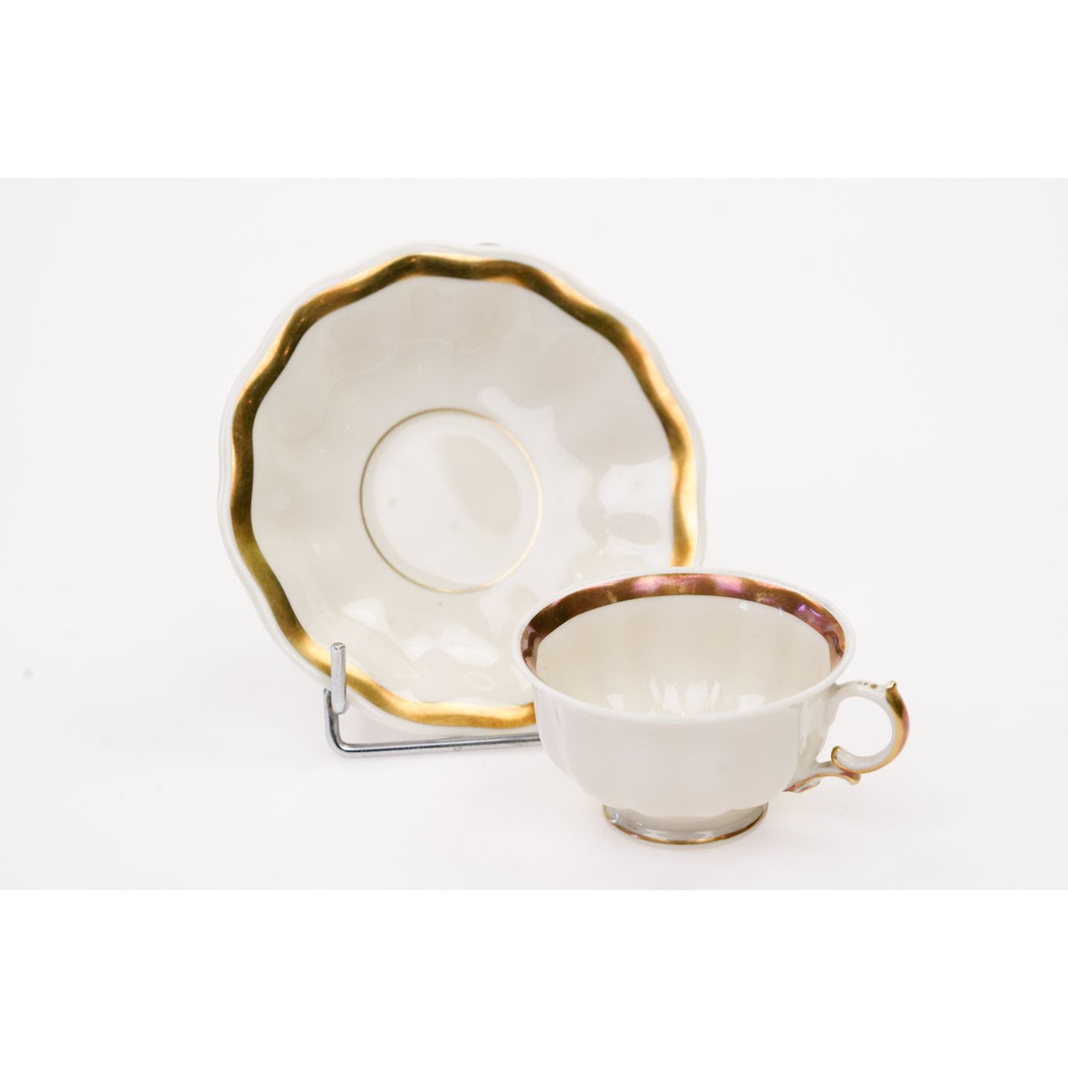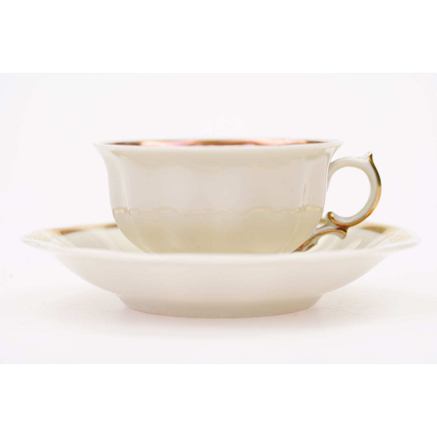 Urocza, mała filiżanka ze spodkiem w kolorze kości słoniowej.