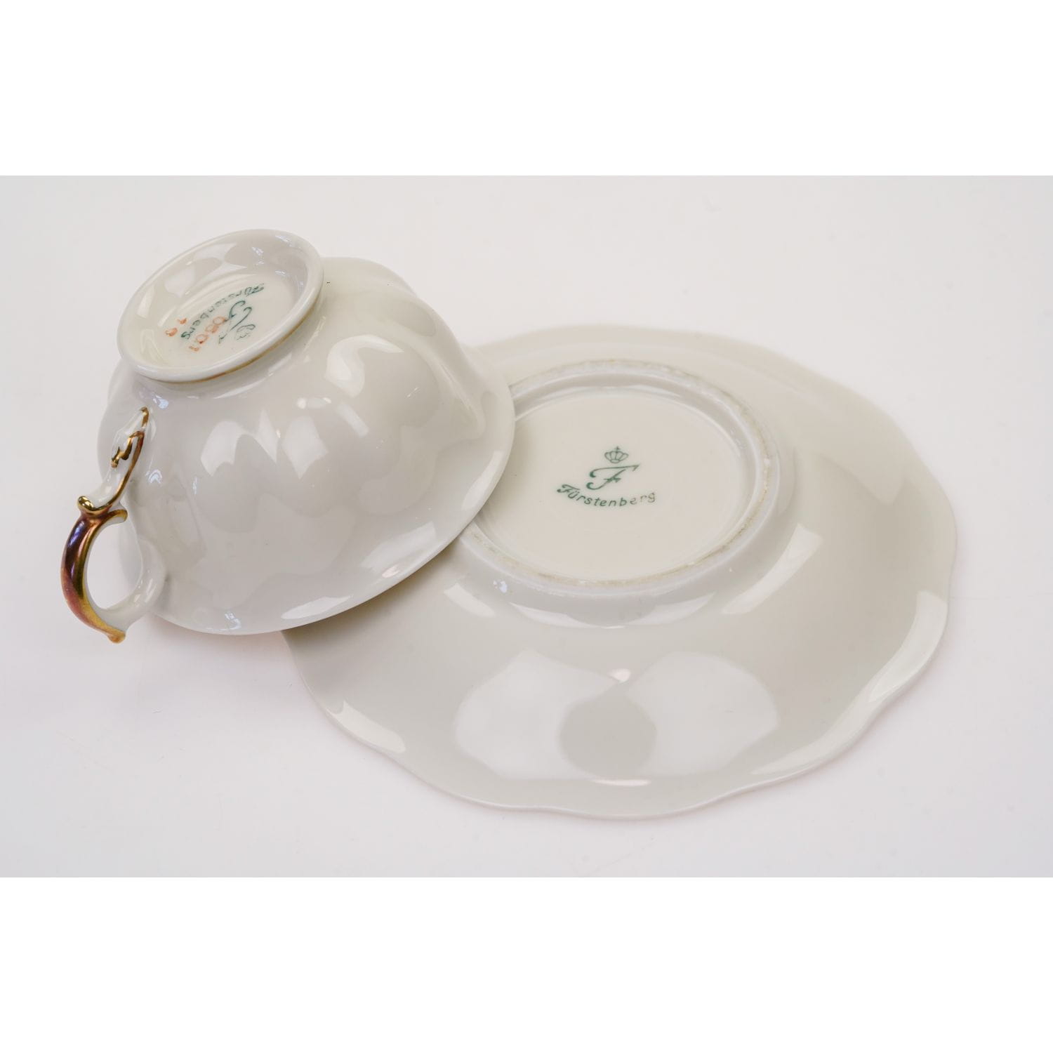 Przepiękna, stara porcelana o efektownej stylowej formie pochodząca z renomowanej fabryki Fürstenberg'a, ok.1918 rok. Model Brunsviga. Zestaw jest sygnowany podszkliwnie oraz numerowany. Porcelana w kolorze kości słoniowej ze złoconymi rantami i uszkiem.