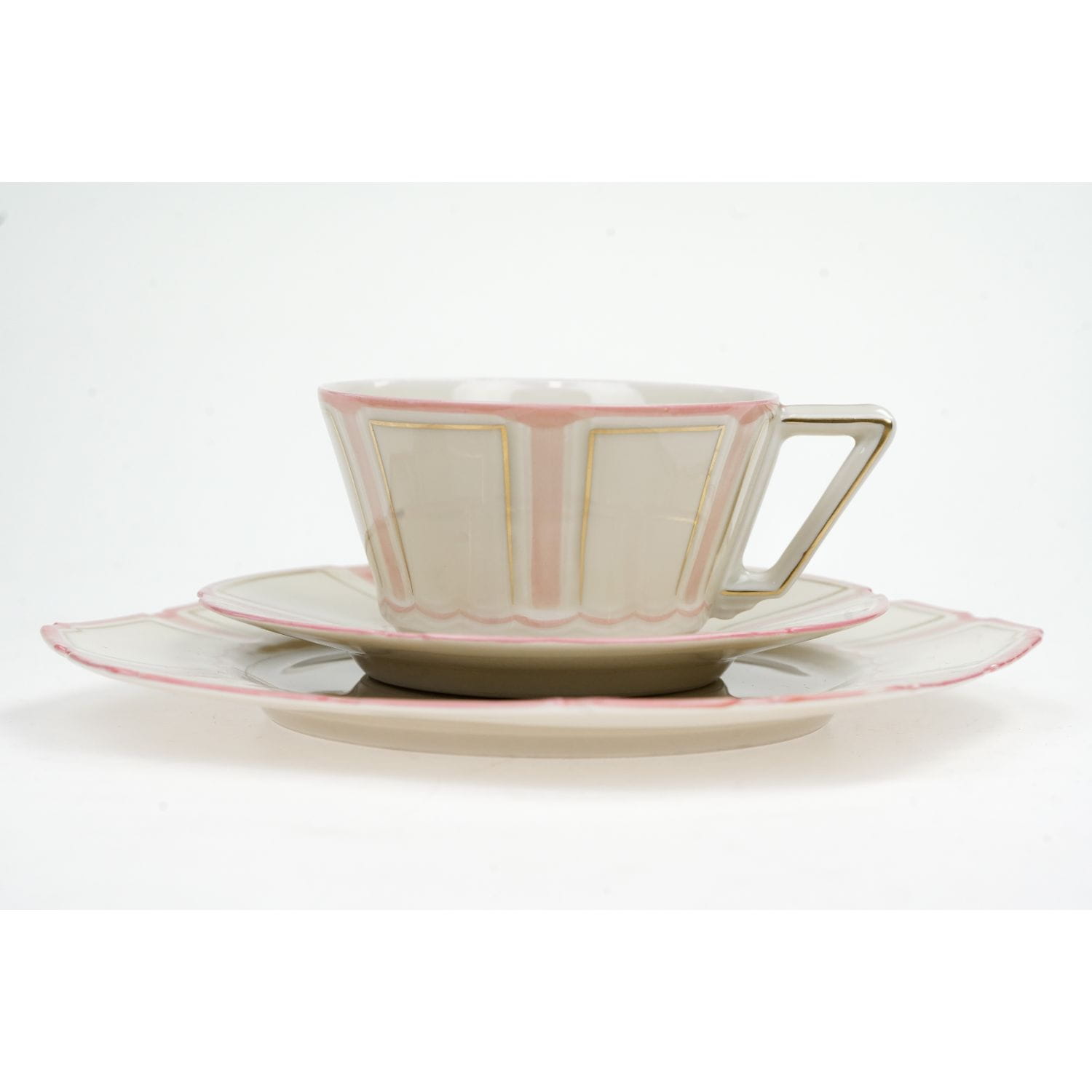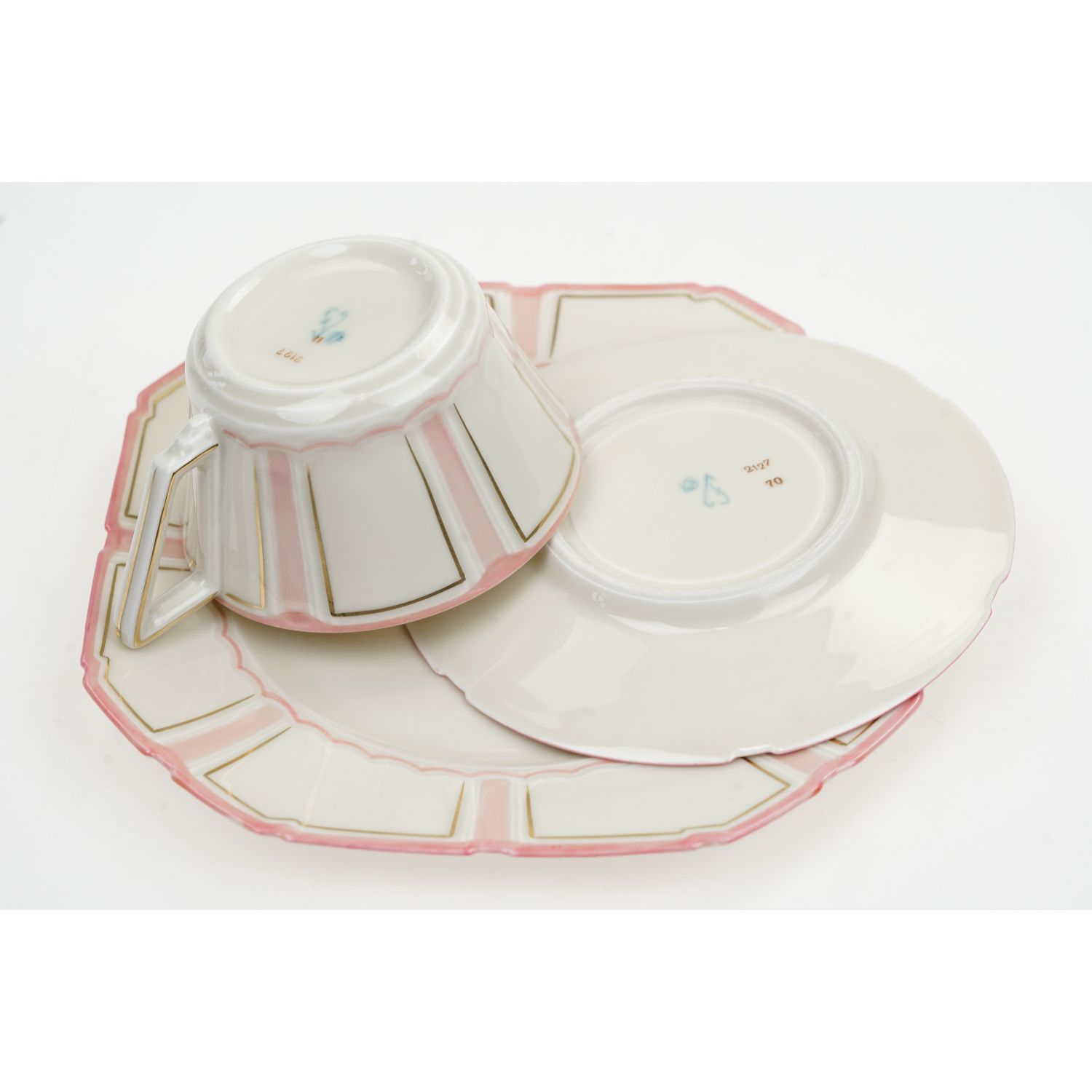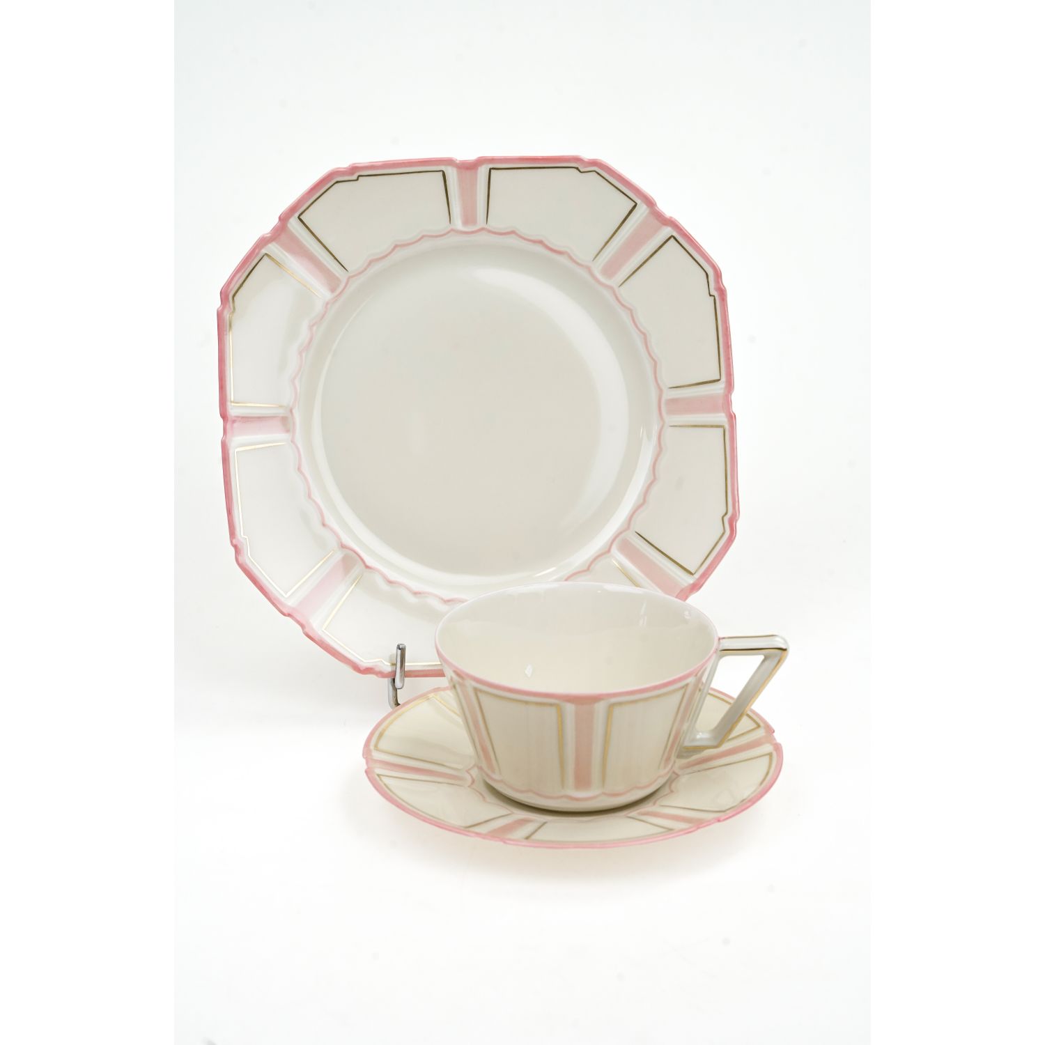 Pochodzi z Brunszwiku z Fürstenberg. Śliczna porcelana, delikatna, wysokogatunkowa w kolorze kości słoniowej o graniastych kształtach. Wszystkie elementy mają prostą formę z równie prostymi różowymi dekoracjami. Dekorowane jedynie węższymi pasami złoceń.