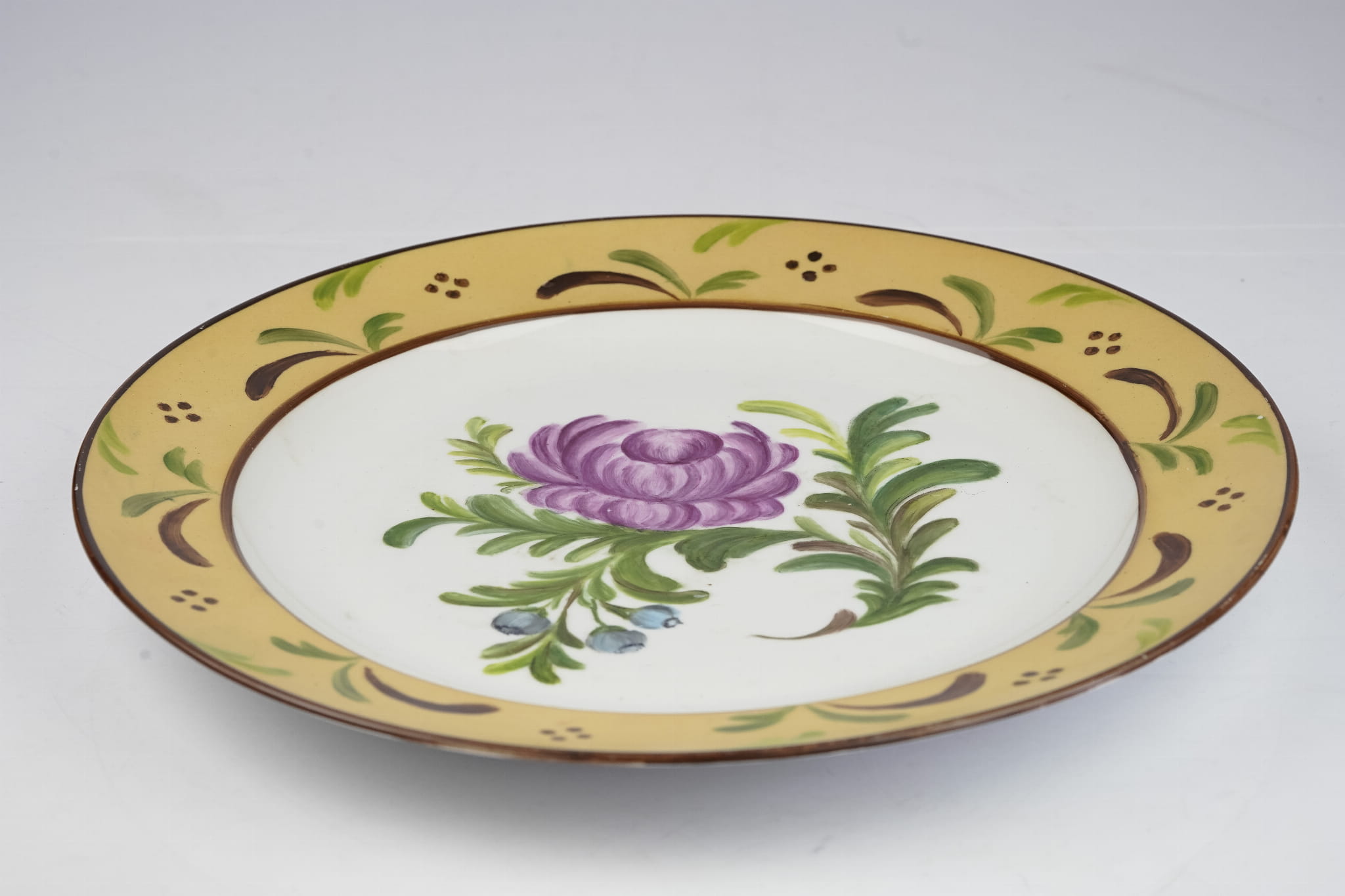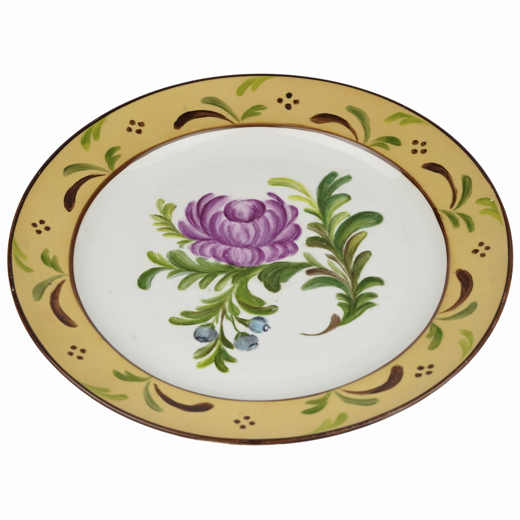 Pochodzi z wytwórni porcelany z Fürstenberg z Brunszwiku. Obok znaku wytwórni odręczny podpis dekoratora i data. Porcelana biała, szkliwiona. W całości ręcznie malowana. Kołnierz w musztardowej malaturze z brązowymi i zielonymi wzorami i brązową obwódką na kołnierzu. Na lustrze ładny bukiet z piwonią i jagodami.