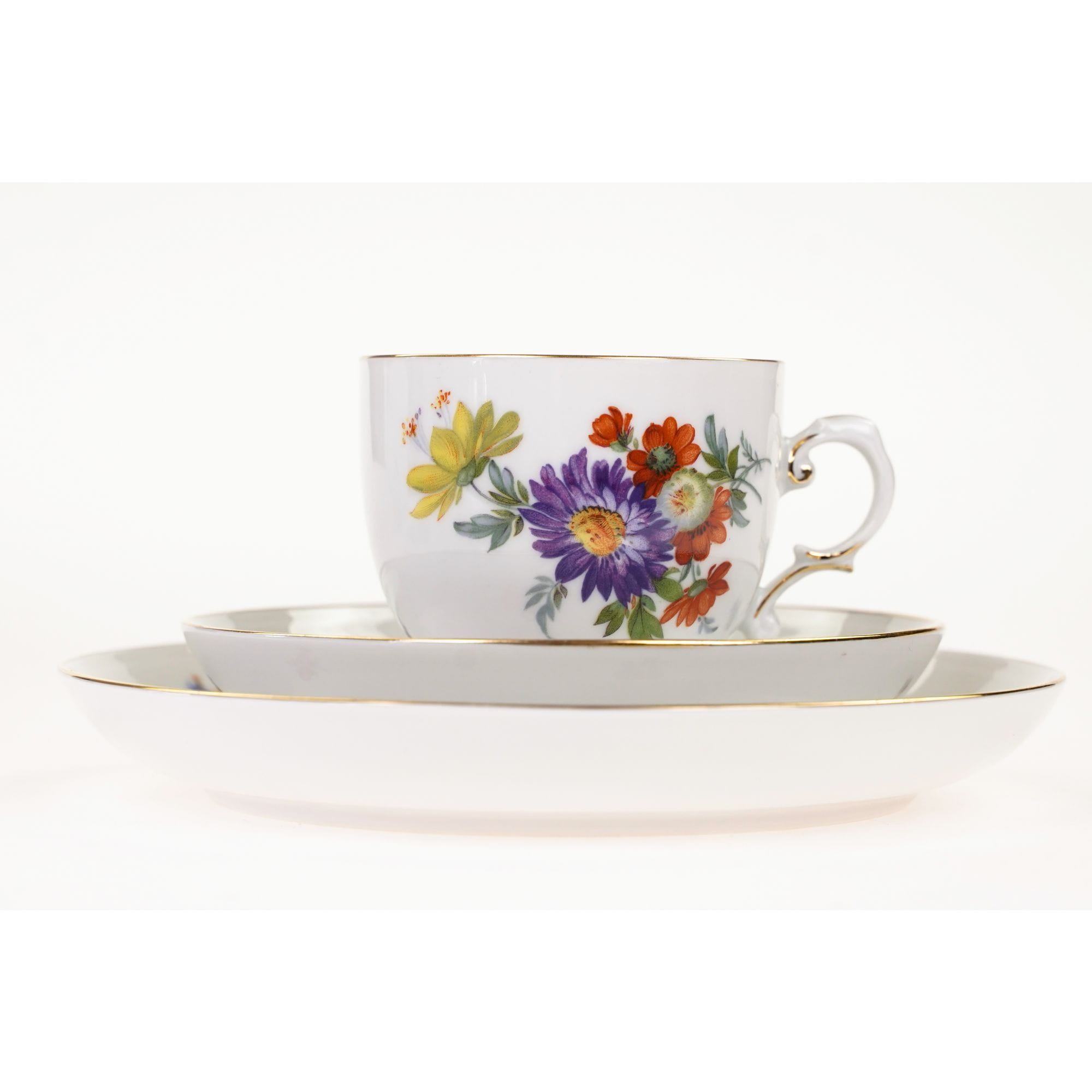 Zestaw prezentuje się wyśmienicie i jest zachowany w bardzo dobrym stanie. Dostępnych jest 5 komplecików, ale rozłożenie, układ kwiatków na poszczególnych filiżankach i talerzach deserowych się różni. Dekoracje są w tej samej stylistyce.