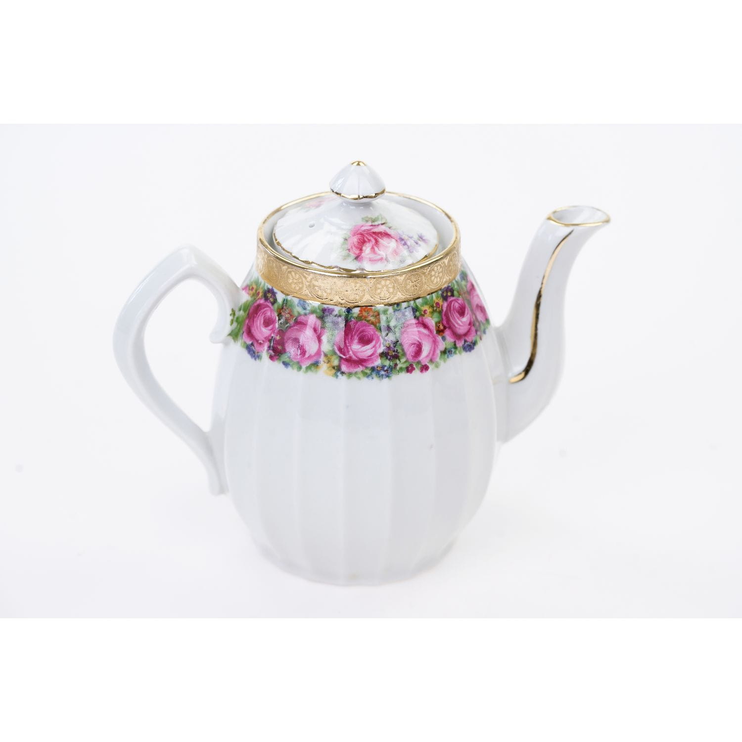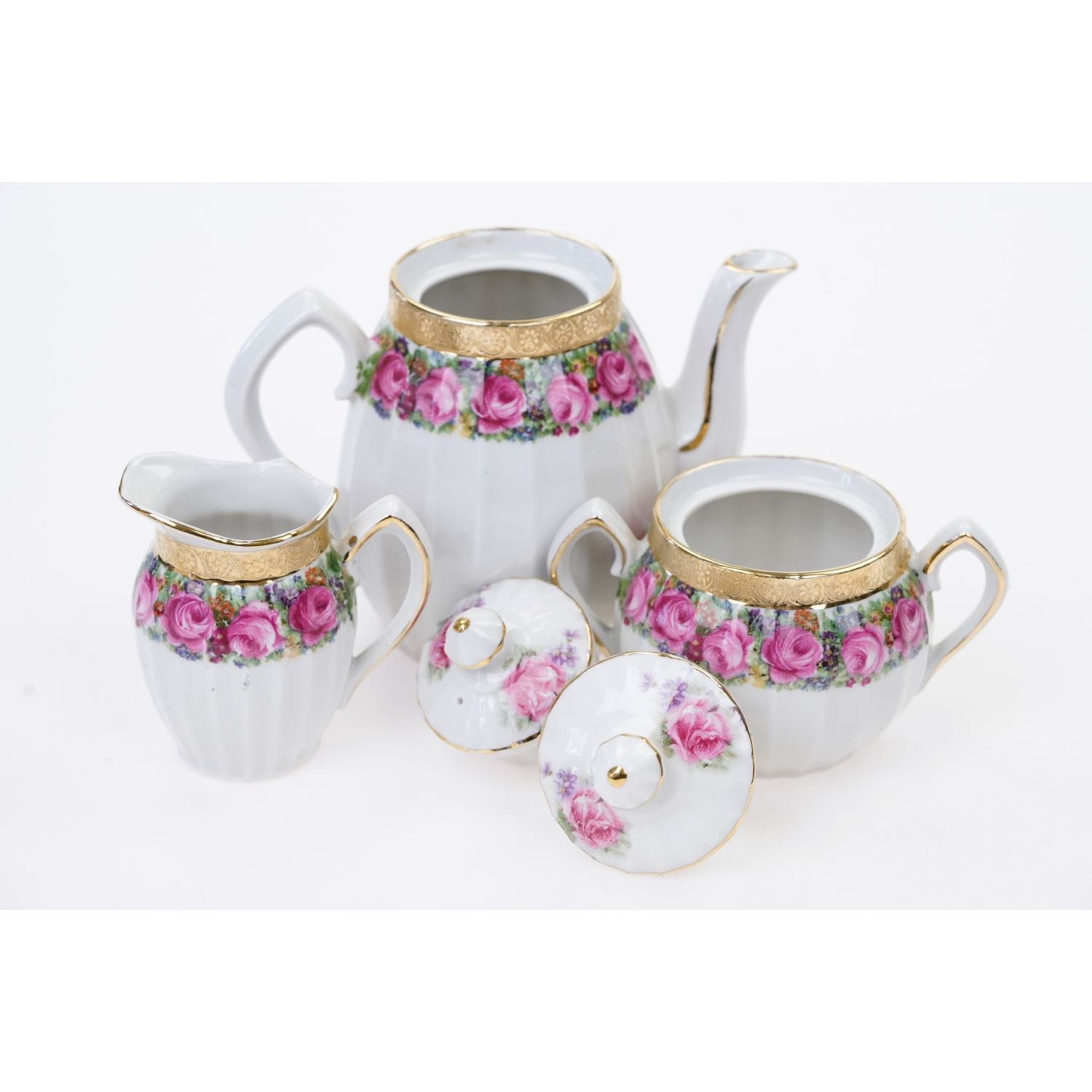 Absolutnie śliczny garnitur do mokki z trawionym złoceniem składający się z dzbanka, mlecznika i cukierniczki.