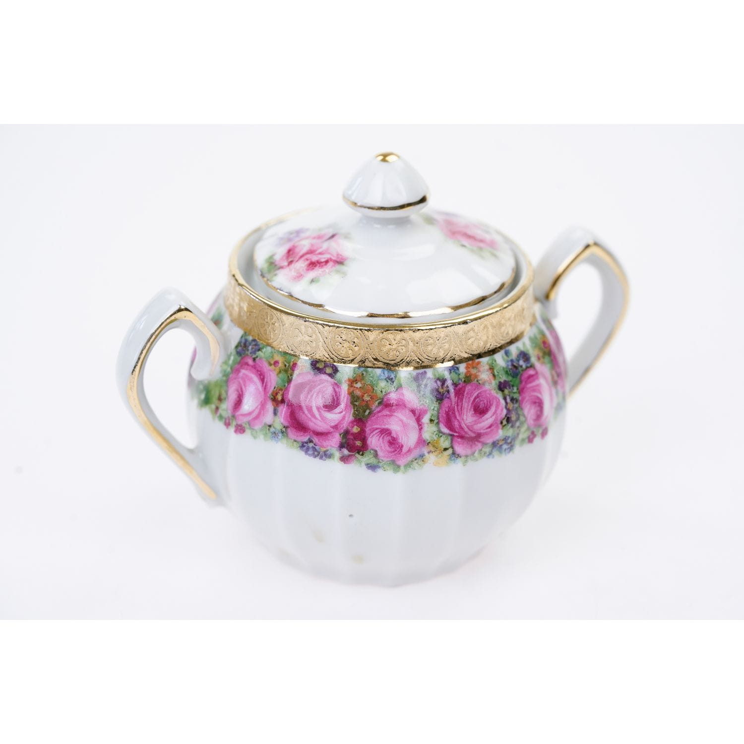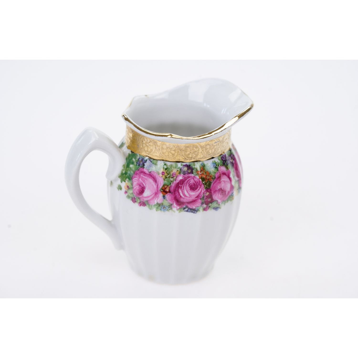 Sygnowany jedynie numerycznie. Jest wykonany z żebrowanej porcelany w kolorze białym. Z gustownym szlaczkiem trawionego złocenia z kwiatowym wzorem. Pod nim dość szeroka kwiatowa bordiura z większymi kwiatami róż. Kontury w złoceniu.
