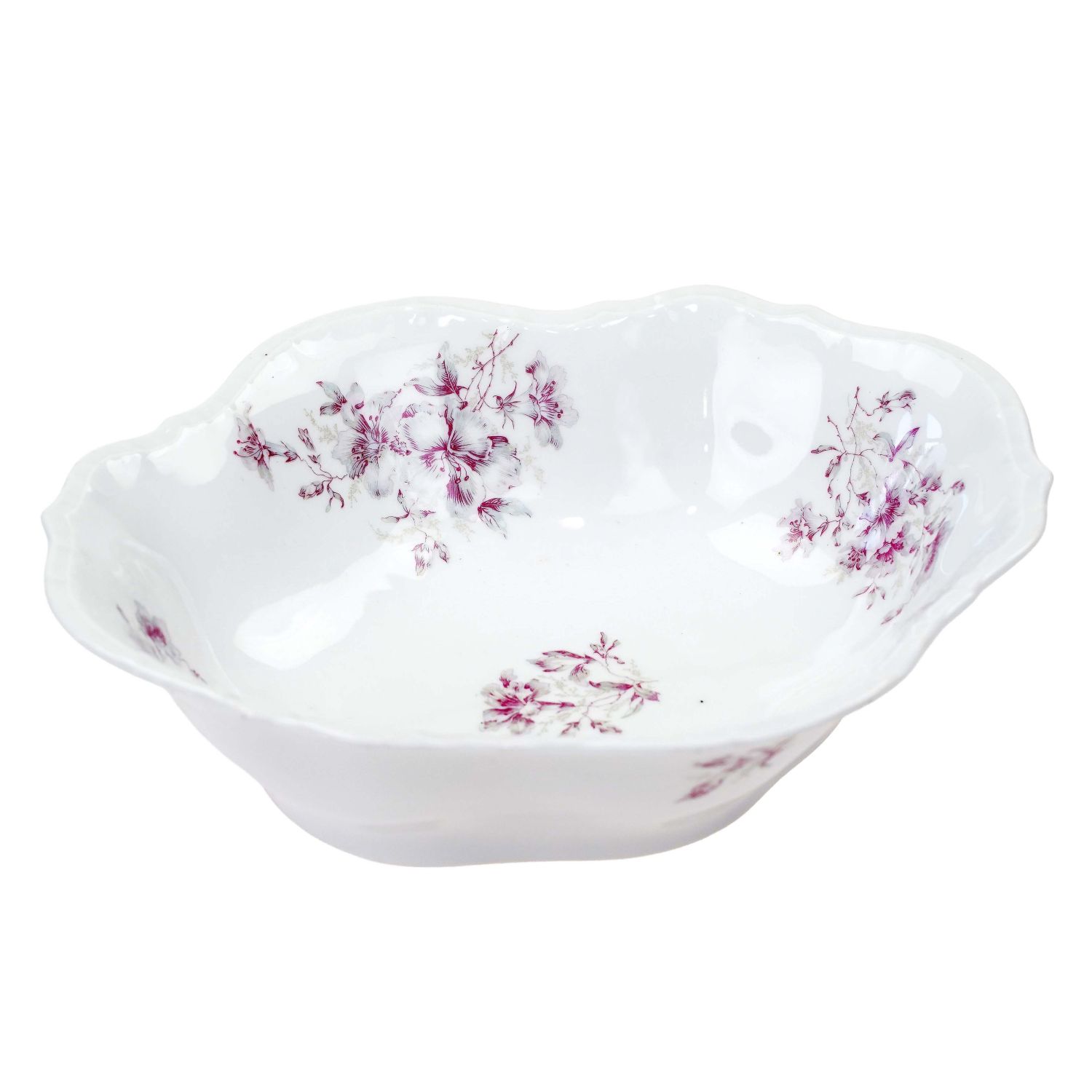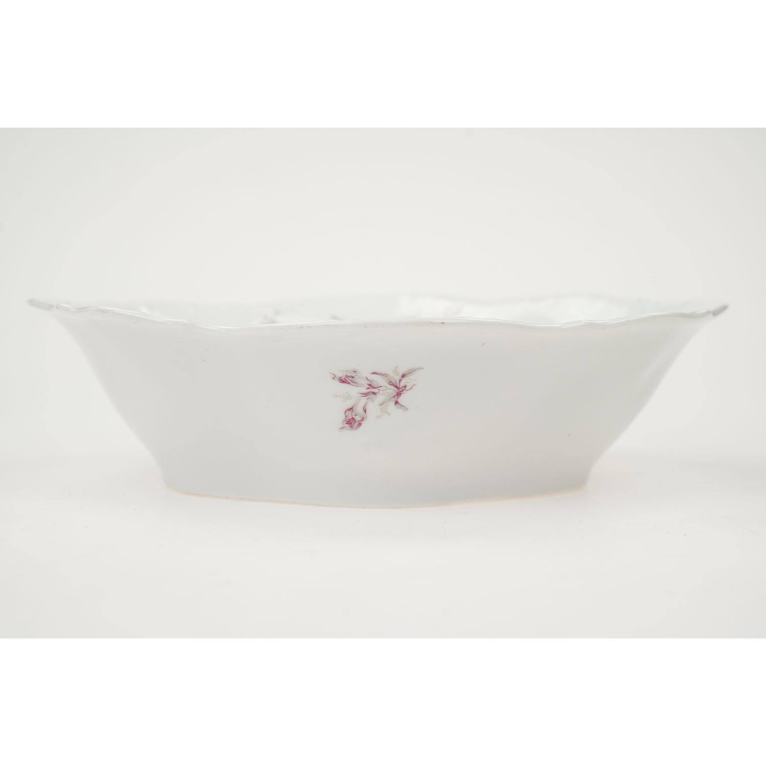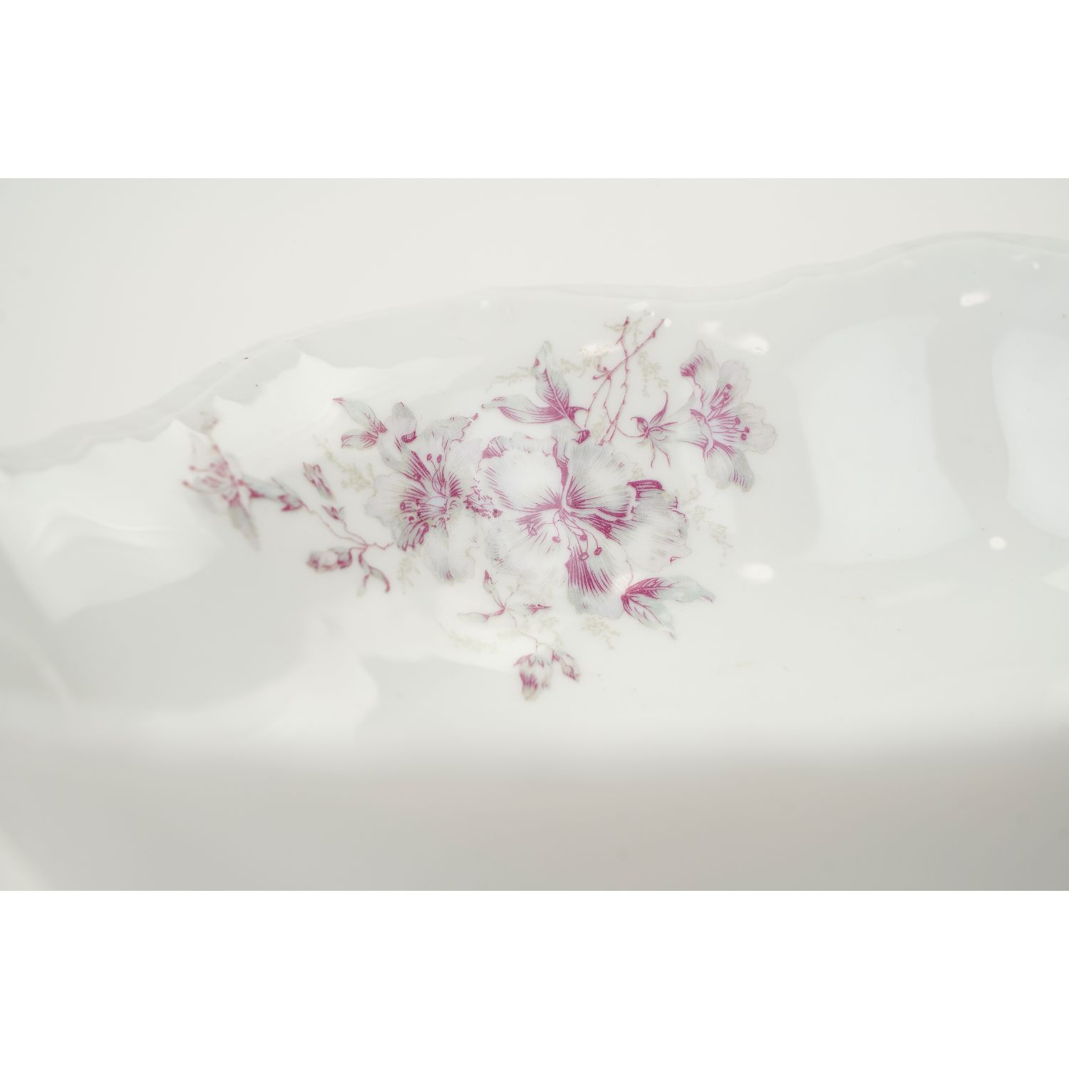 Antyczna porcelana w odcieniu bieli, reliefowana. Na niej fioletowo-szare kwiaty.