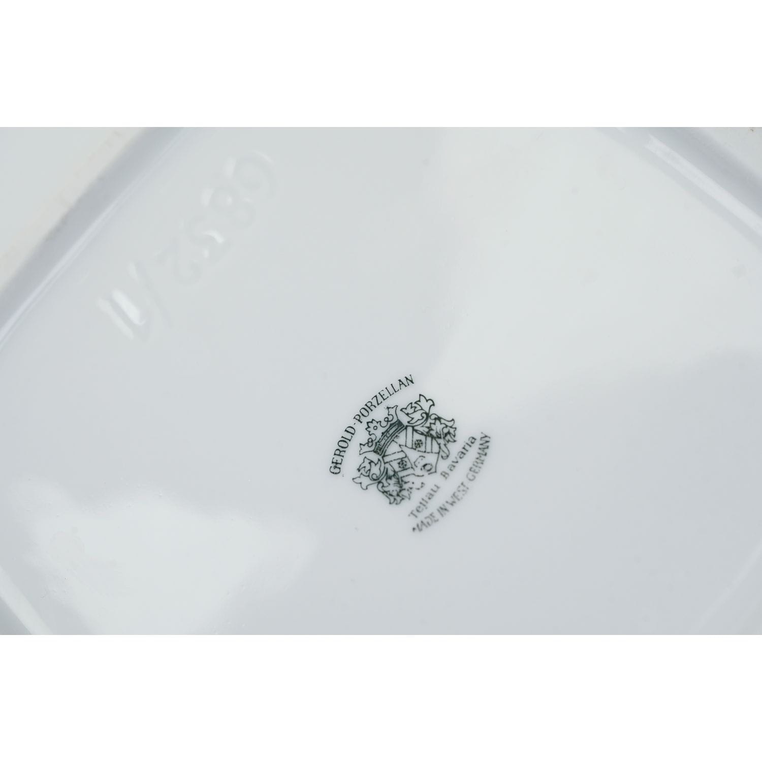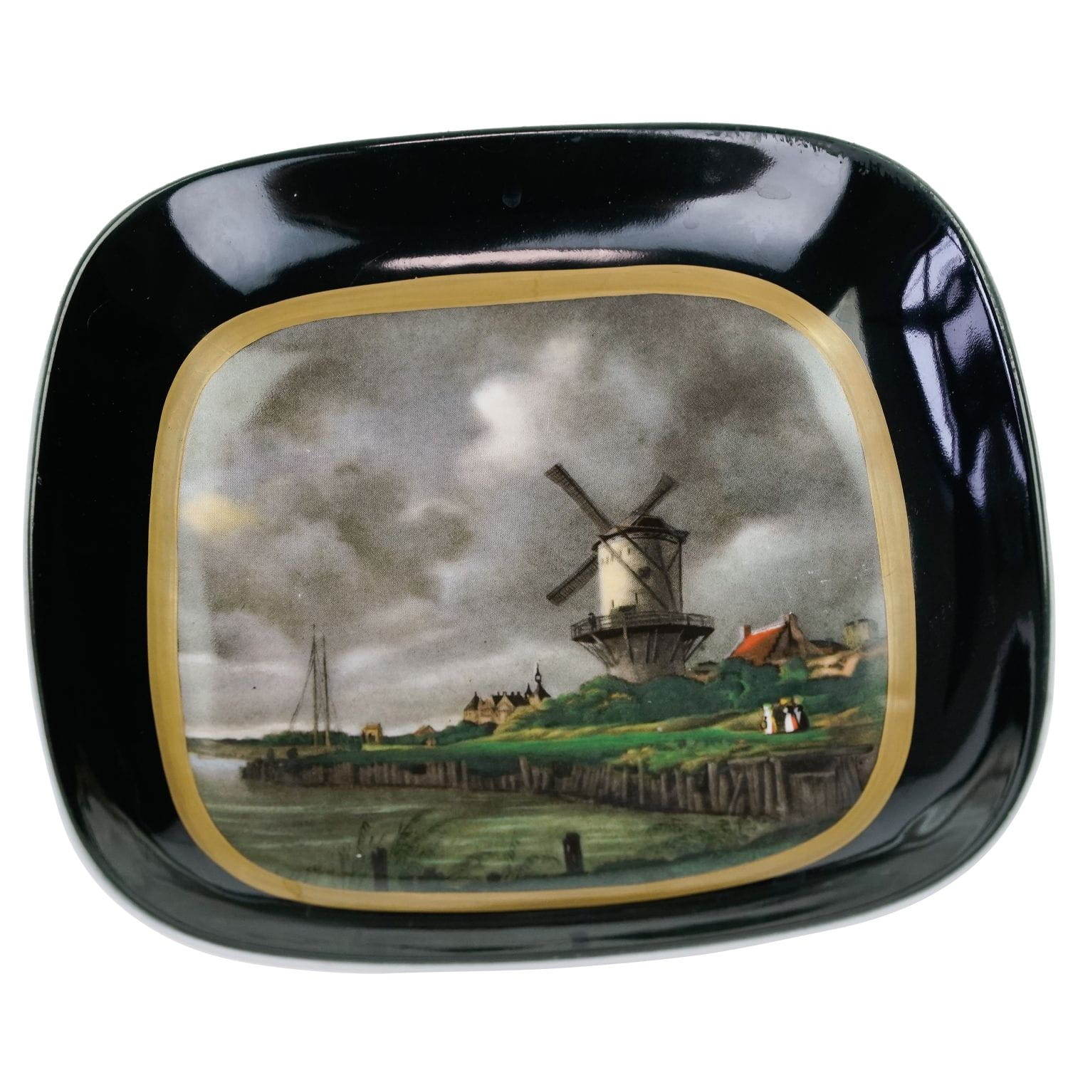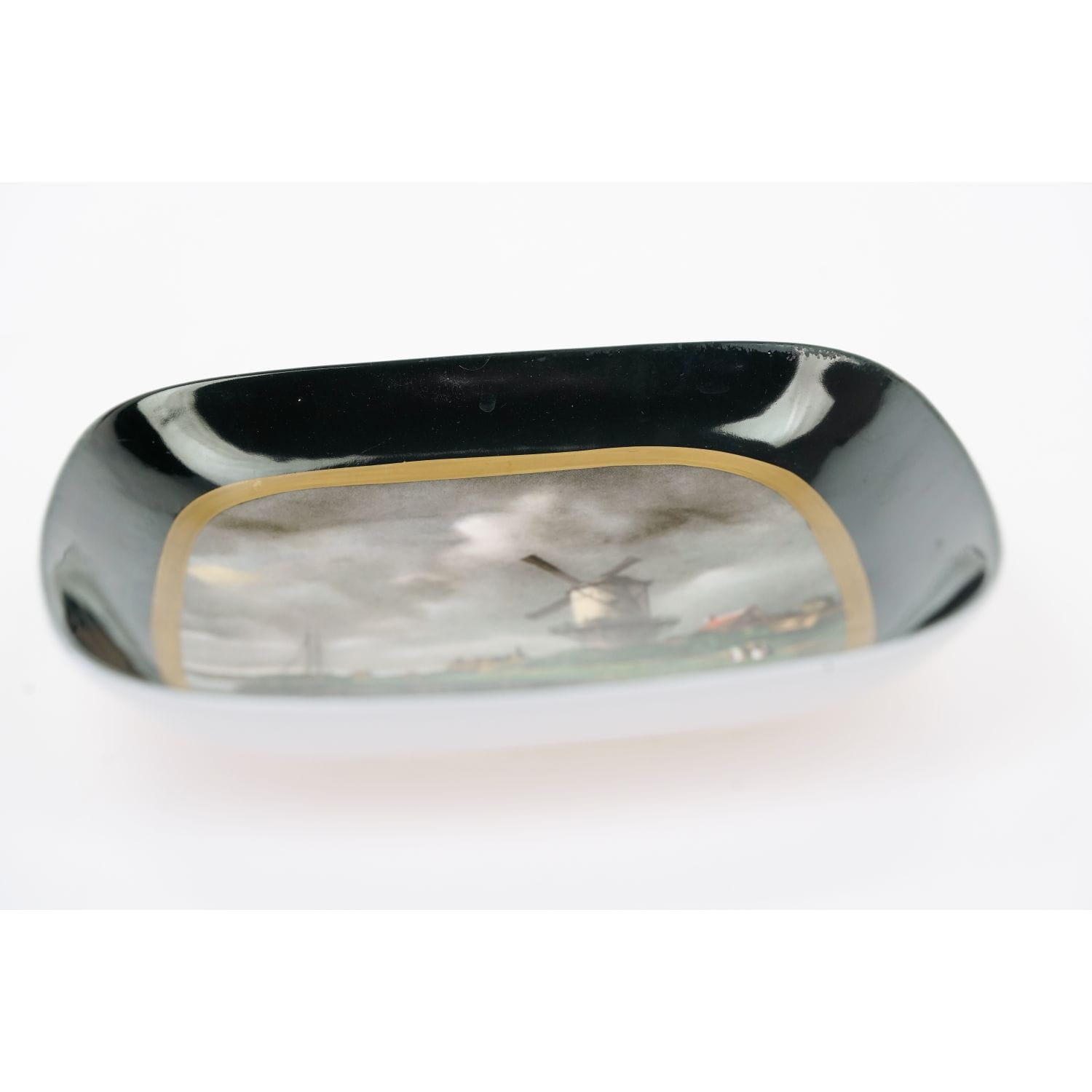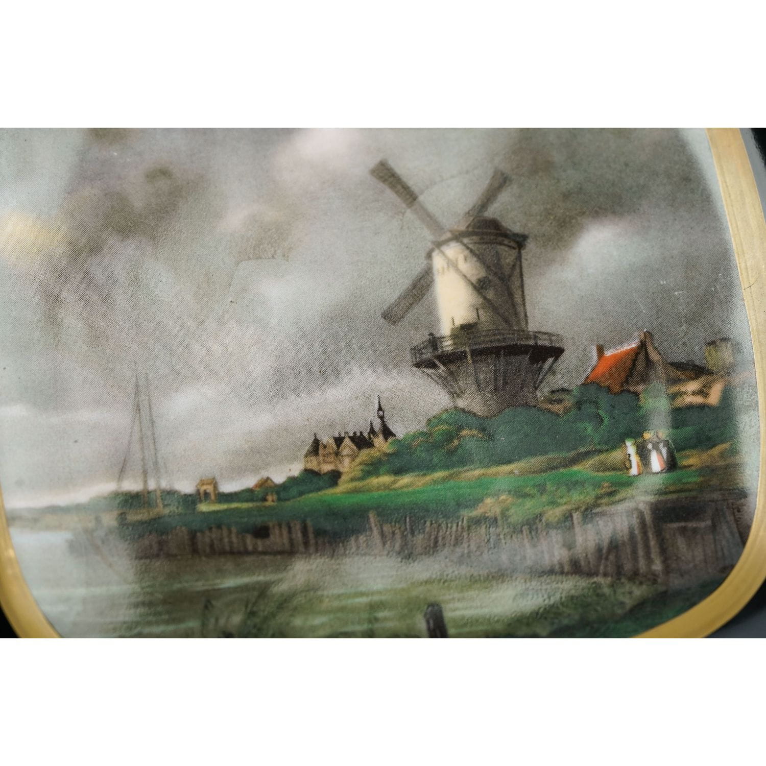 Pochodzi z Niemiec: Porzellanfabrik Tettau Gerold & Co, sygnowany znakiem stosowanym przed 1949 rokiem. Na lustrze pejzaż z wiatrakiem w roli głównej. Kołnierz w czerni ze złotą opaską.