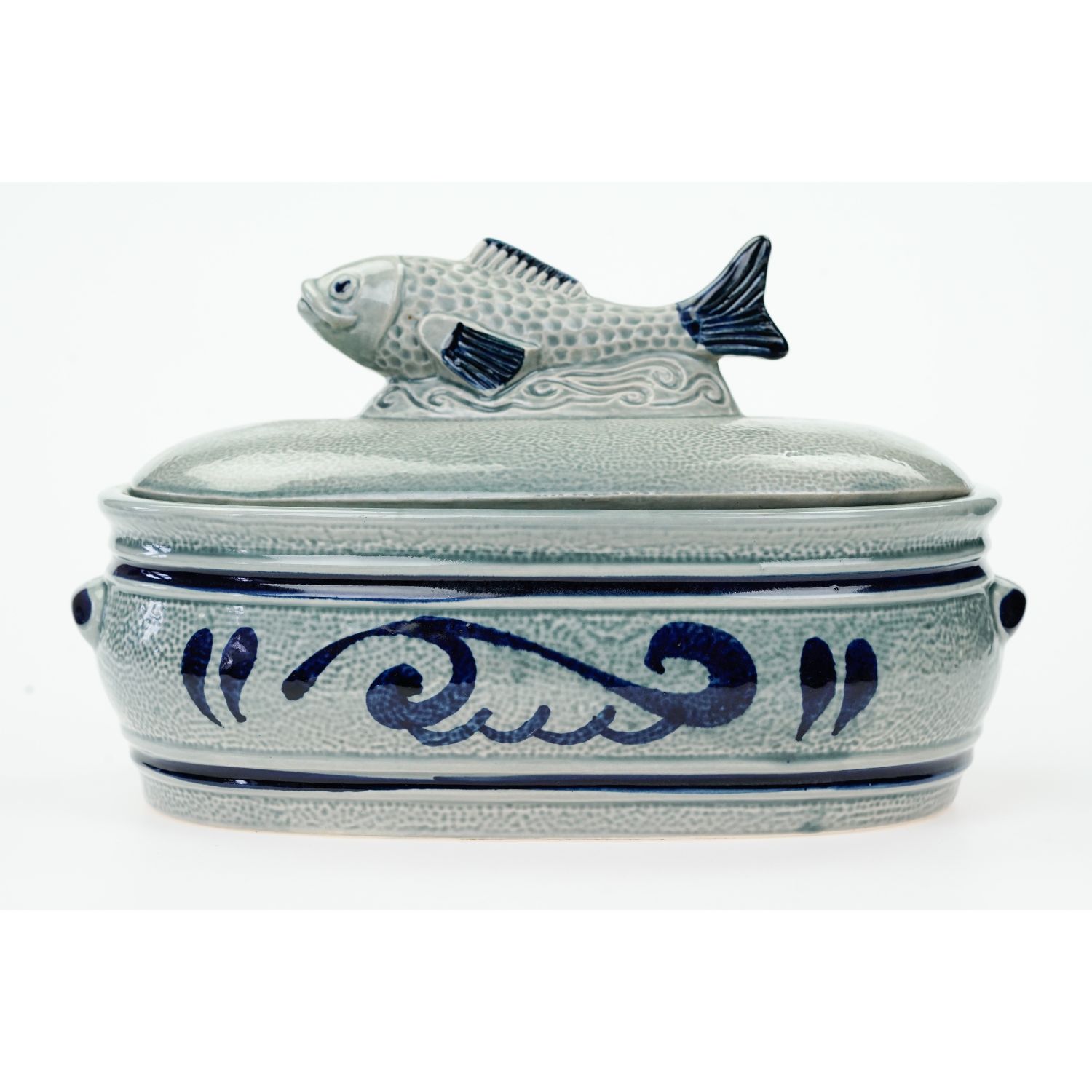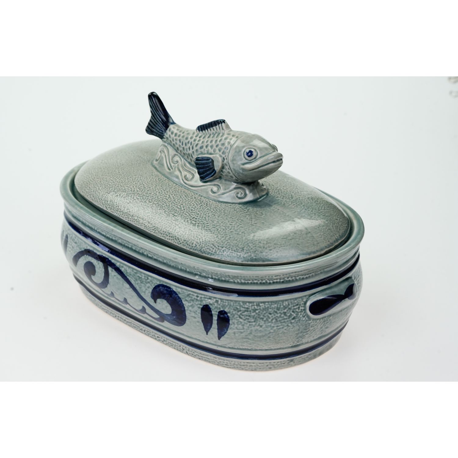 Wykonany z ceramiki barwionej na szaro, ręcznie dekorowany kobaltem. Uchwyt pokrywy i uszy w kobalcie. Na dłuższych ściankach roślinne wzory. Uchwyt pokrywy w kształcie plastycznej rybki. Służyć może nie tylko do przechowywania rybnych przysmaków lecz również do serwowania ich na stół.