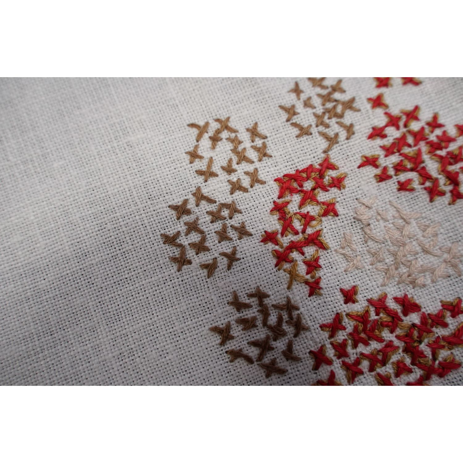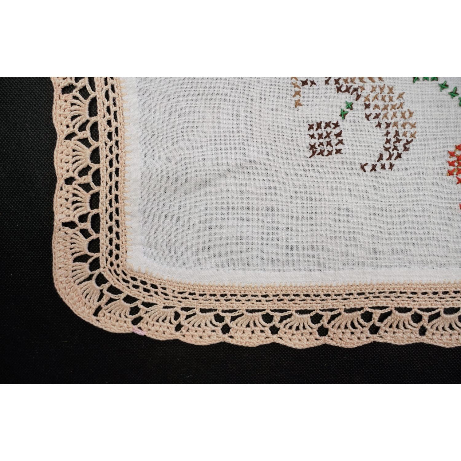 Wykonana z białej, delikatnej, bawełnianej tkaniny. Na niej wykonane ręcznie haftem krzyżykowym kolorowe kwiaty. Dookoła wykończony szydełkową koronką w łososiowym kolorze.