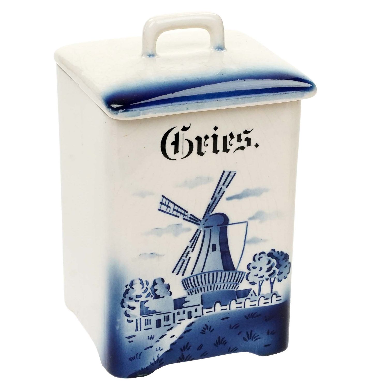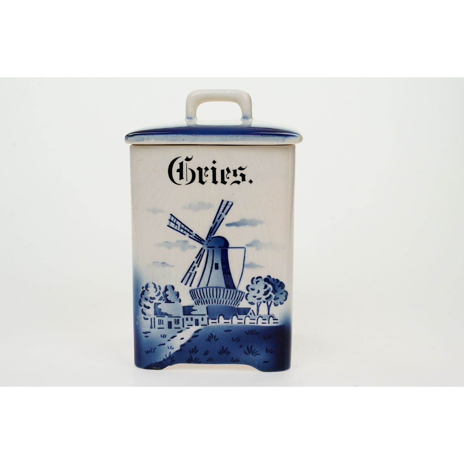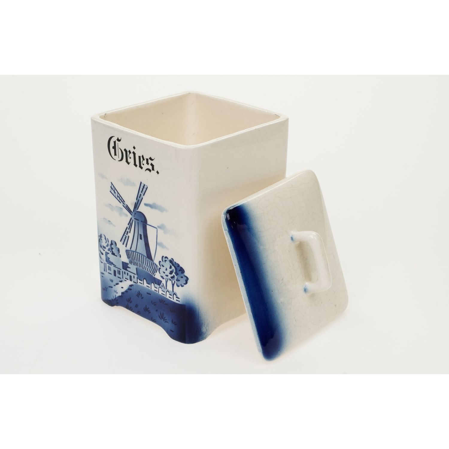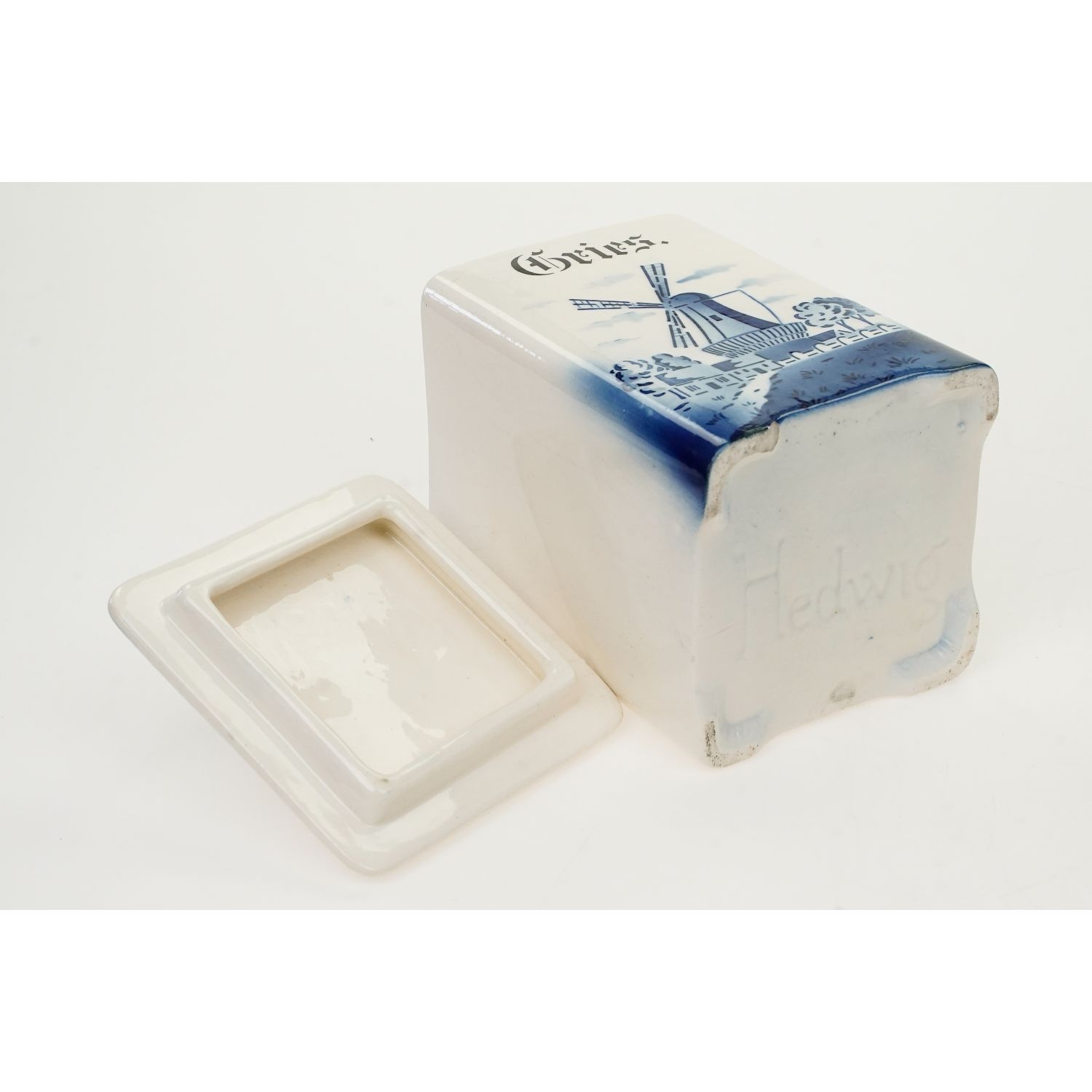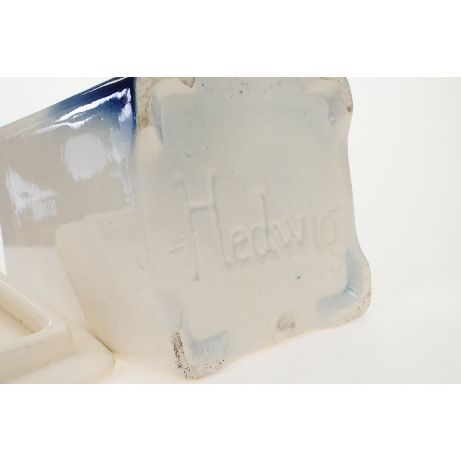 Pochodzi z Niemiec. Od spodu tłoczony napis Hedwig. Całość w odcieniu złamanej bieli. Z jednej strony zdobiony pejzażem z wiatrakiem naniesionym metodą natryskową za pomocą szablonu. Całość w niebieskich odcieniach. Nad krajobrazem napis w języku niemieckim "Gries" (grysik).