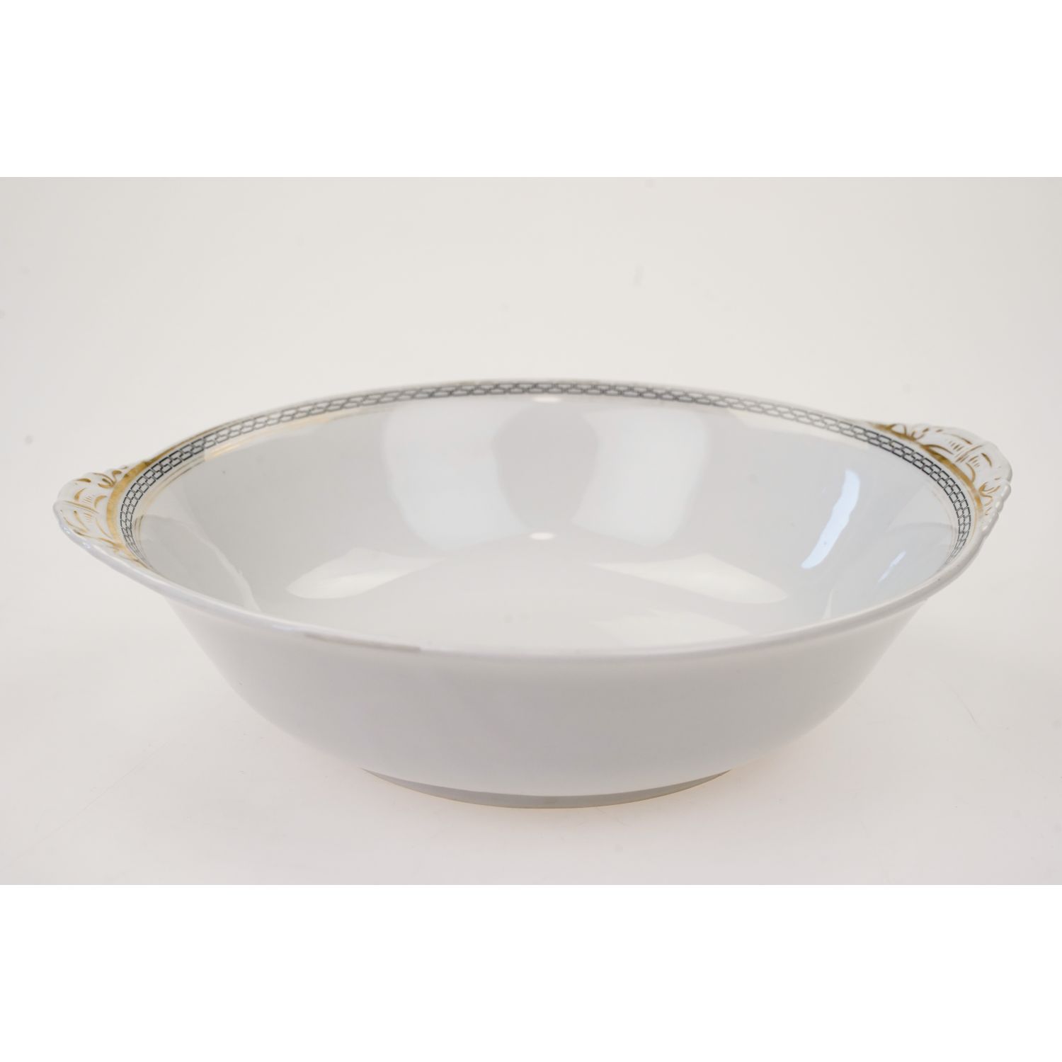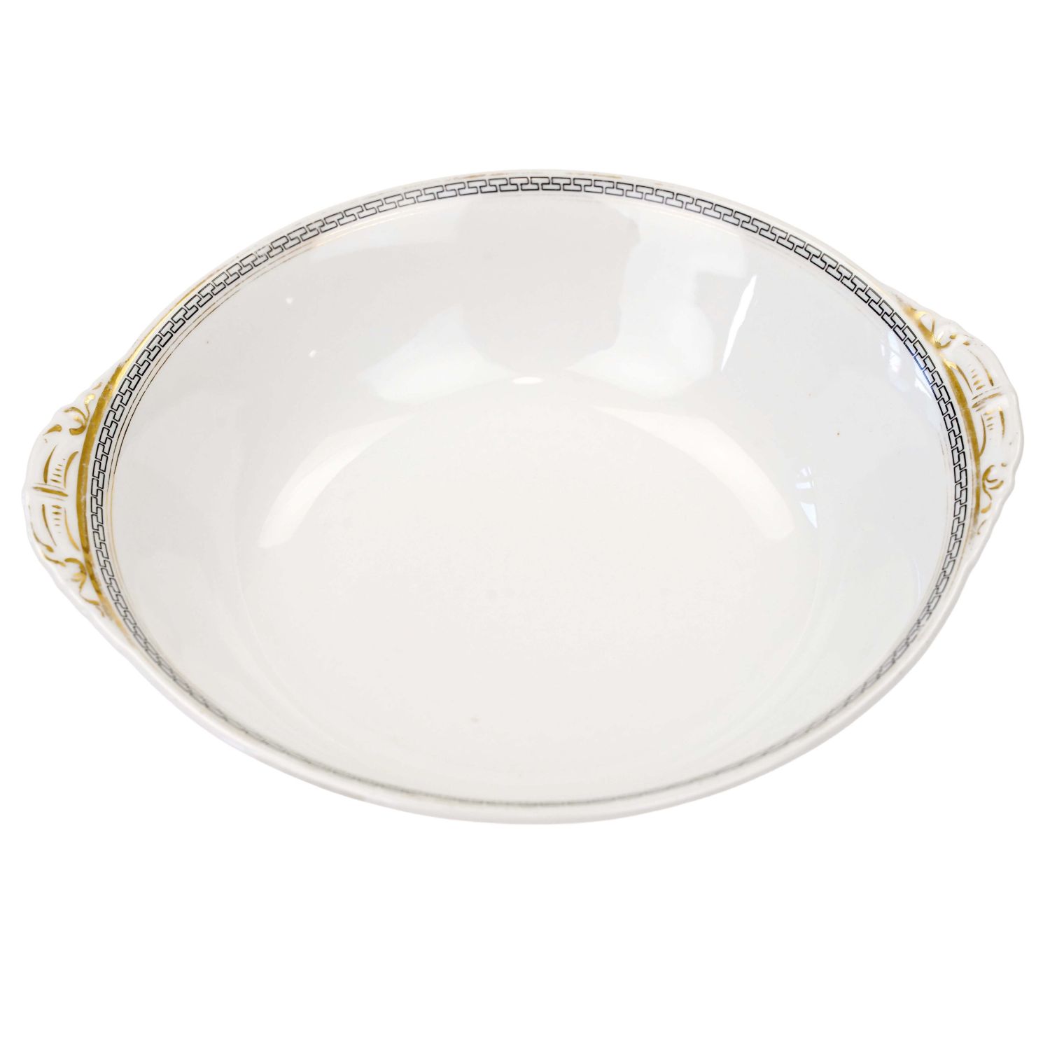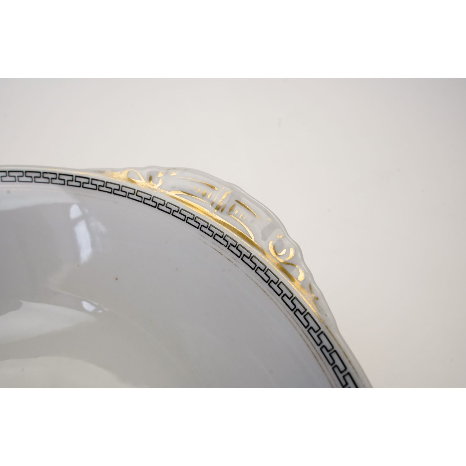 Misa wykonana jest z porcelany w odcieniu białym o dość prostej formie. Przy krawędzi czarny wzór w meandry i złocenia.